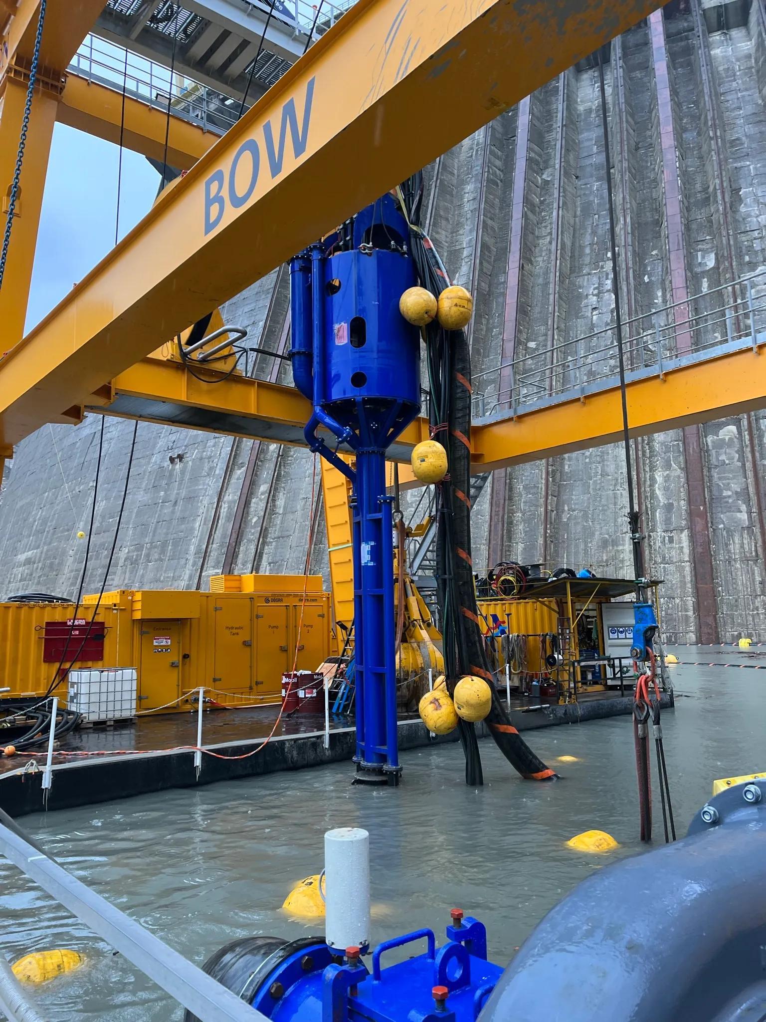 For the Eguri Hydropower dredge project DCN Diving created a dedicated floating structure. The main purpose of the floating structure was to facilitate the dredging activities; the grab action for removing large debris always being secondary. This large working platform handled the DOP350 submersible dredge pump which was brought in to tackle the sedimentation, plus its power supply, booster pump station and all required auxiliaries and drives. The DOP submersible dredge pump is powered by a electric-hydraulic power pack located on the platform.