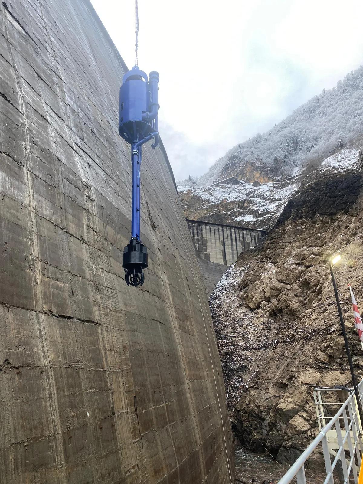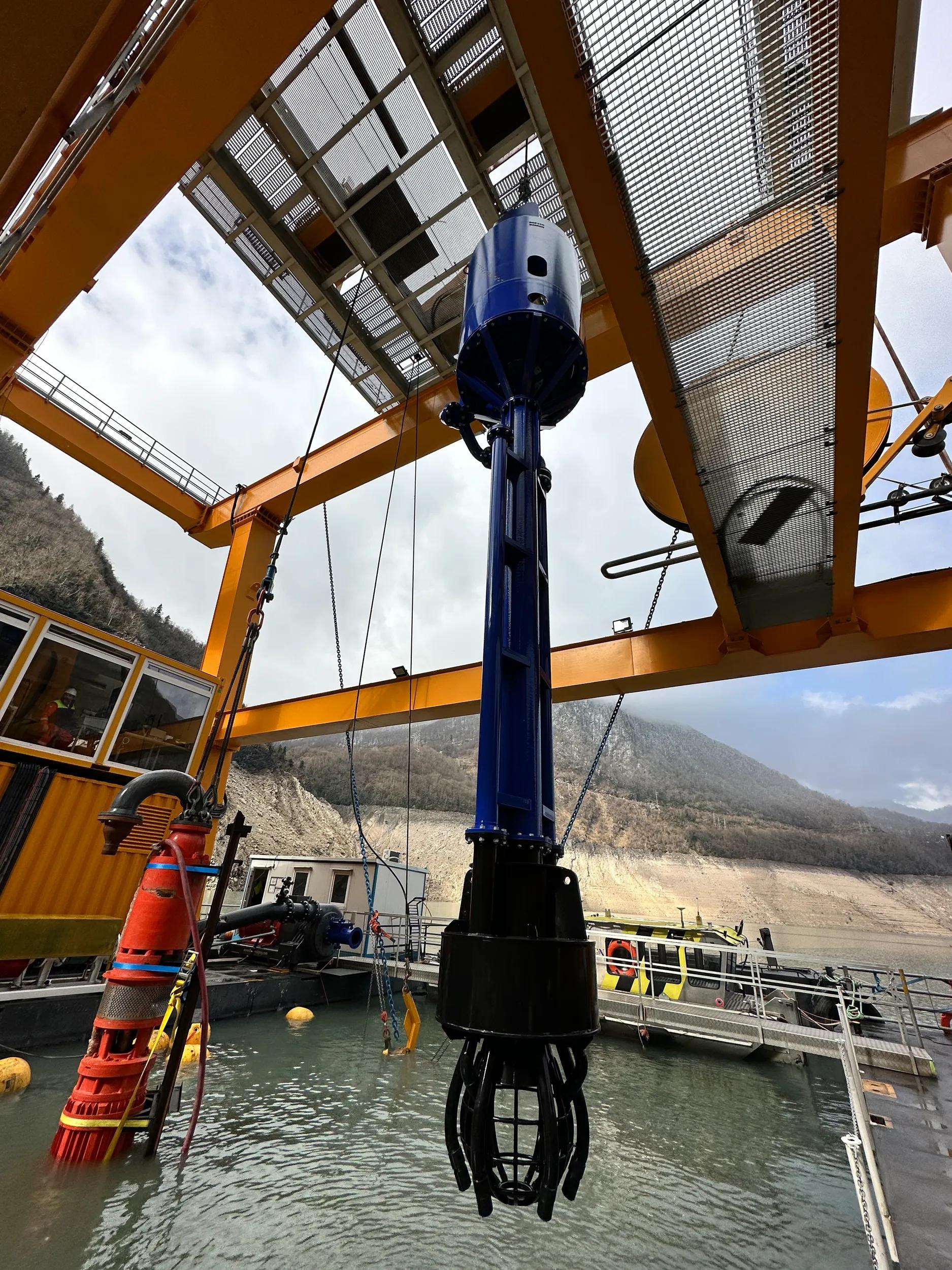 The main challenge of the dredge job was – and is – the dredging depth. Having started at -150 m, it is now working at an incredible dredging depth of -170 m [the final dredging depth being -190 m]. For this, the standard DOP dredge pump was fitted out with pressure compensation on the bearing housing. Moreover, the suction pipe has been lengthened, and the pressurised jet water to the mining head has been adapted to the large amounts of debris expected. The DOP350 has removed 125,000 m3 of sludge up to now, pumping the sediment from the bottom outlet gates to the reservoir’s surface and then leaving the reservoir through the intake channels of the turbines. In spite of the remarkable dredging depth, the DOP pump performs perfectly and the reservoir gradually regains its ‘dead storage volume’- a necessity in any hydropower plant.