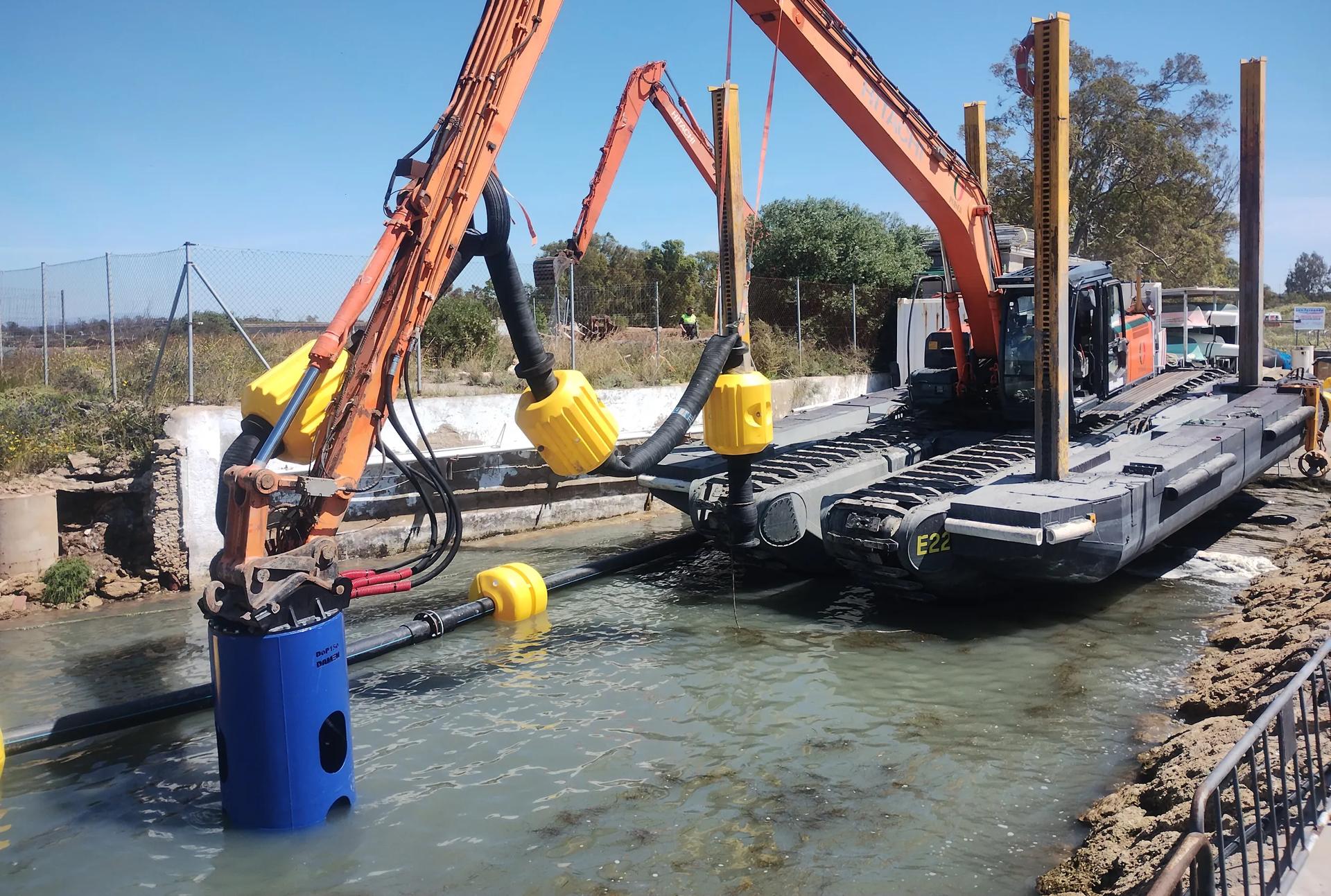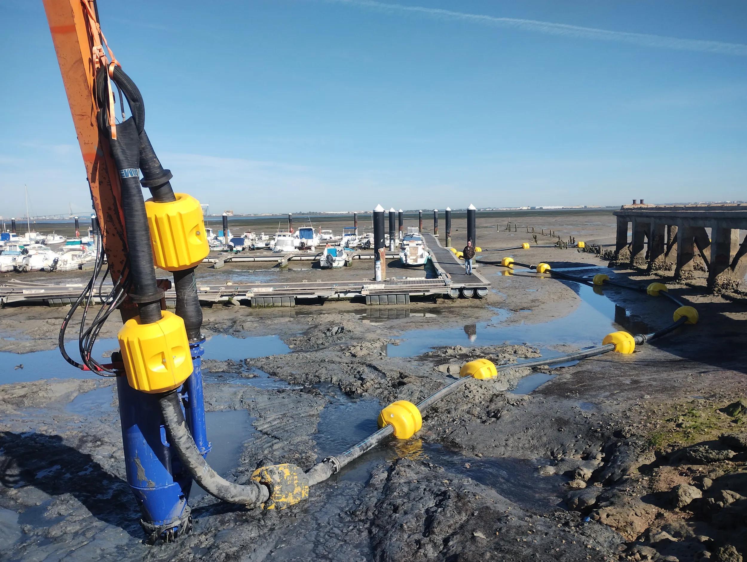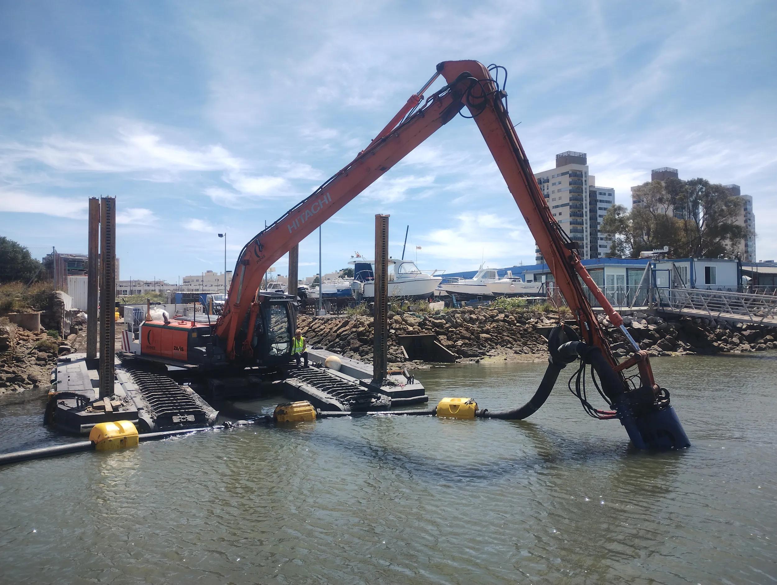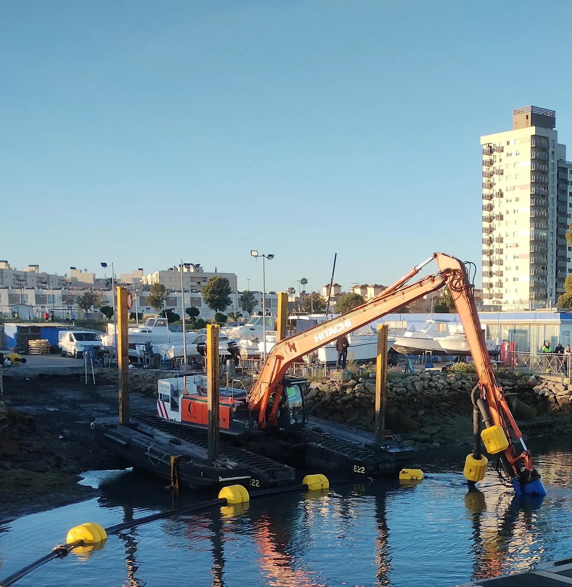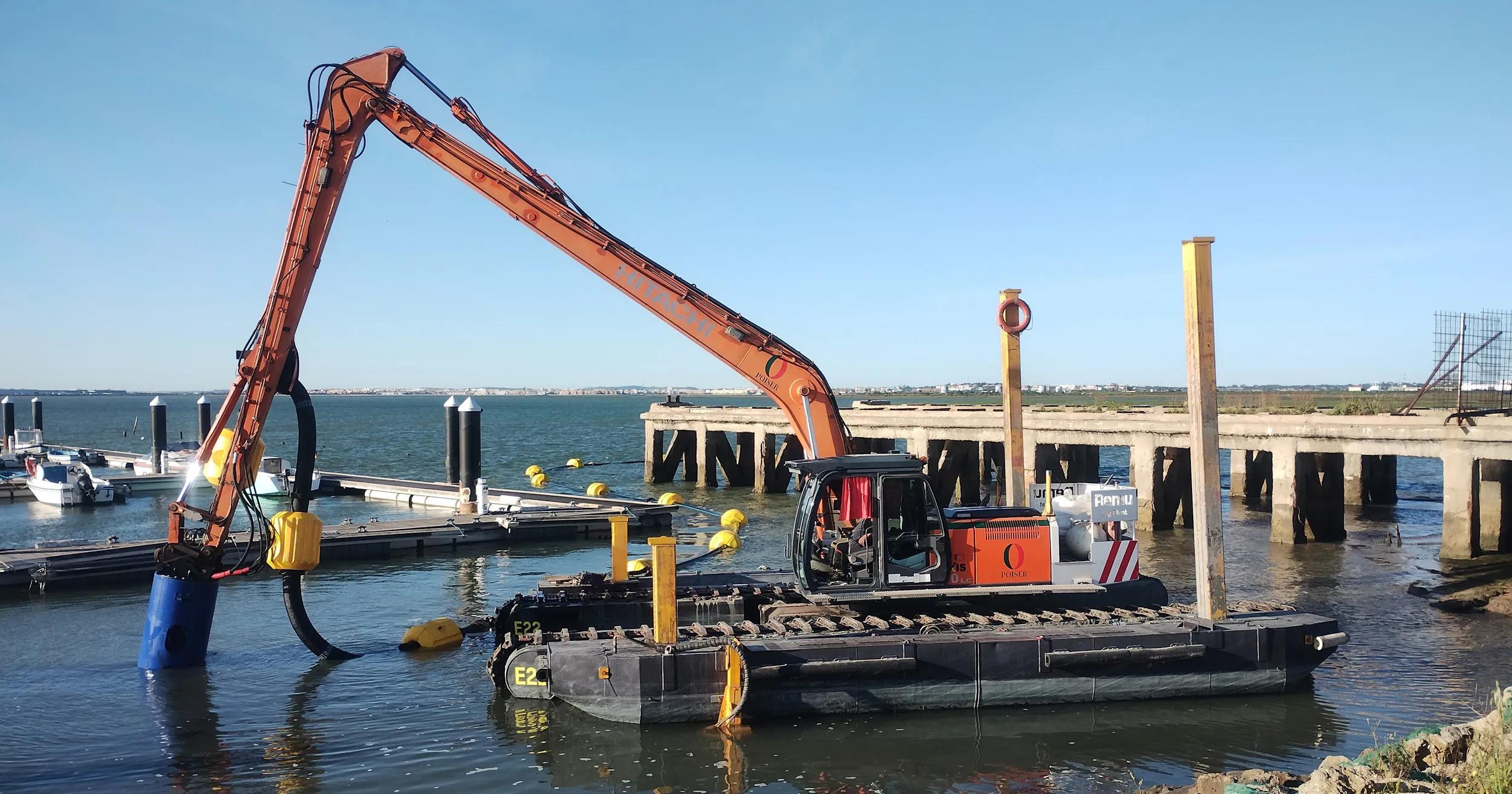 In the tidal lagoon south-east of Cadiz, southern Spain, is the yachting marina San Fernando. Over the past few decades the access to the yachting harbour “Club Náutico de la Casería” and its berths have silted up heavily due to tidal and river flows carrying silt into the harbour. To ensure access for the pleasure yachts and small fishing vessels, major dredging activities have been required. For the job, an amphibious excavator with a DOP150 is being used.