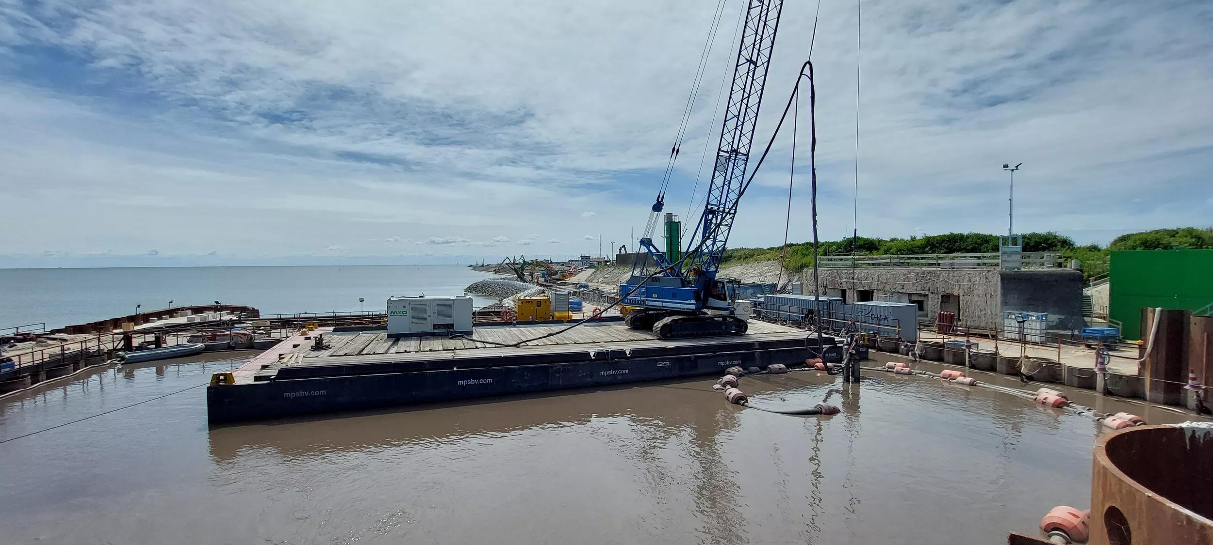 The DOP200 is owned and operated by the Dutch contractor Martens en van Oord. The project set-up, just east of the Stevin Sluices, is well considered. The building pit itself, measuring some 50 by 50 meters, is created using sheet pile. The top soil has been removed by excavators. Then a pontoon has been located in the flooded construction area. On the pontoon a wire crane with DOP submersible dredge pump were located.