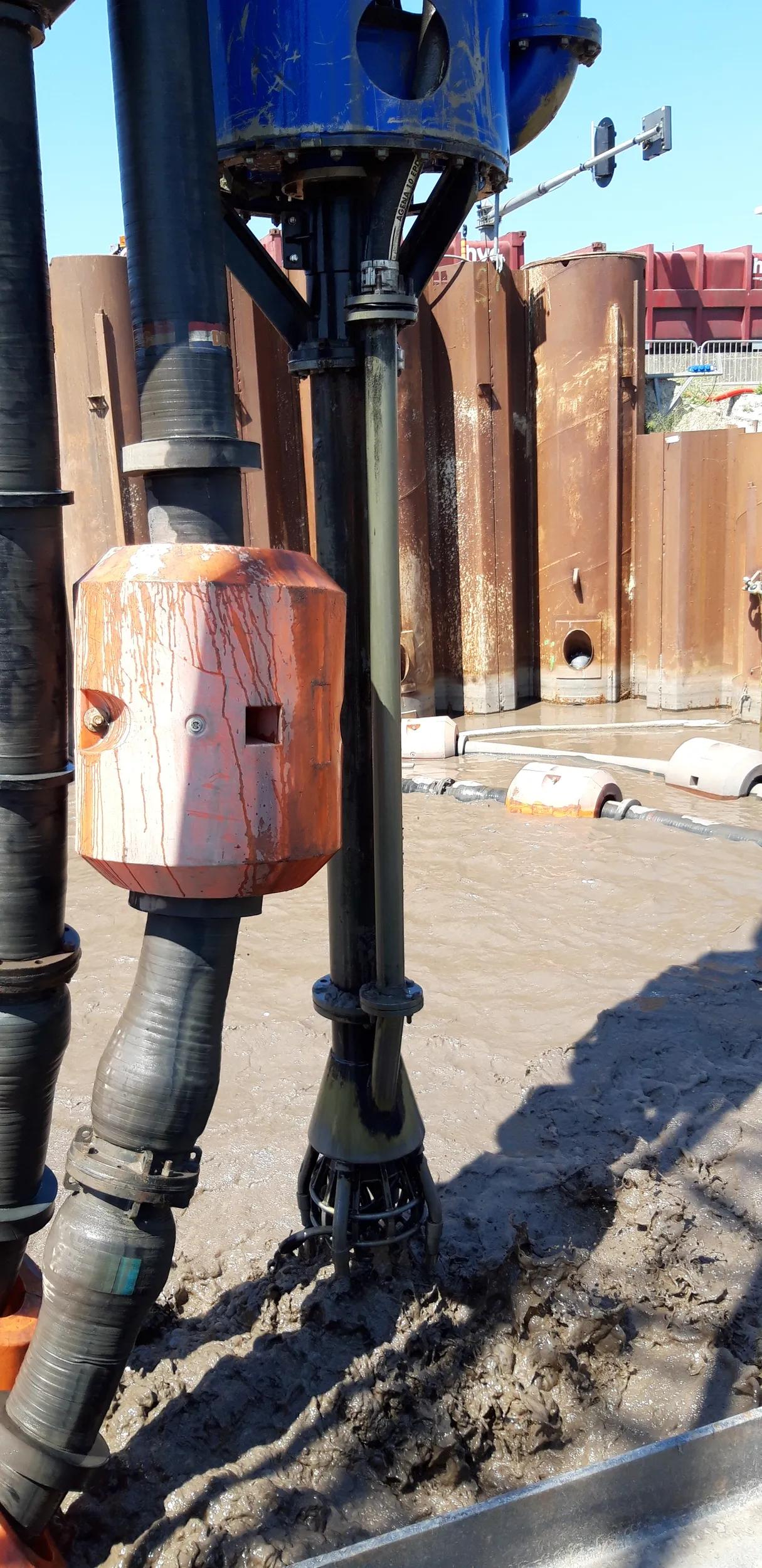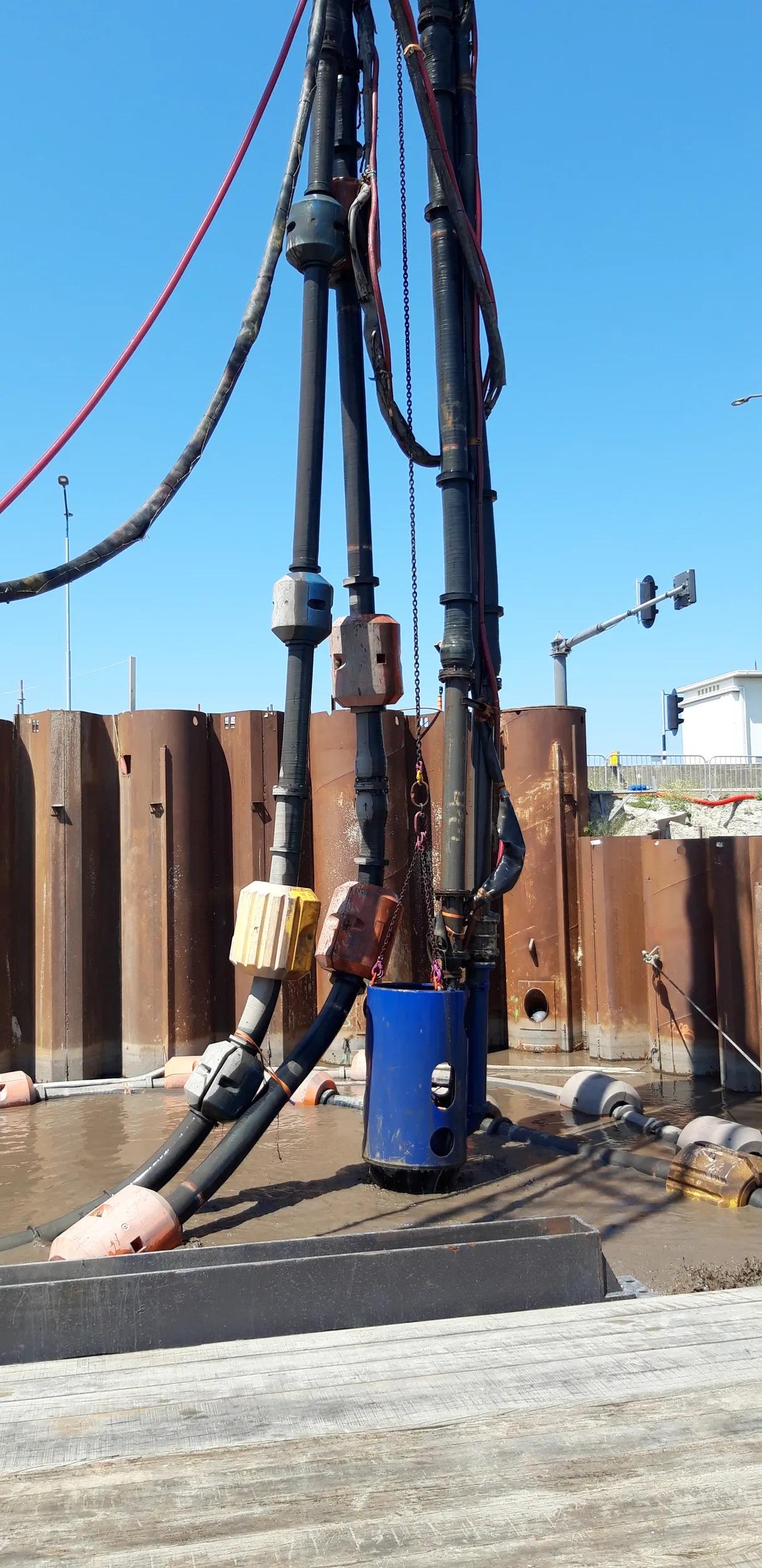 The DOP dredge pump is hydraulically powered using a separate power pack. The sand pump is maneuvered through the building pit by the crane operator. Great care is paid to move around the structures present below the water level. The DOP pump is moved through steel pipes using precise positioning equipment as guidance.