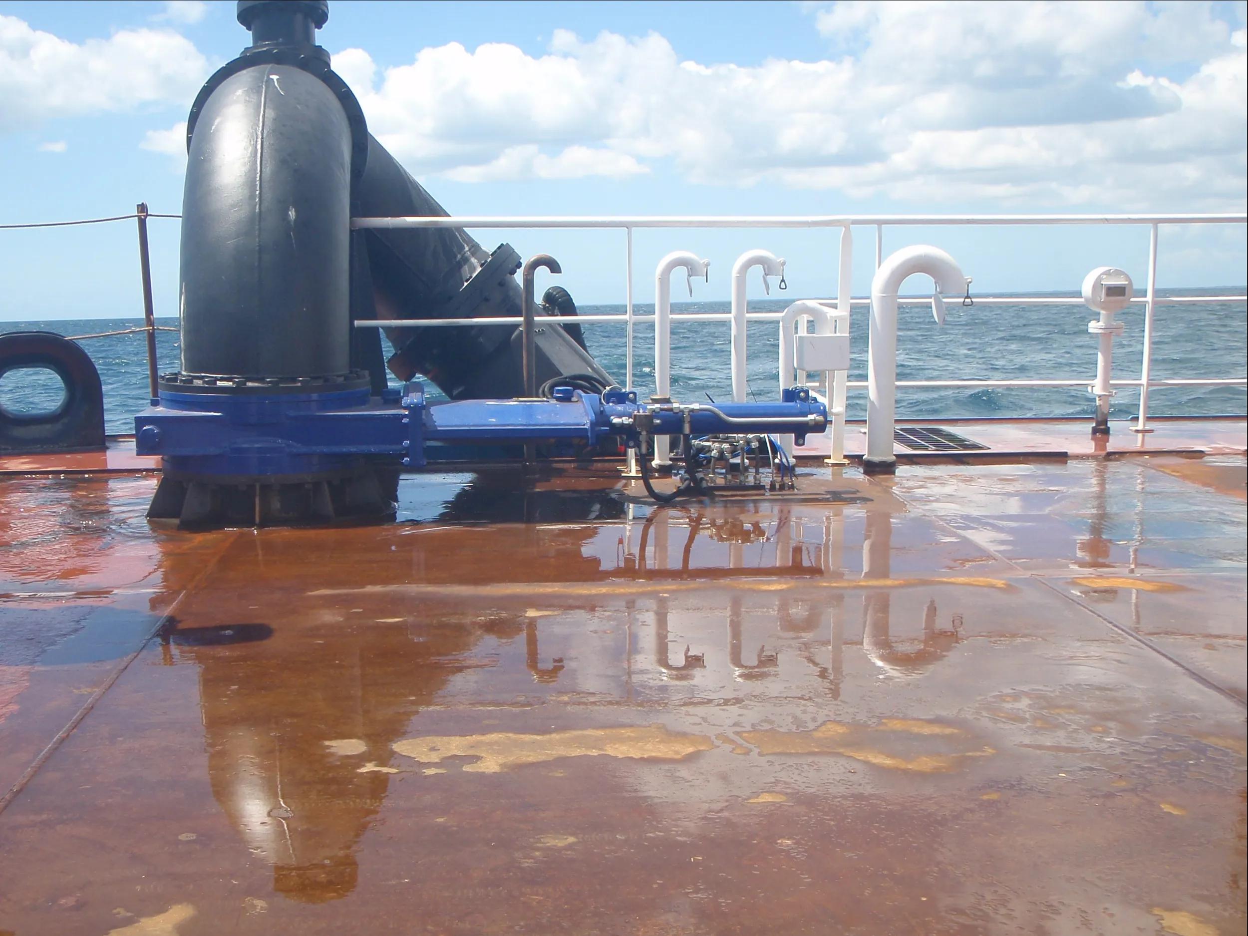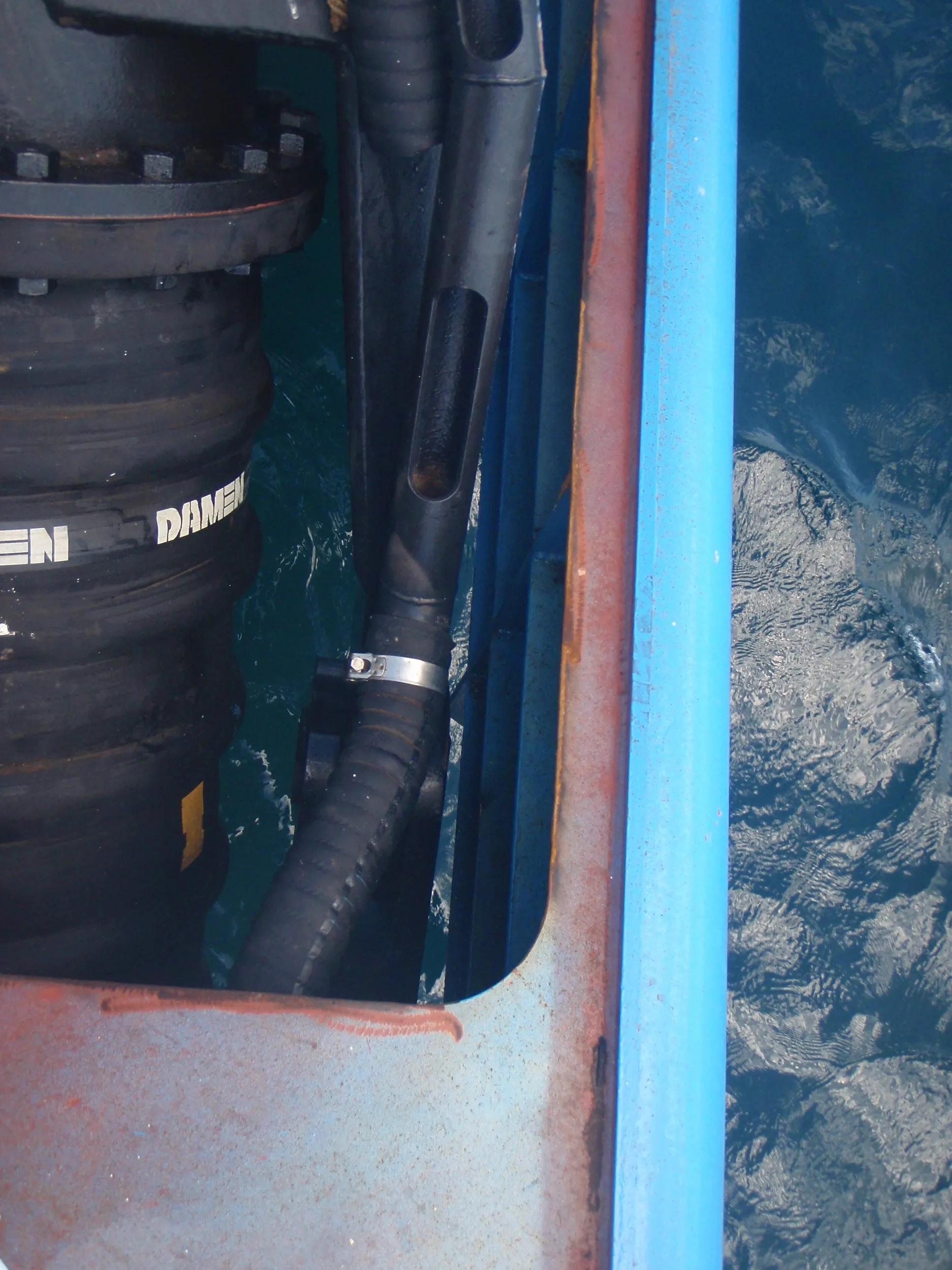 Water injection dredging requires large volumes of water to fluidise the recently deposited sediment. Hence the piping on board has a substantial diameter.