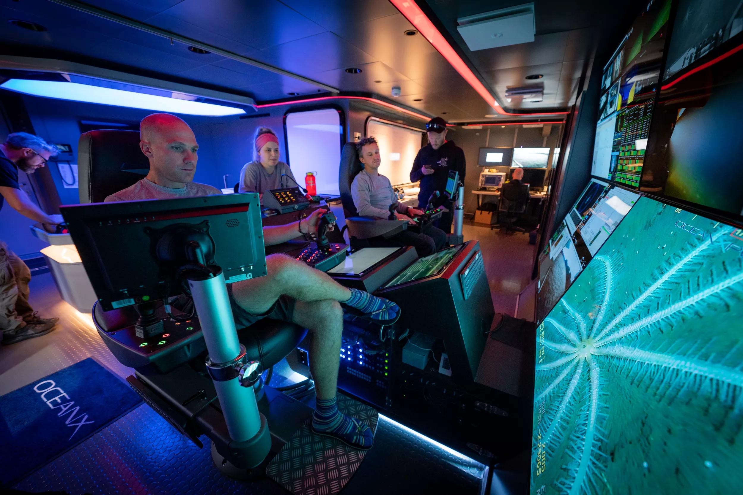 The OceanXplorer team conducting operations in mission control. Mission control is the nerve centre for all of the ship’s operations, from where teams navigate the submersibles and ROVs and collect and process all the mapping data for scientific analysis