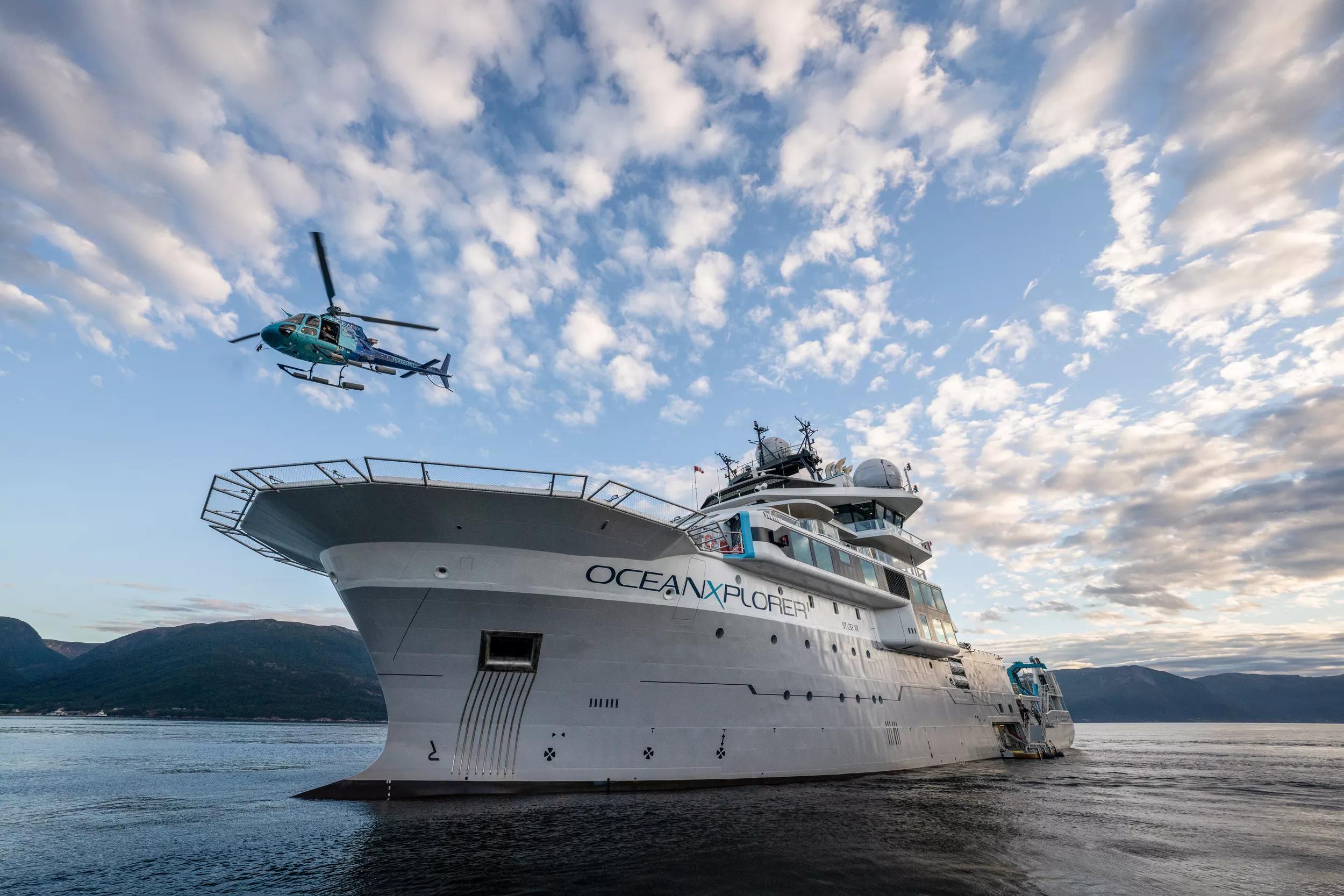 OceanXplorer’s helicopter can be seen here on the landing pad overlooking the vessel’s bow