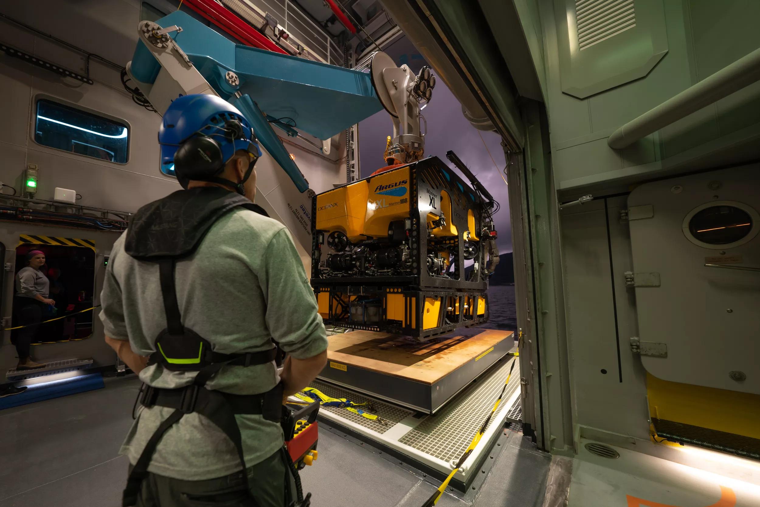 An OceanX crew member looks on as the ship’s ROV is prepared for launch