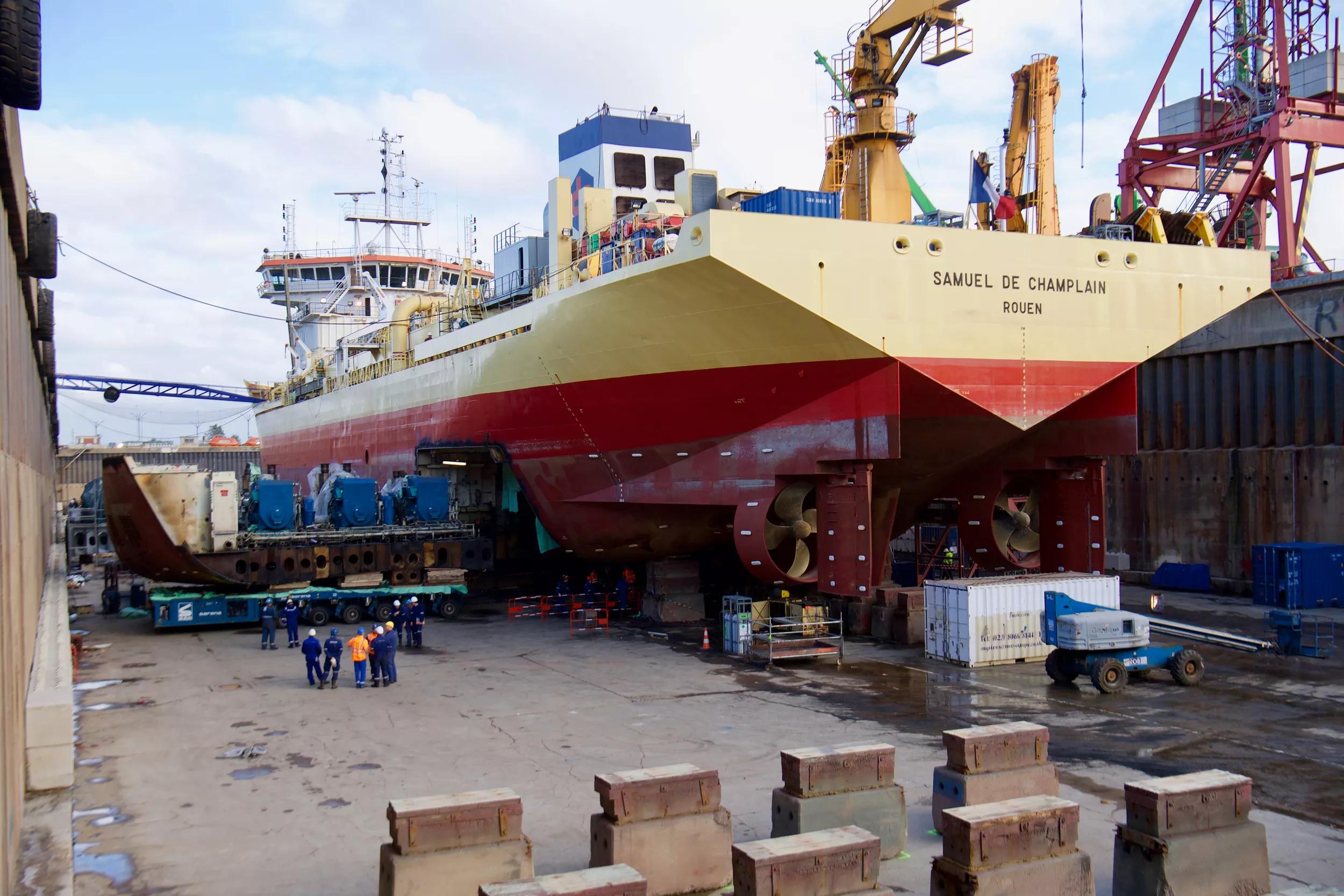 Damen has for years already been working on the upgrade of vessels towards improved efficiency. In 2018, Damen Shiprepair Dunkerque carried out the conversion of the 117-metre, 8500 m3 trailing suction hopper dredger Samuel de Champlain to dual-fuel LNG and MPG, significantly lowering its emissions. The scope included the change of generators to dual-fuel modules and installation of onboard LNG storage facilities. The conversion was the first of its kind in Europe.