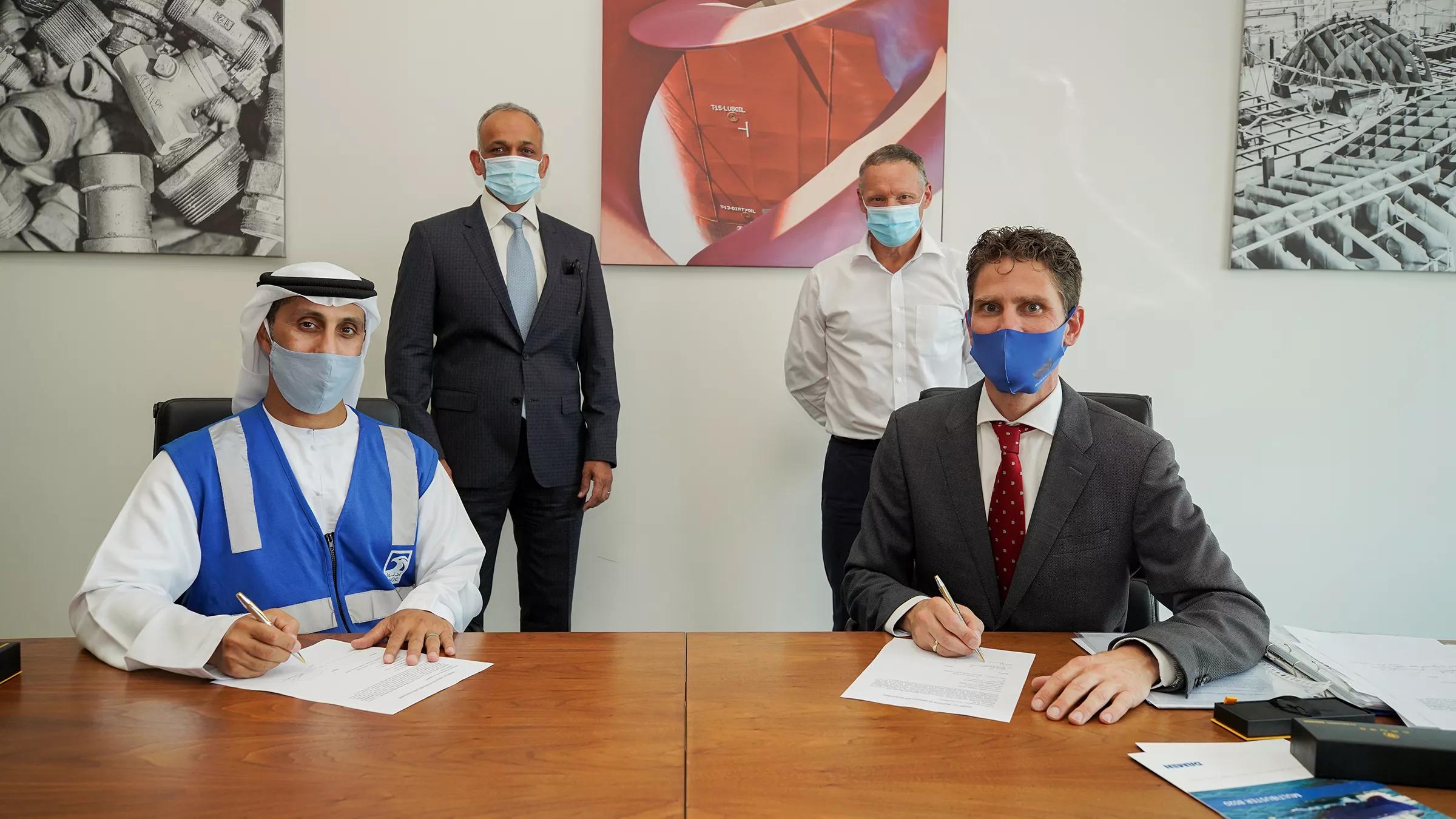 Mr. Khalfan Al Ali, Manager (Marine Projects (OMS), ADNOC); Mr. Vivek Seth (Senior Vice President, Marine Services, ADNOC); Mr. Lars Seistrup (Managing Director Albwardy Damen); Mr. Pascal Slingerland (Regional Sales Director Damen Shipyards)