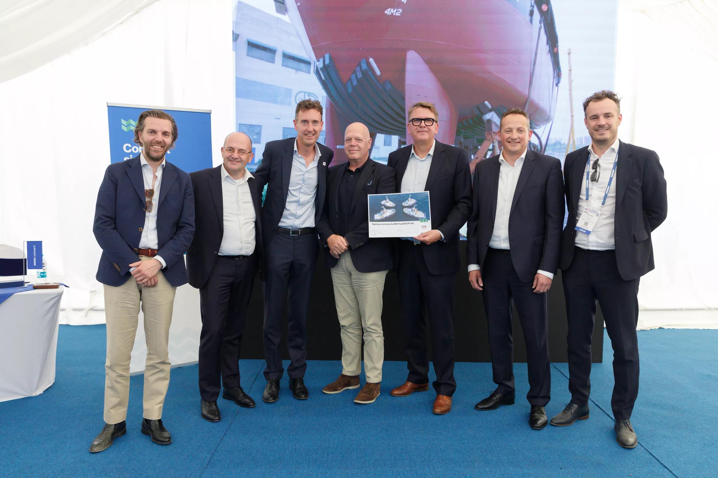 From left to right: Maxime van Eecke (CCO CMB.TECH), Mijndert Wiesenekker (Sales Director Benelux Damen), Alexander Saverys (CEO CMB.TECH), Robbert van Rijk (Managing Director), Jan-Wim Dekker (CCO Damen), Erik van Schaik (Product Manager Tugs Damen), Vincent Maes (Sales Manager Benelux, Damen)