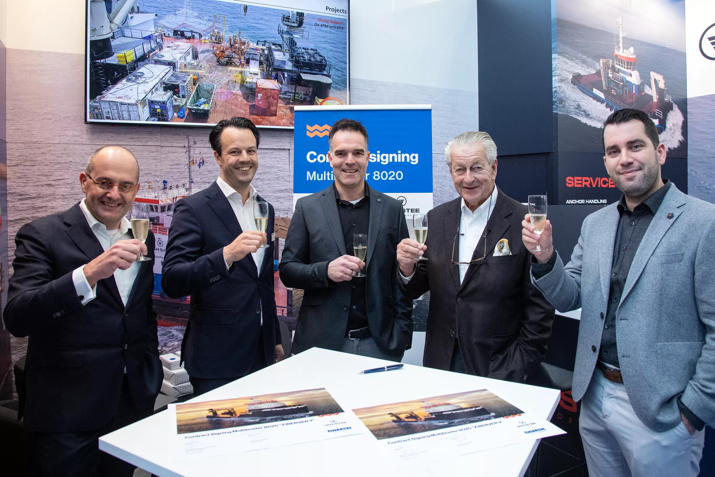 At the Offshore Energy Exhibition & Conference 2022 Kommer Damen, Chairman of Damen Shipyards Group, and Arjan van Stee of Van Stee Offshore have signed a contract for the delivery next year of an 80-metre Multibuster 8020 ultra-shallow draught, multi-purpose workboat. Van Stee’s Multibuster 8020 is the first of a new class that combines the key elements of Damen’s highly successful Multi-Cat and Shoalbuster workboat classes to create a large-scale platform capable of undertaking a wide variety of projects in waters as shallow as three metres.