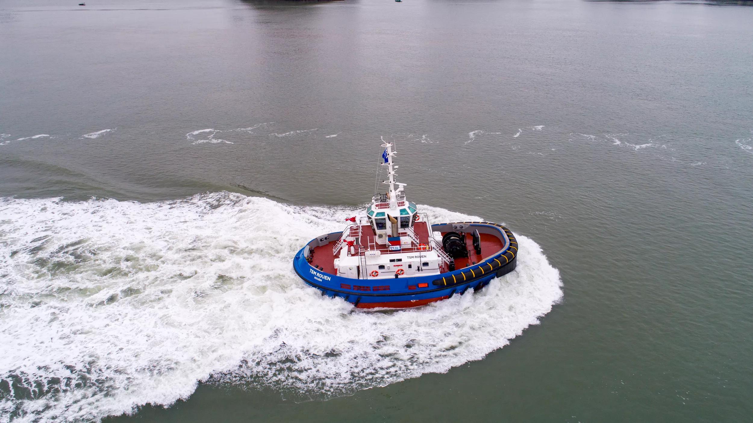 Damen Shipyards Group has delivered two RSD Tugs 2513 to France-based Thomas Services Maritimes (TSM). The client was looking for the latest in tug technology and will operate the vessels on the River Seine in the port between the Ports of Rouen and Honfleur (HAROPA – Port de Rouen). The tugs will assist bulk cargo carriers, facilitating the export of cereals from the Port of Rouen – Europe’s number one grain terminal, tankers and all vessels inbound for Rouen.