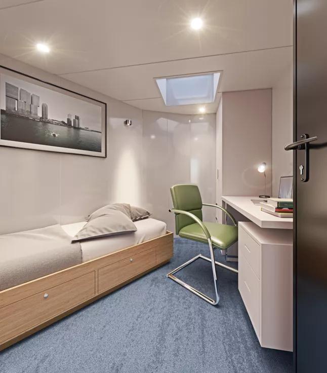 The Riverbuster 1909 is intended to be a fully configurable, modular platform, which can be fitted out with project-specific equipment such as forward and rear towing or anchor handling winches, two sets of hydraulic tugger winches, several deck crane options, two sets of 20-foot container twist locks, hydraulic towing pins, and a foldable A-frame for plough dredging. The wheelhouse is hydraulically lifted to enable a viewing height of 11 metres. Still, the vessel remains very compact with a shallow draught of only 1.75 metres and an air draught of 4.20 metres, which allows the Riverbuster to reach almost any inland destination. The vessel’s aft skeg allows for complete groundings, opening opportunities for close dredging assistance.