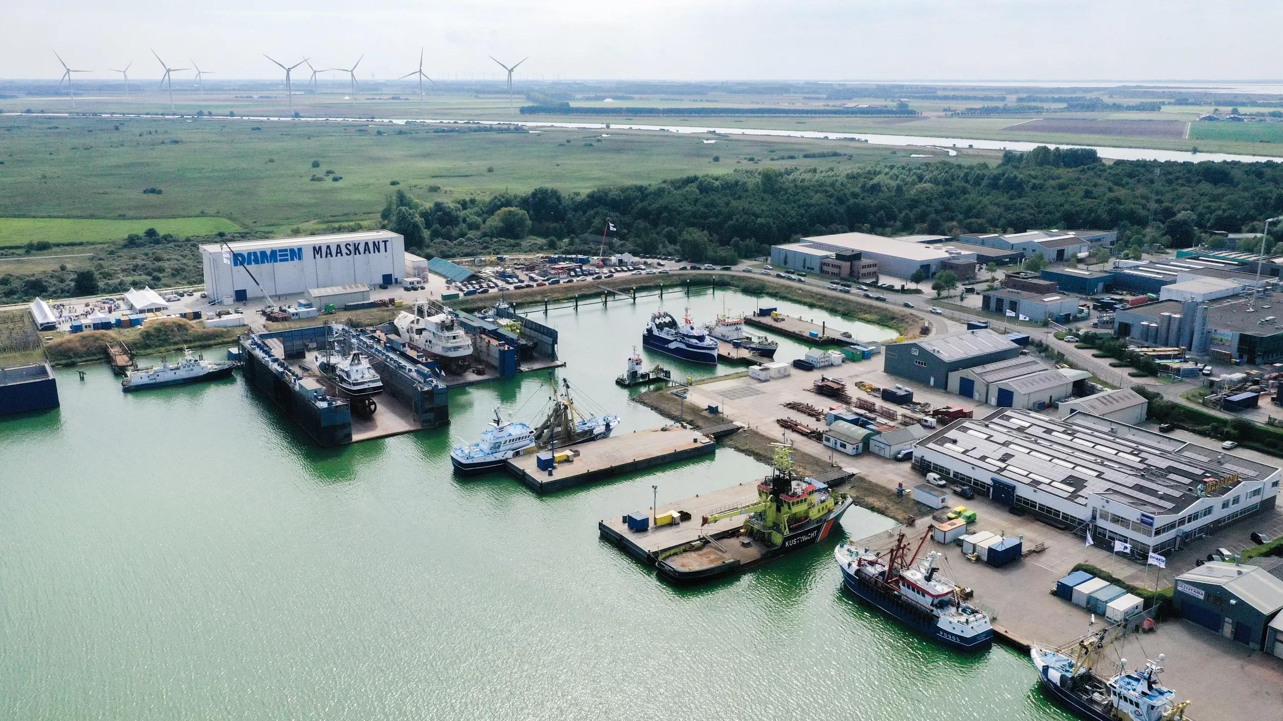 On the top image: The Damen Maaskant shipyard with at the background the new yard hall and the festival area next to it.