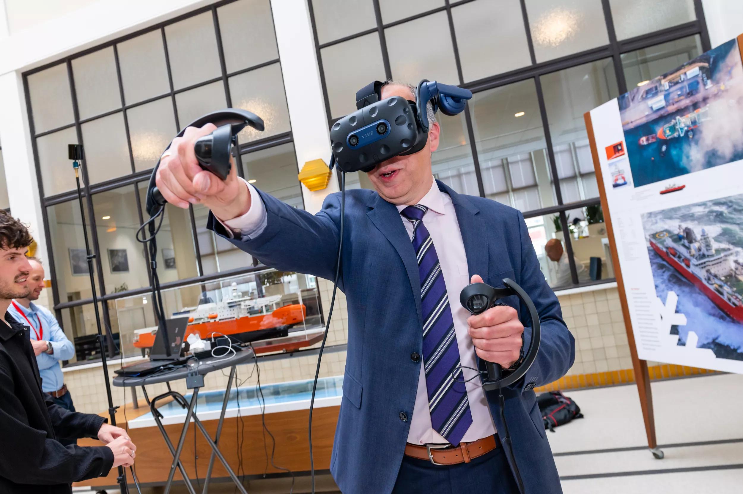 COMMIT Project Director Joost Meesters tries out the VR module during a presentation at Damen Naval