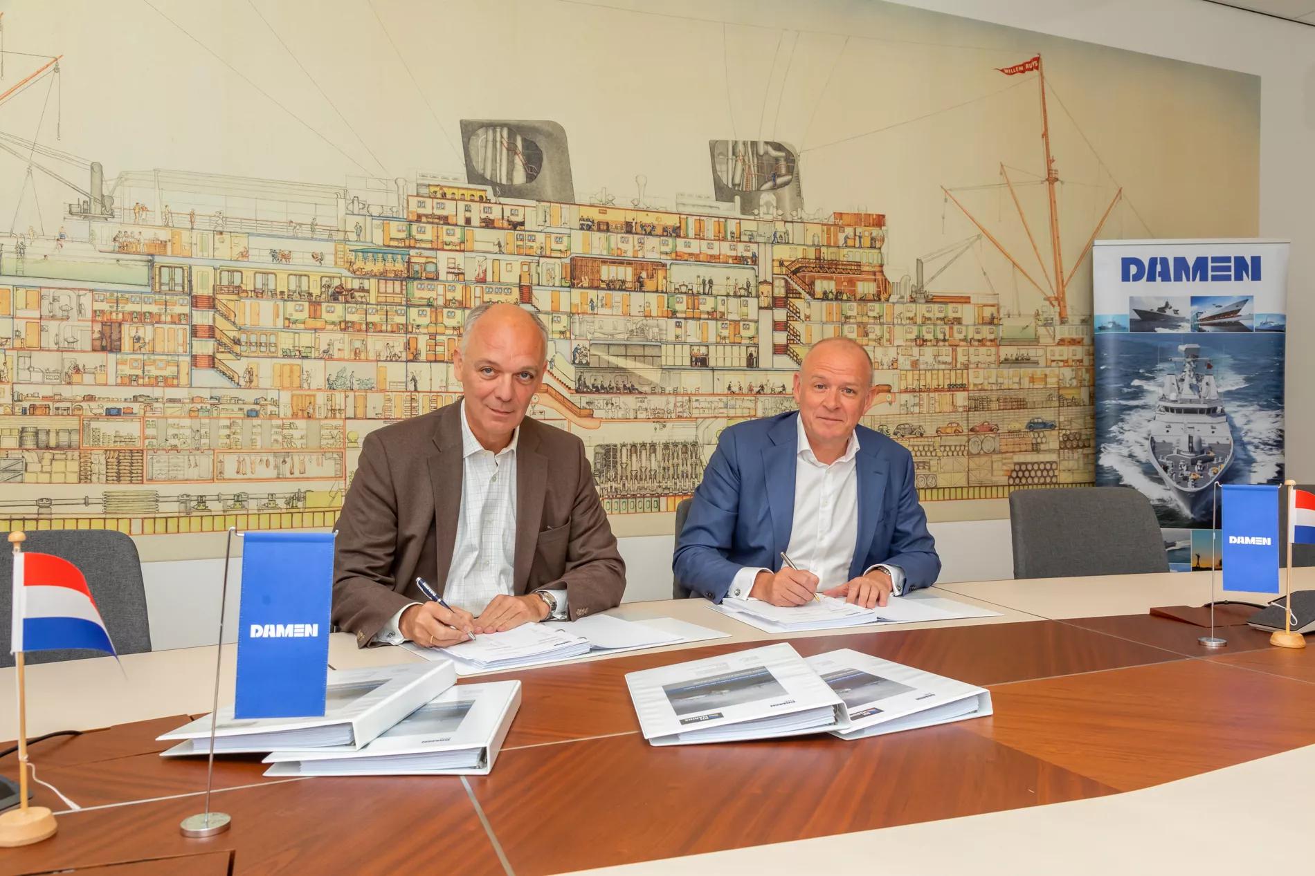 RH Marine Managing Director Hugo Loudon (left) and Damen Naval Managing Director Roland Briene sign the agreement.
