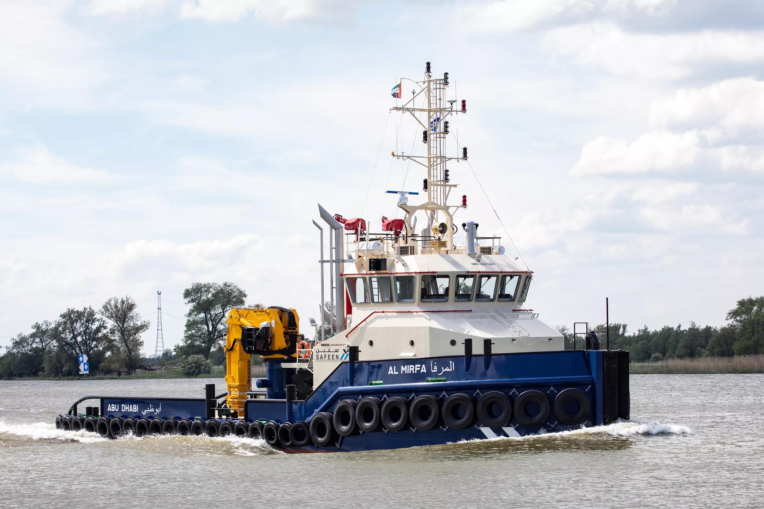 Damen Shipyards Group has delivered a new Shoalbuster 3209 to SAFEEN Group, a subsidiary of AD Ports Group. The vessel was named Al Mirfa, after a coastal community located in the Al Dhafra region of Abu Dhabi, in a ceremony that took place at Damen Shipyards Gorinchem in the Netherlands.