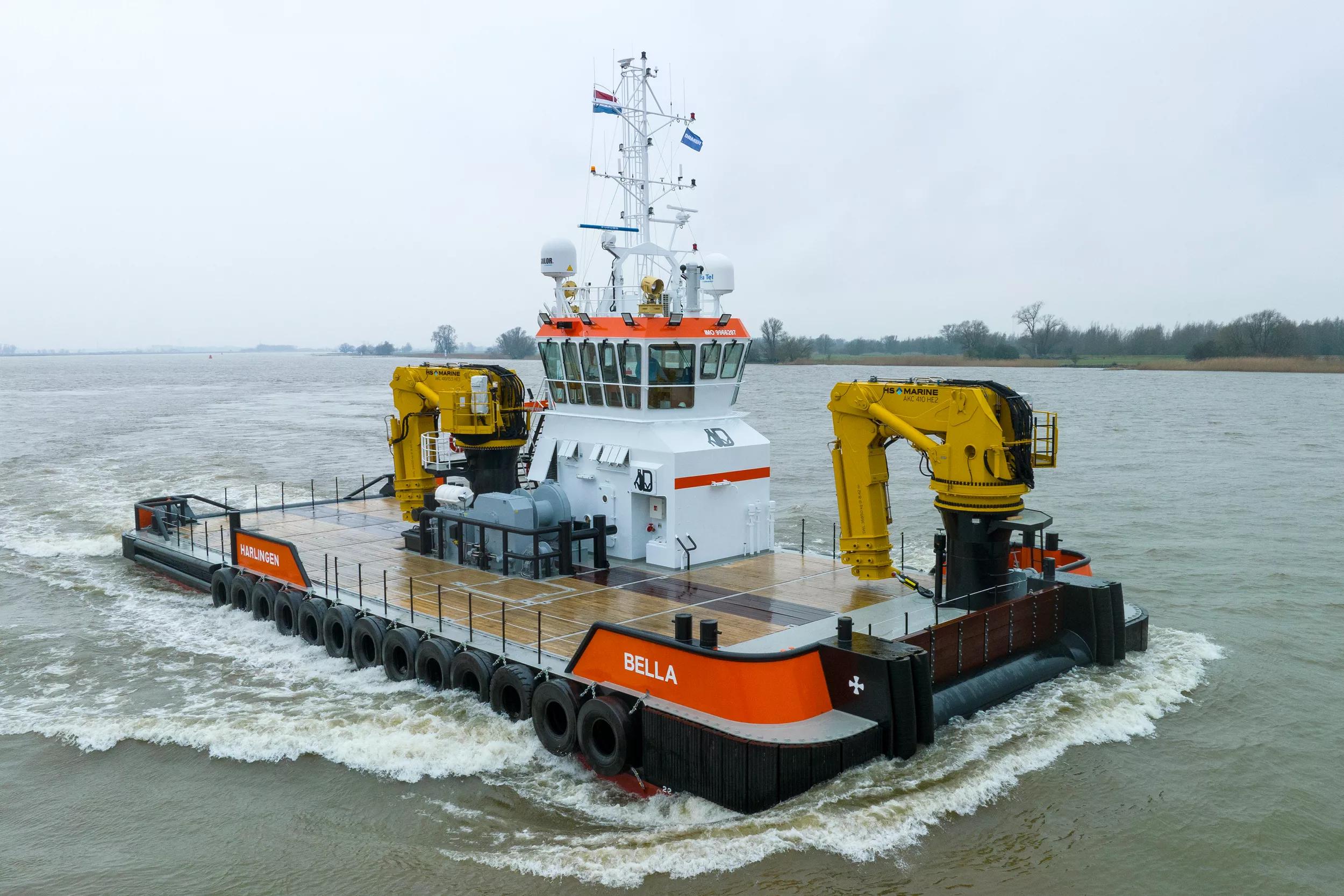 “We are very pleased to add yet another ultra shallow vessel to our existing fleet of vessels build by Damen,” said Erwin van Dodewaard. “Bella is a unique Multi Cat with extremely powerful cranes for her draft which is unique in the workboat sector. With this new vessel we can serve our clients even better in the years to come.”