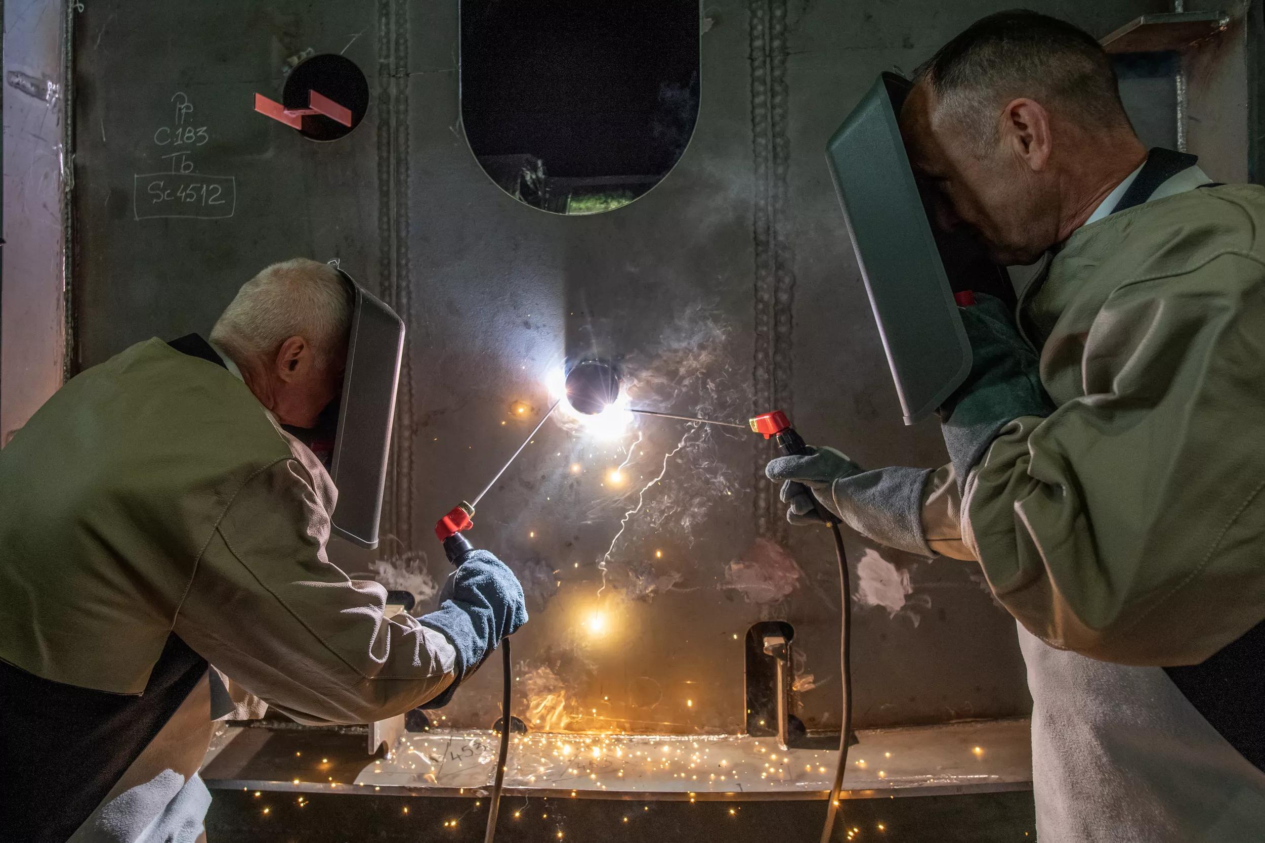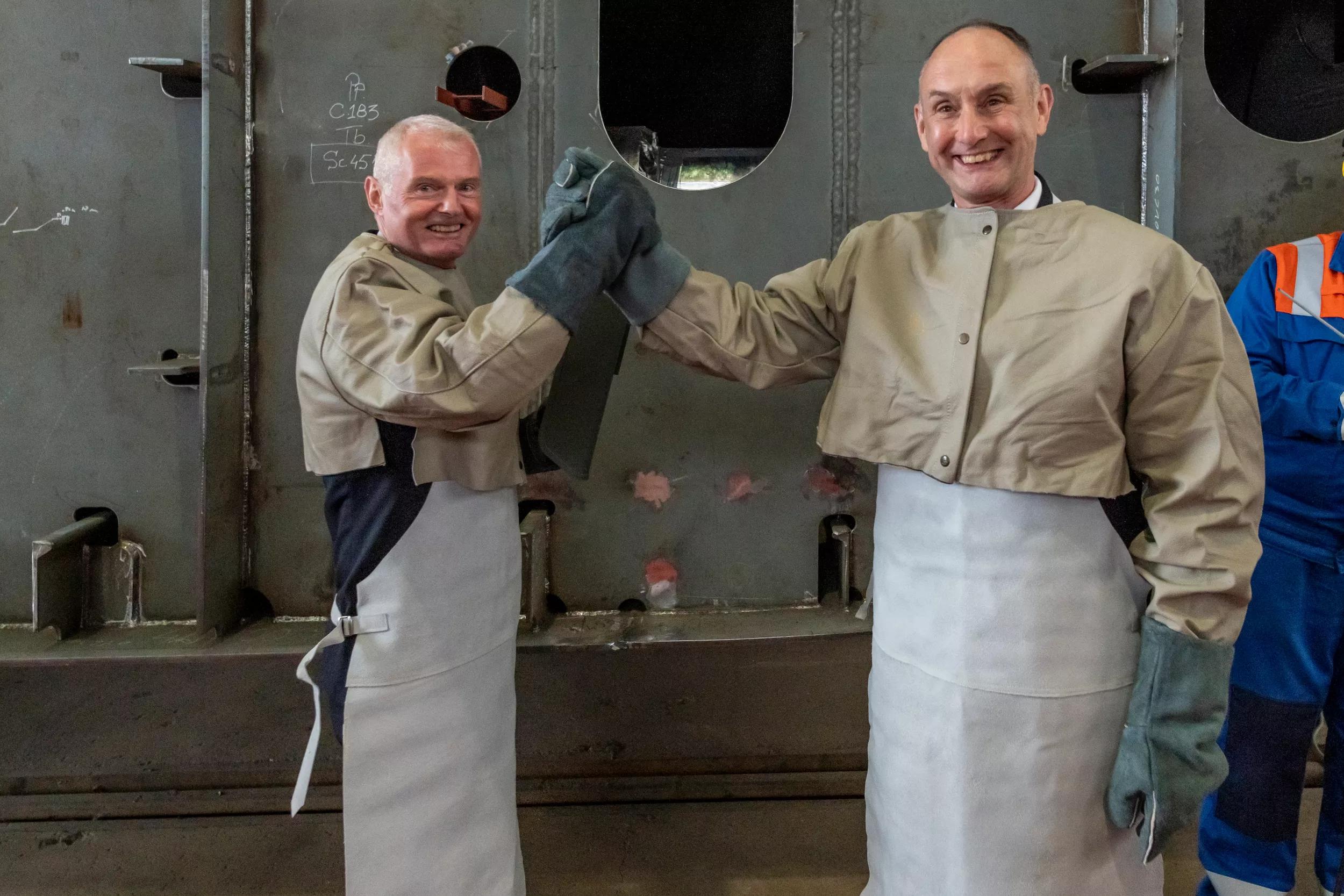 Vice admiral Rob Kramer, Commander Royal Netherlands Navy (RNLN) and Director Defence Material Organisation (DMO), vice admiral Arie Jan de Waard during welding