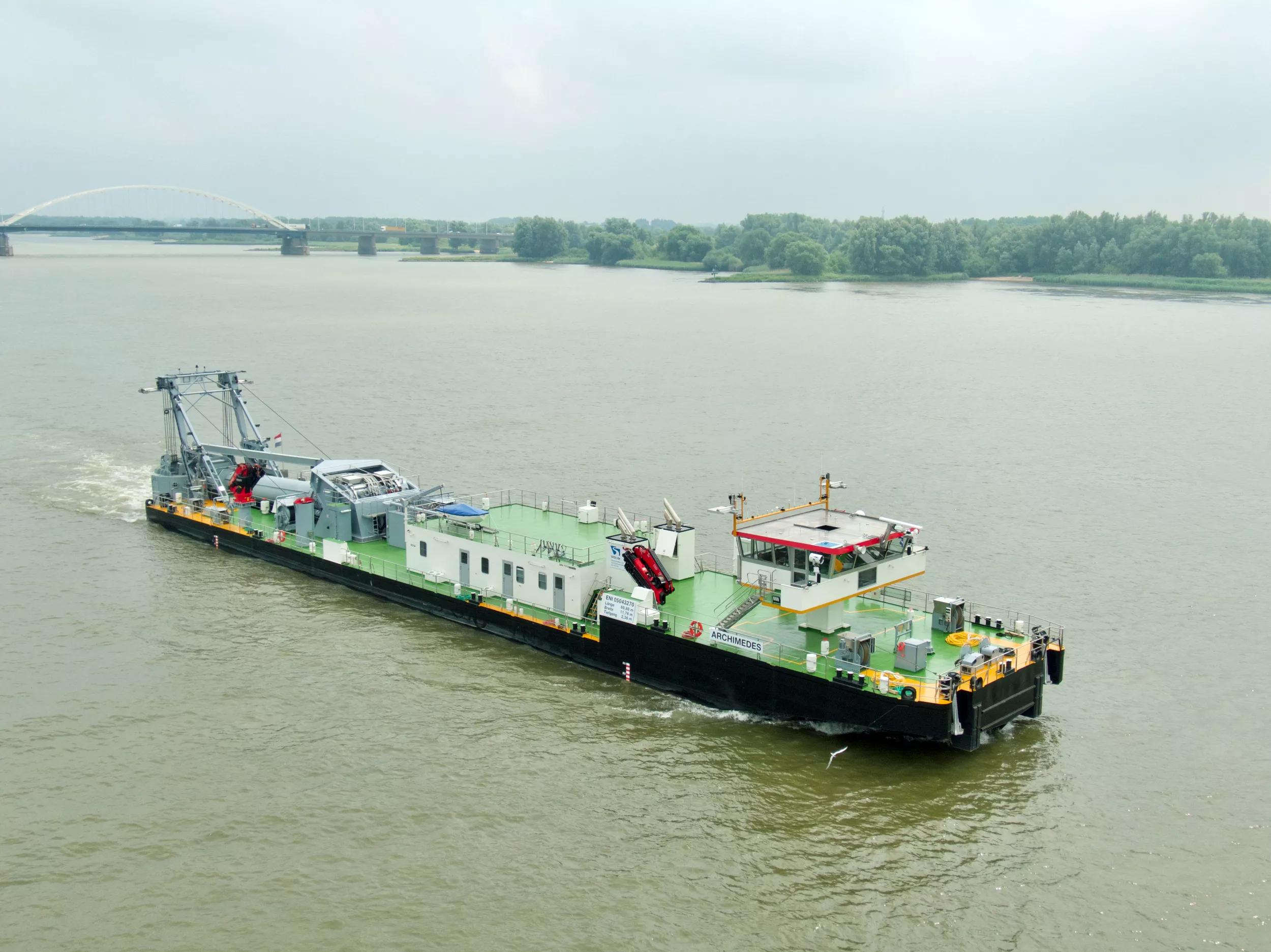 The replacement diving bell vessel Archimedes, built for owner German government agency FMSW Koblenz to replace a previous vessel, is not only the most unusual of the three, but also one of the most remarkable vessels that Damen has ever built. Her purpose is the inspection and maintenance of infrastructure on riverbeds, primarily those of the rivers Rhine and Mosel, and the recovery of lost cargo and wreckage. To achieve this, the 70 by 11.7 metres vessel mounts a four-metre by six-metre diving bell in which personnel can work at depths of up to ten metres, manoeuvred by a bespoke foldable hoisting frame. Diesel-electric, she has an array of additional specialist systems including a ballast system to ensure longitudinal equalisation during operations and passages under low bridges, and a pressure equalisation chamber.