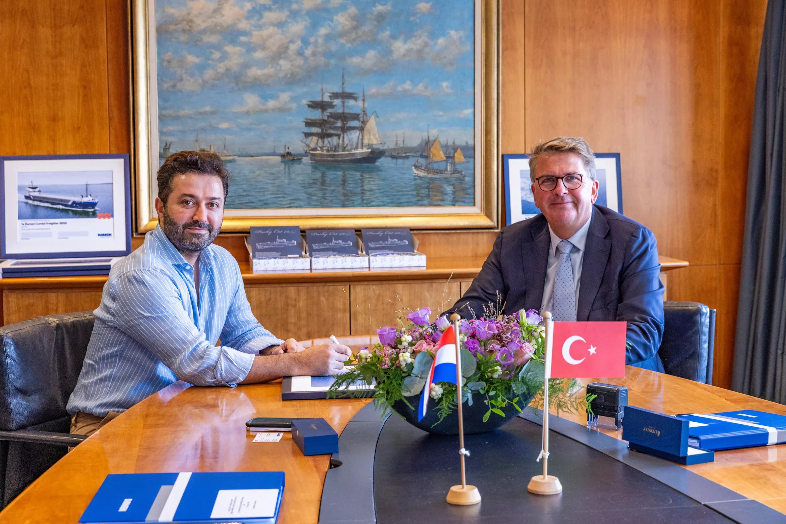 On the top photo from left to right: Serkan Leke (Chairman of the Board SLPLUS Holding) and Jan Willem Dekker (Chief Commercial Officer, Damen Shipyards)