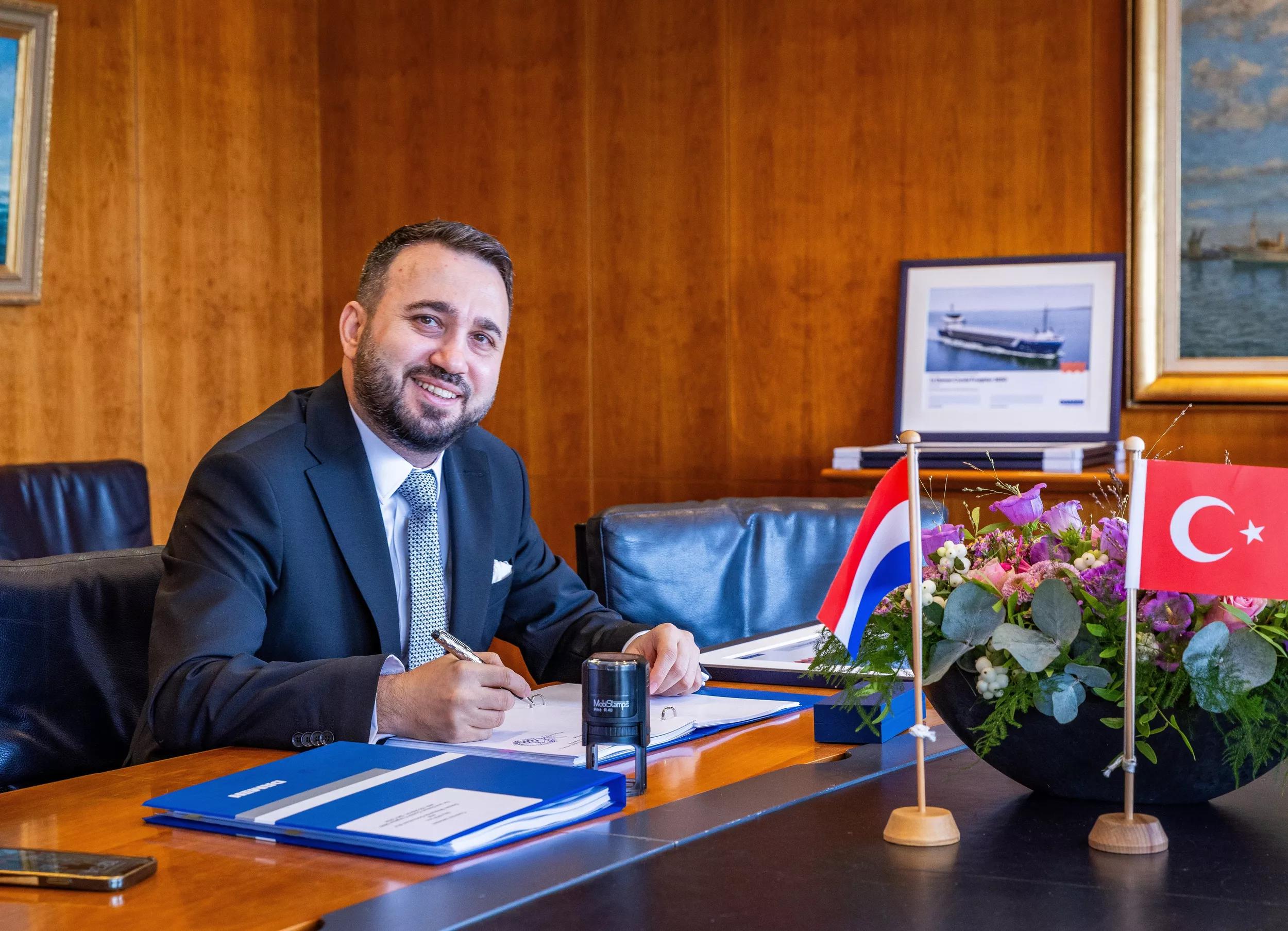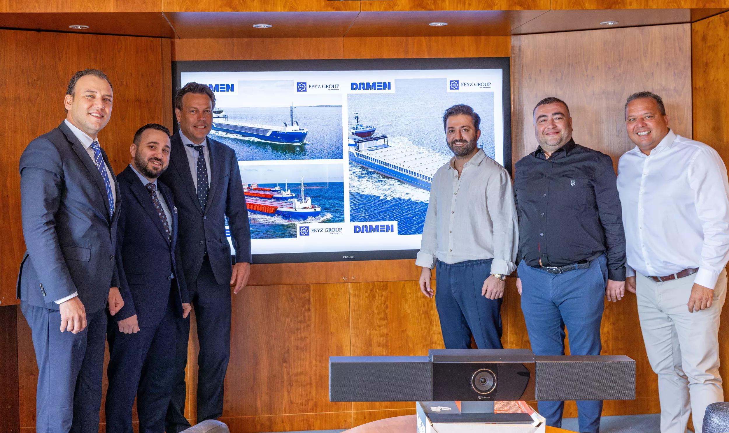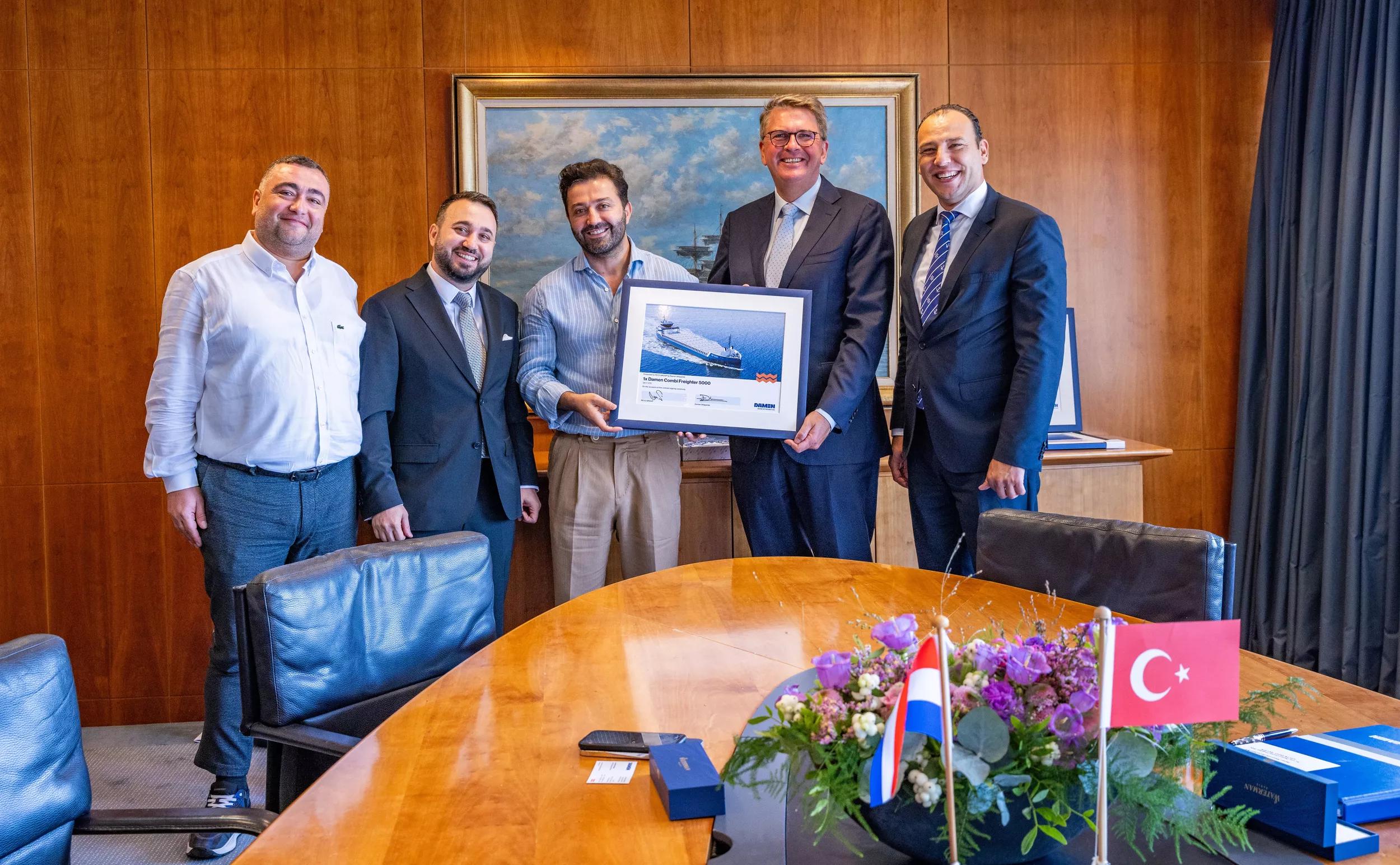 From left to right: Boran Bekbulat (Regional Sales Director, Damen Shipyards), Engin Aynaci (General Manager, Feyz Group), Arnout Damen (CEO, Damen Shipyards), Serkan Leke (Chairman of the Board SLPLUS Holding), Yasin Us (Partner, Feyz Group), Jason Bronscheer (Managing Director, Damen Cargo Vessels Operations)