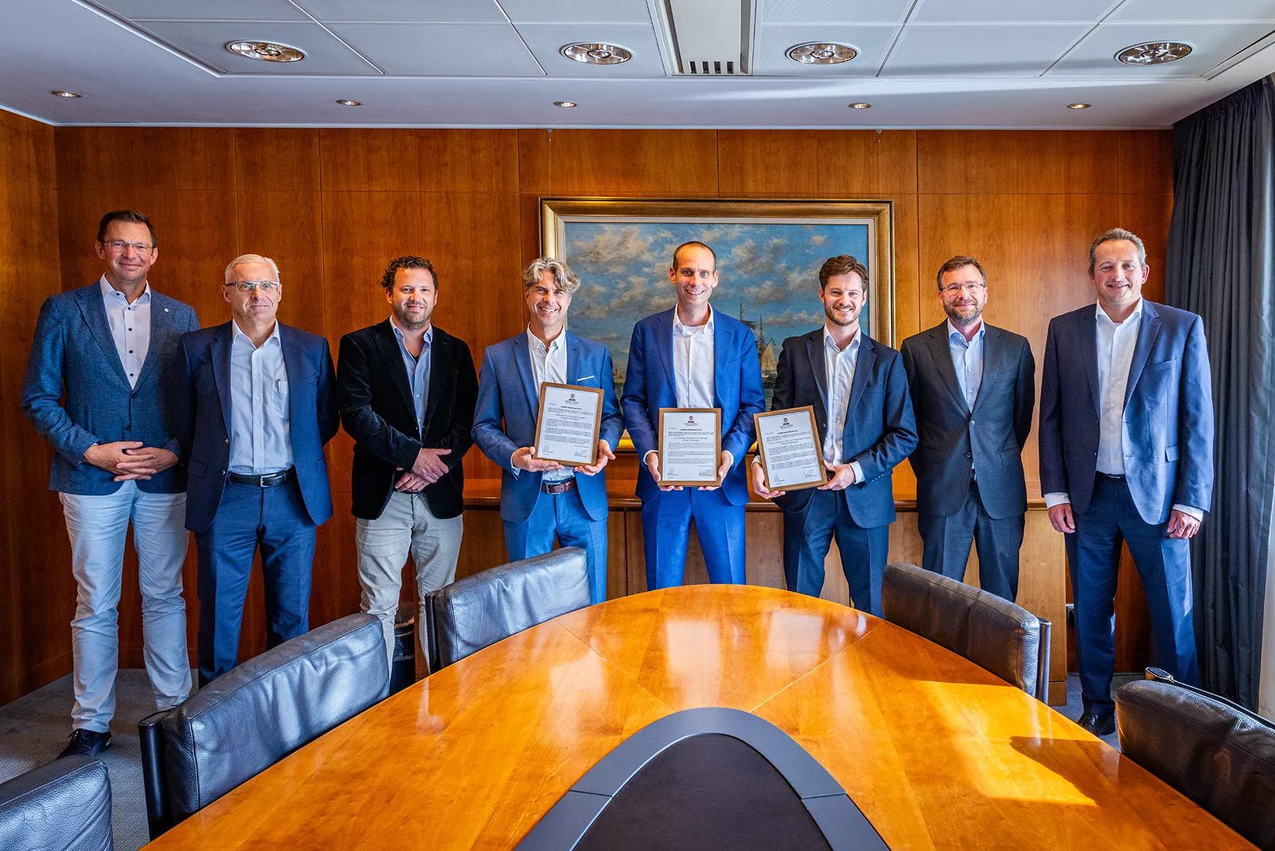 From left to right: Jeffrey Jacobs (Manager Technical Development, Damen Workboats), Vincent Avontuur (Business Support Manager – Senior Surveyor, Bureau Veritas), André de Bie (Programme Manager Sustainable Propulsion, Damen Workboats), Herman Spilker (Vice President North Europe, Bureau Veritas), Pieter Spruijt (Technology Specialist Alternative Fuels, Damen Workboats), Sander van der Sluis (Project Manager Engineering, Damen Workboats), Erik van Schaik (Product Manager Design Tugs, Damen Workboats) and Joost Mathôt (Director Products, Damen Workboats)