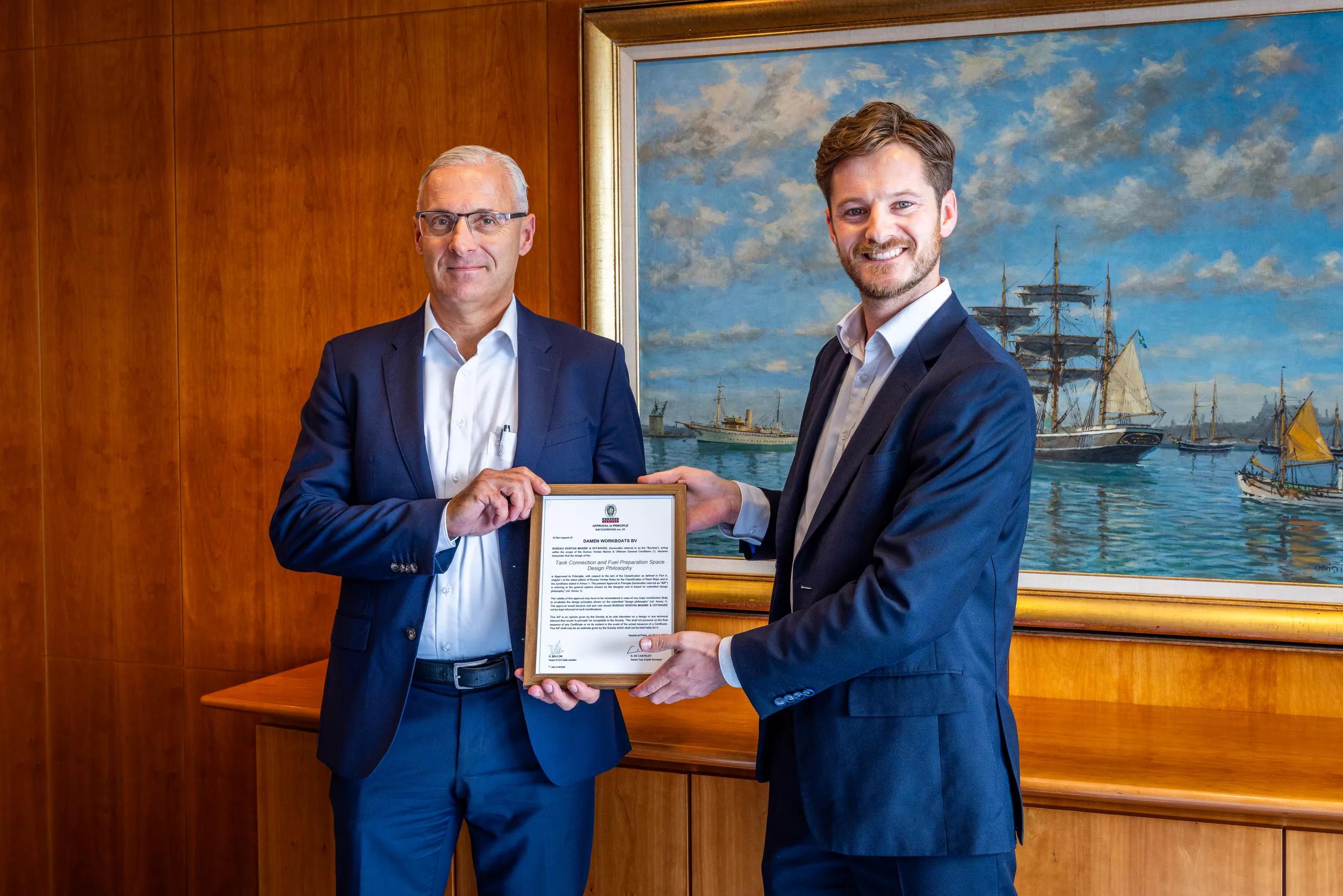 From left to right: Herman Spilker (Vice President North Europe, Bureau Veritas) and Pieter Spruijt (Technology Specialist Alternative Fuels, Damen Workboats)