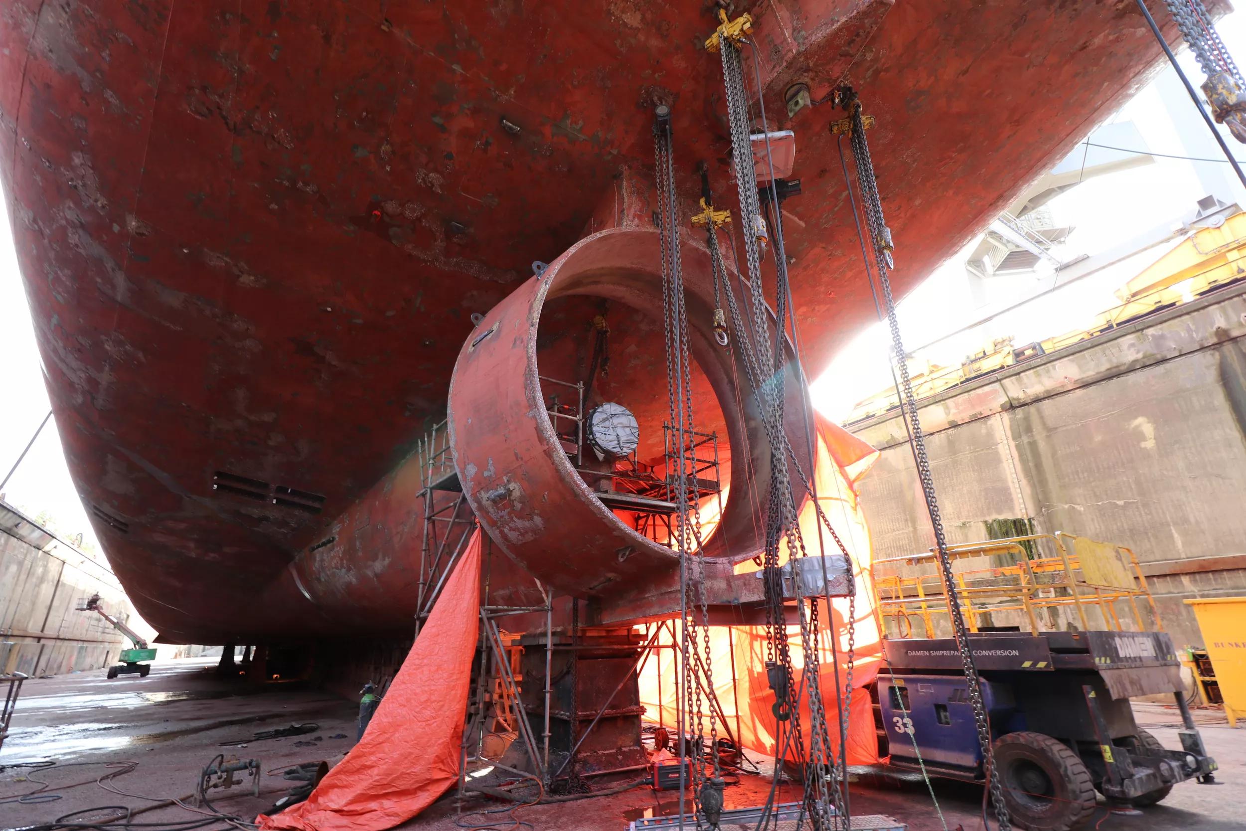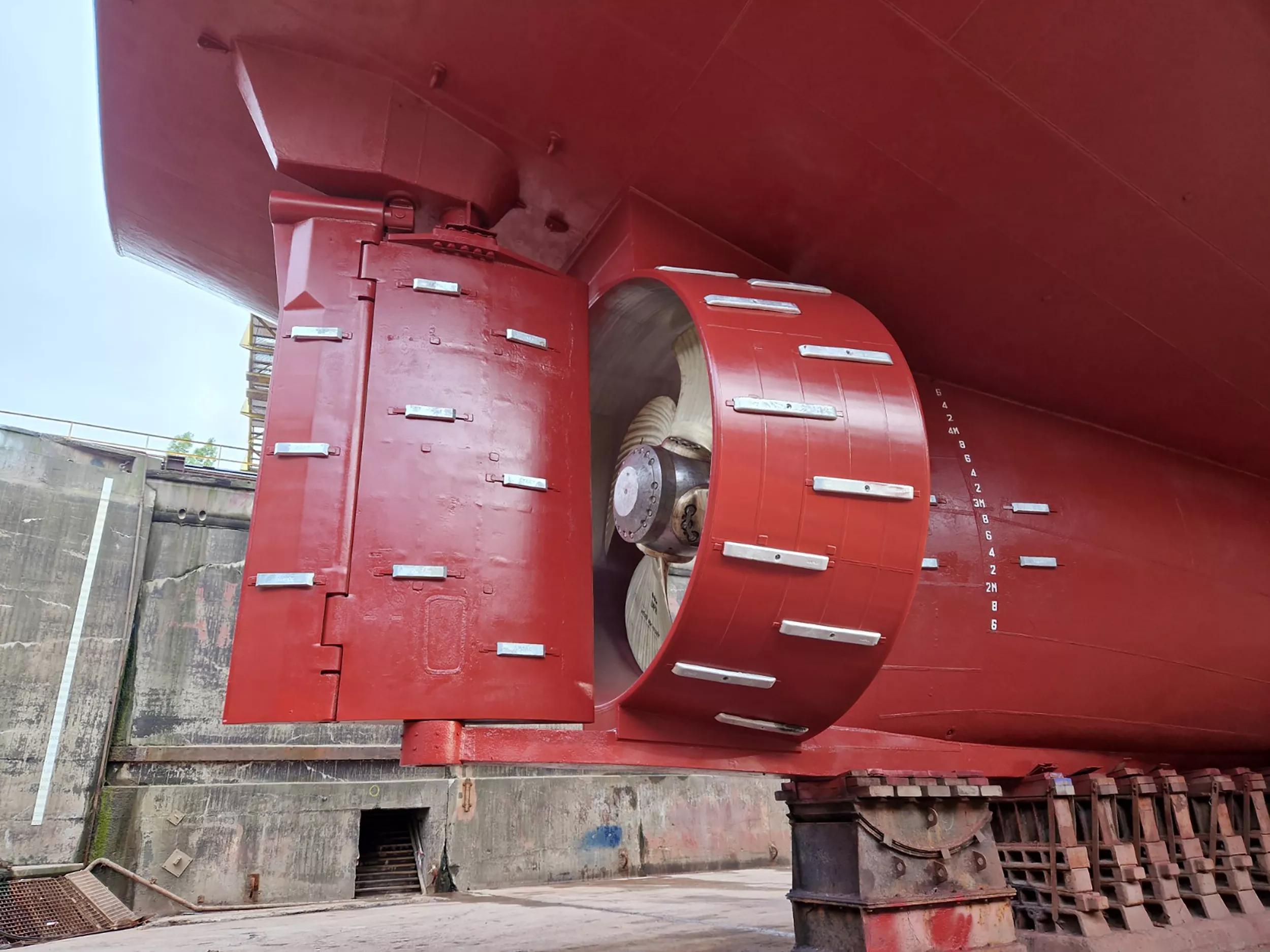 It was a complex operation, according to Kees Oevermans, technical sales manager at Damen Marine Components in Hardinxveld-Giessendam. “The nozzle weighs 18 tonnes, and it’s a challenge to get it exactly in the right position underneath the ship. But everything went well and the end result looks very neat.”