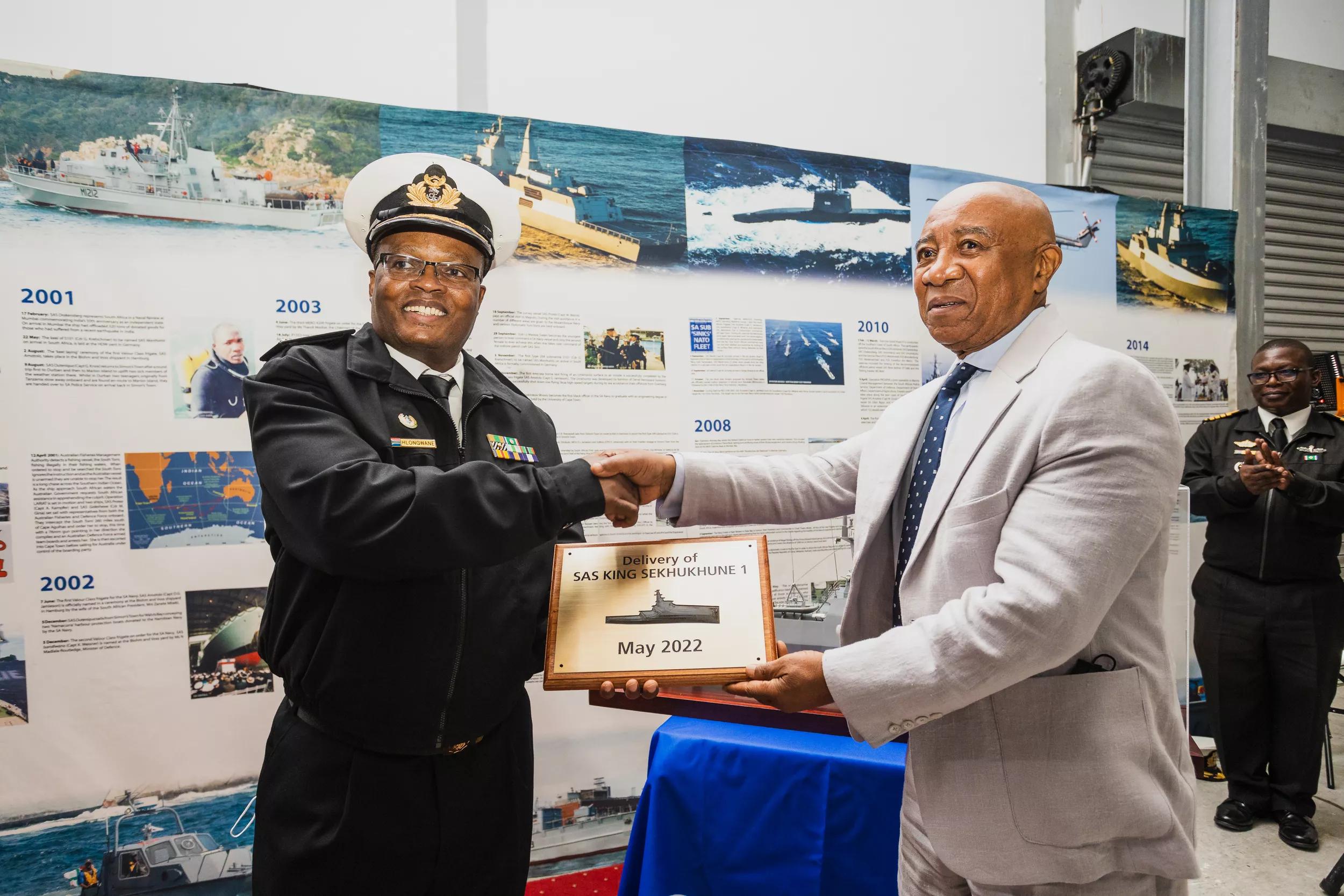 From right to left: DSCT Board Member, Mr Sam Montsi, hands over a delivery token to Vice Admiral Mosuwa Samuel Hlongwane, Chief of South African Navy