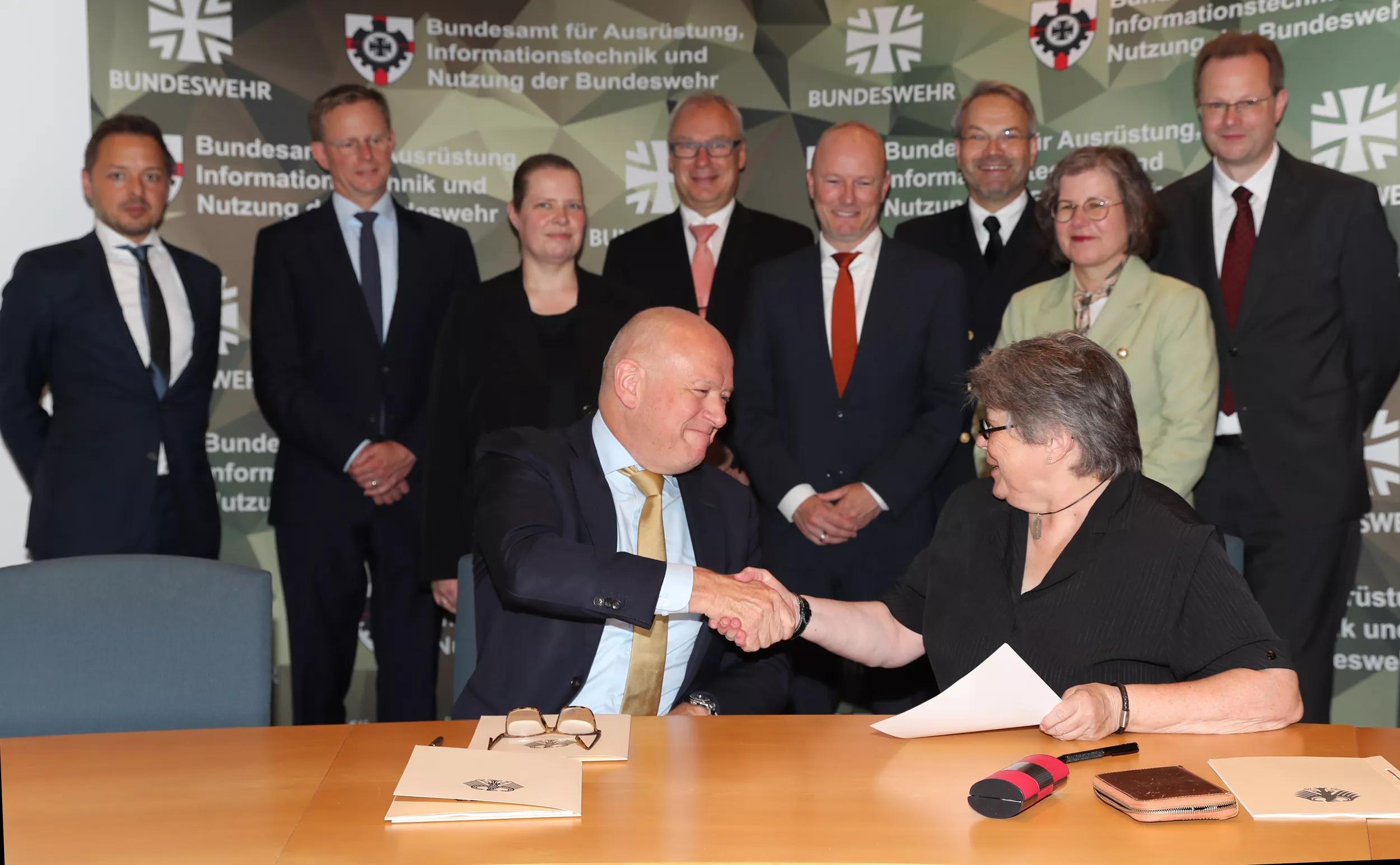 Behind them from left: Niko Oertel (Damen Naval), Magiel Venema (Damen Naval), Kathrin Rohloff (Damen Naval), Rudolf Braun (BAAINBw), Frank Verhelst (Damen Naval), Andreas Czerwinski (BAAINBw), Claudia Baldus (BAAINBw), and Stefan Maier (BAAINBw)