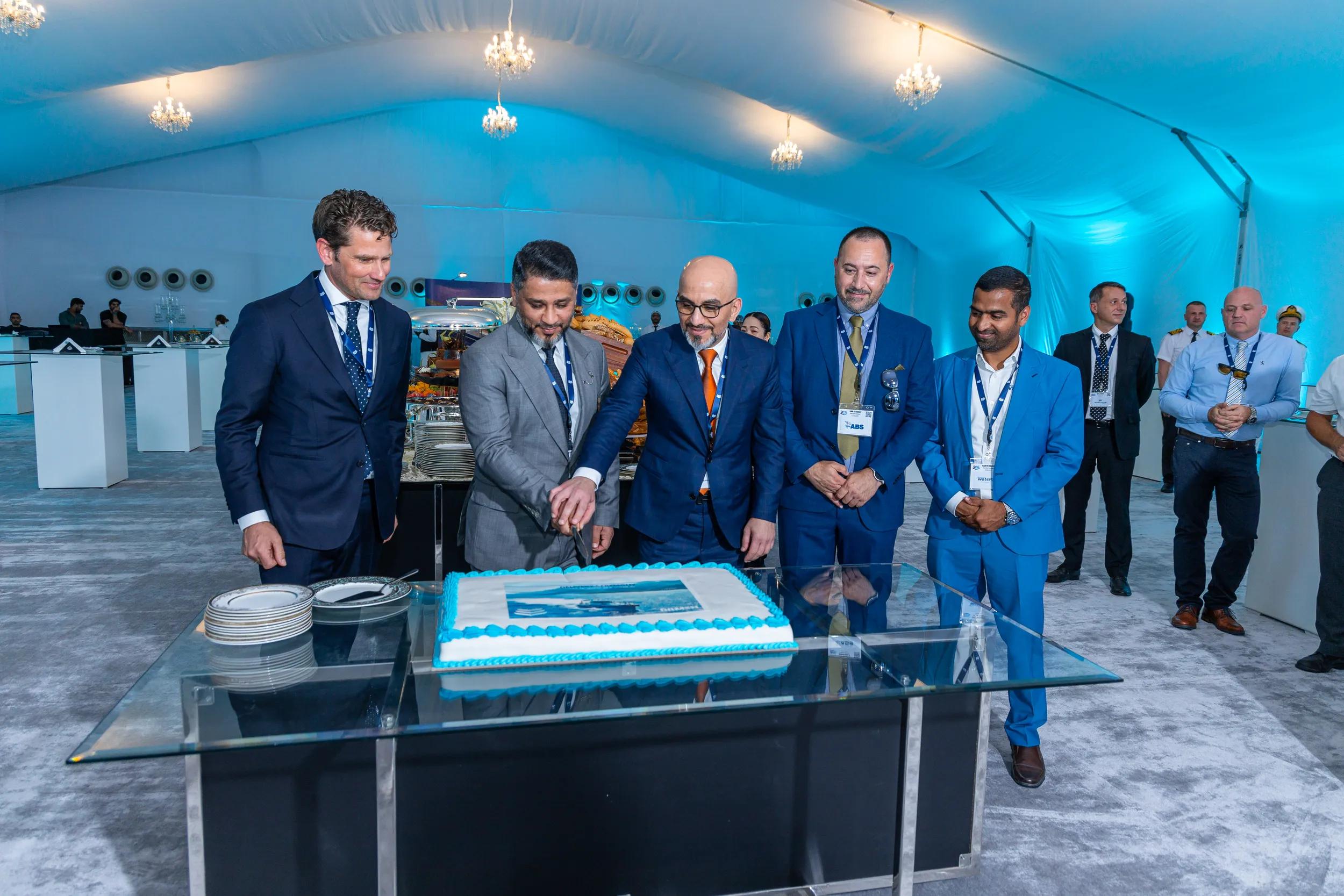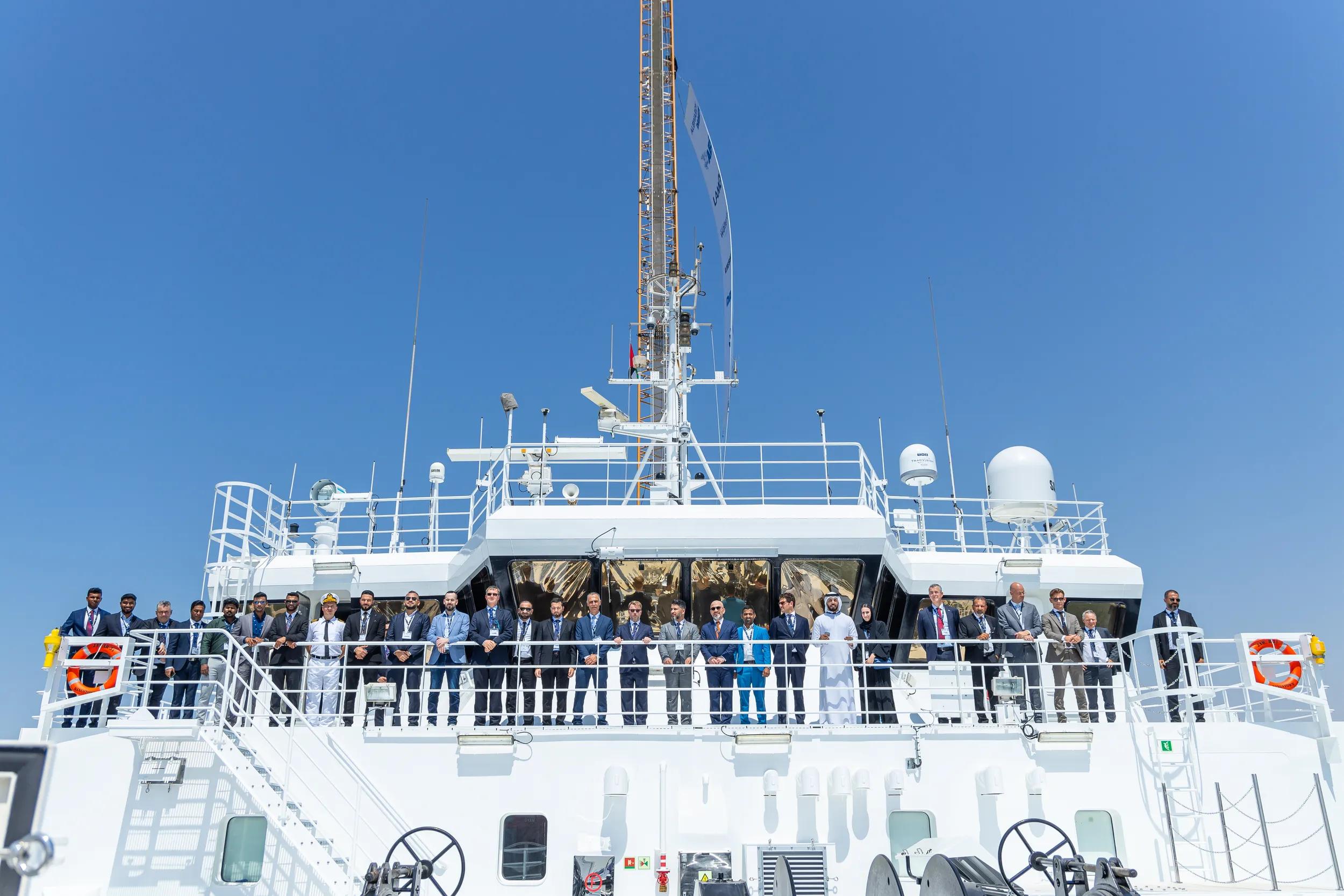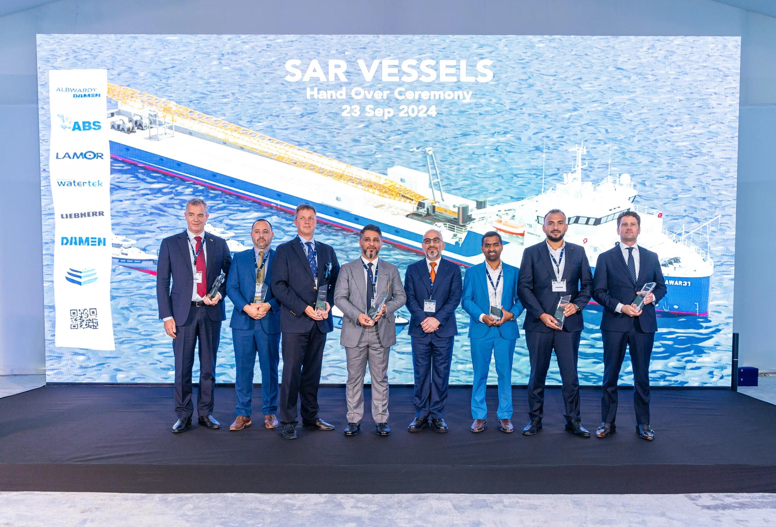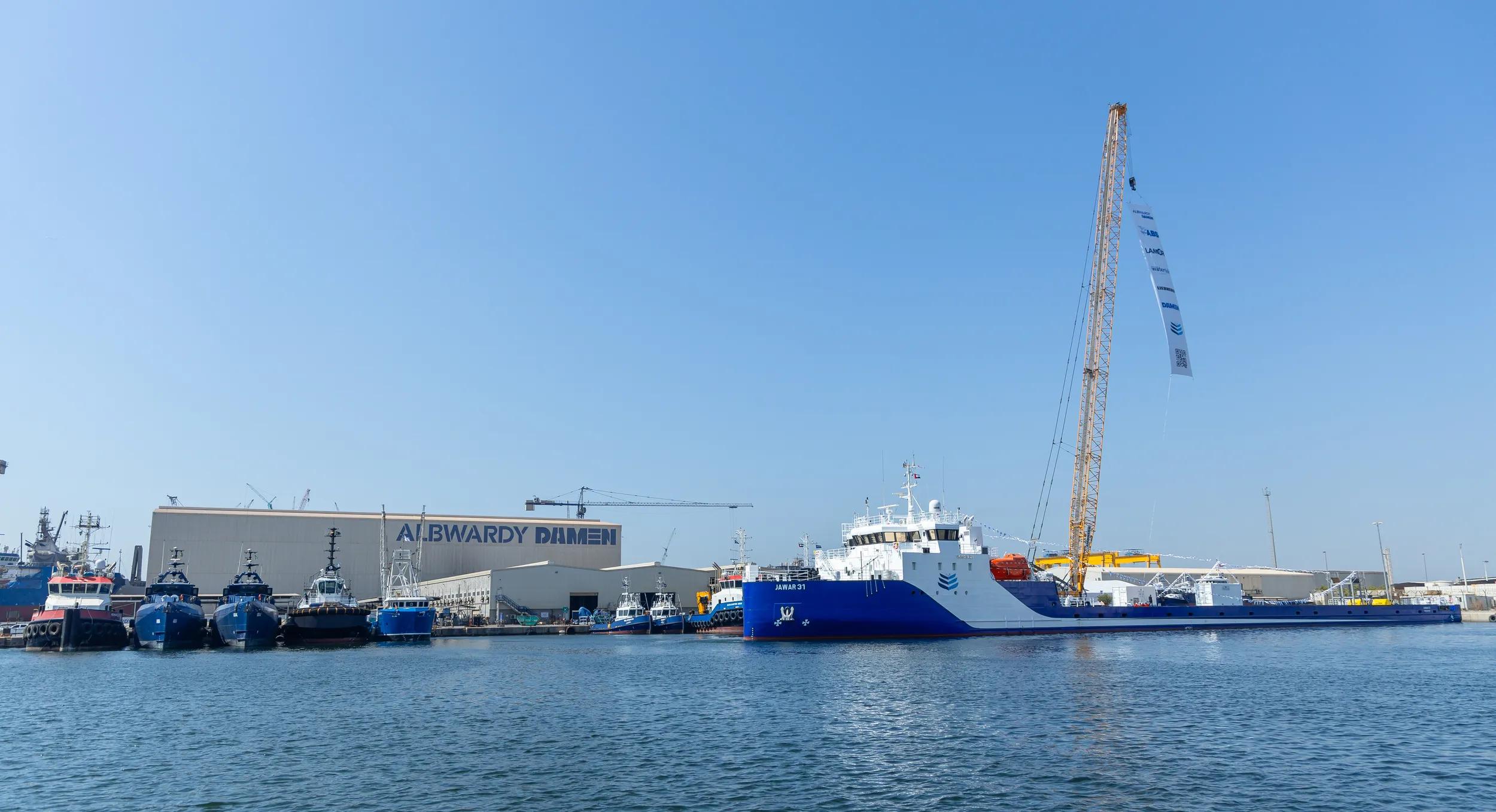 The hand-over ceremony was arranged by Jawar Al Khaleej with all the key suppliers invited including Liebherr (cranes), Lamor (oil recovery equipment), ABS (class society), Watertek, Albwardy Damen (new building, ship repair and conversions) and Damen, to celebrate the collaboration of all the involved parties and the successful delivery.