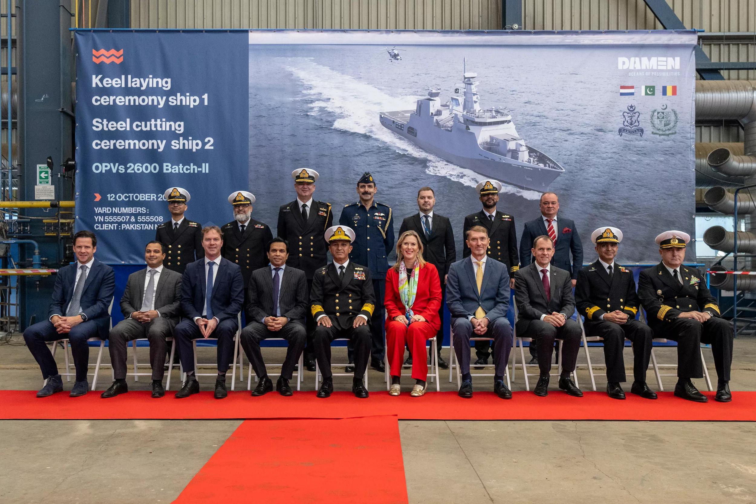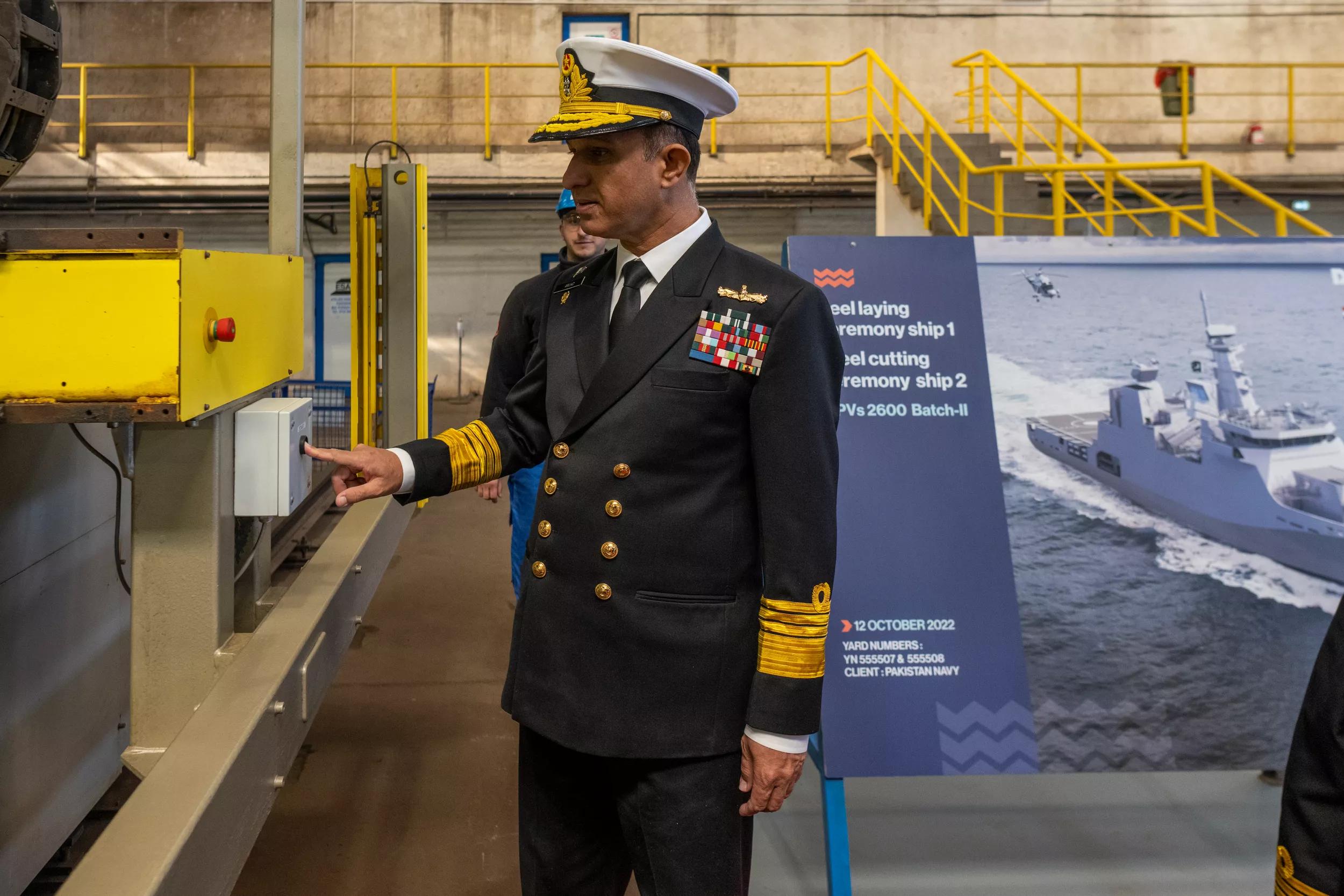 Celebrating the start of the construction of a second batch of two Offshore Patrol Vessels for the Pakistan Navy, the Chief of the Naval Staff Admiral Muhammad Amjad Khan Niazi performed the initial welding work on the keel of the first vessel at Damen Shipyards Galatí on October 12th 2022. Mrs Annelies Damen, Member of the Supervisory Board, welcomed the Admiral and his delegation on behalf of the Damen family for a celebration of the continued co-operation.