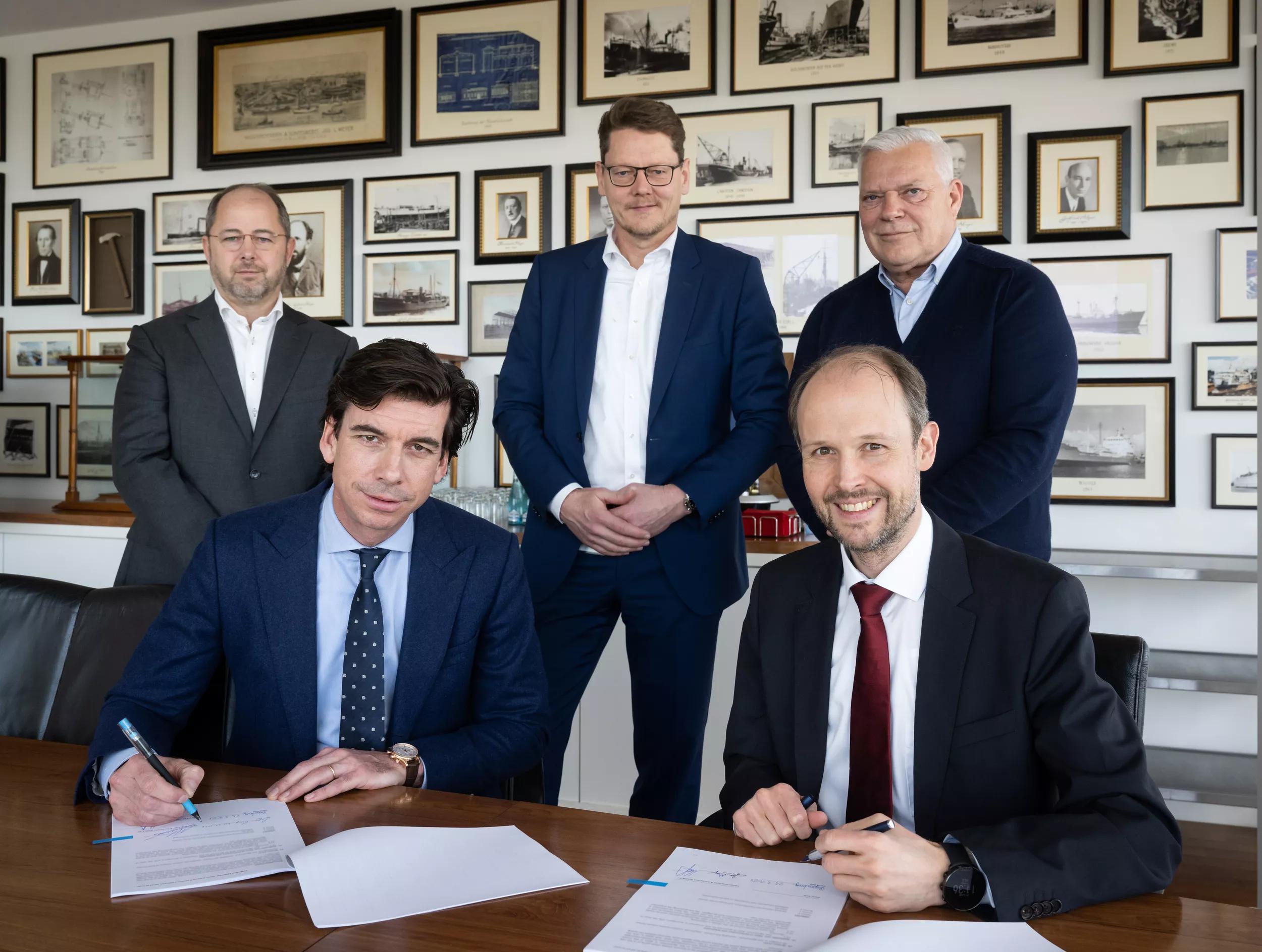 On the photo from left to right: Bas Loohuis (Commercial Director of Damen Shiprepair & Conversion Holding BV), Jeroen Heesters (Managing Director of Damen Shiprepair & Conversion Holding BV), Alexander Höfling (Managing Director of MEYER RE.), Jan Meyer (Managing Director of MEYER WERFT), Rogier van der Laan (Sales Manager Cruise of Damen Shiprepair & Conversion Holding BV).