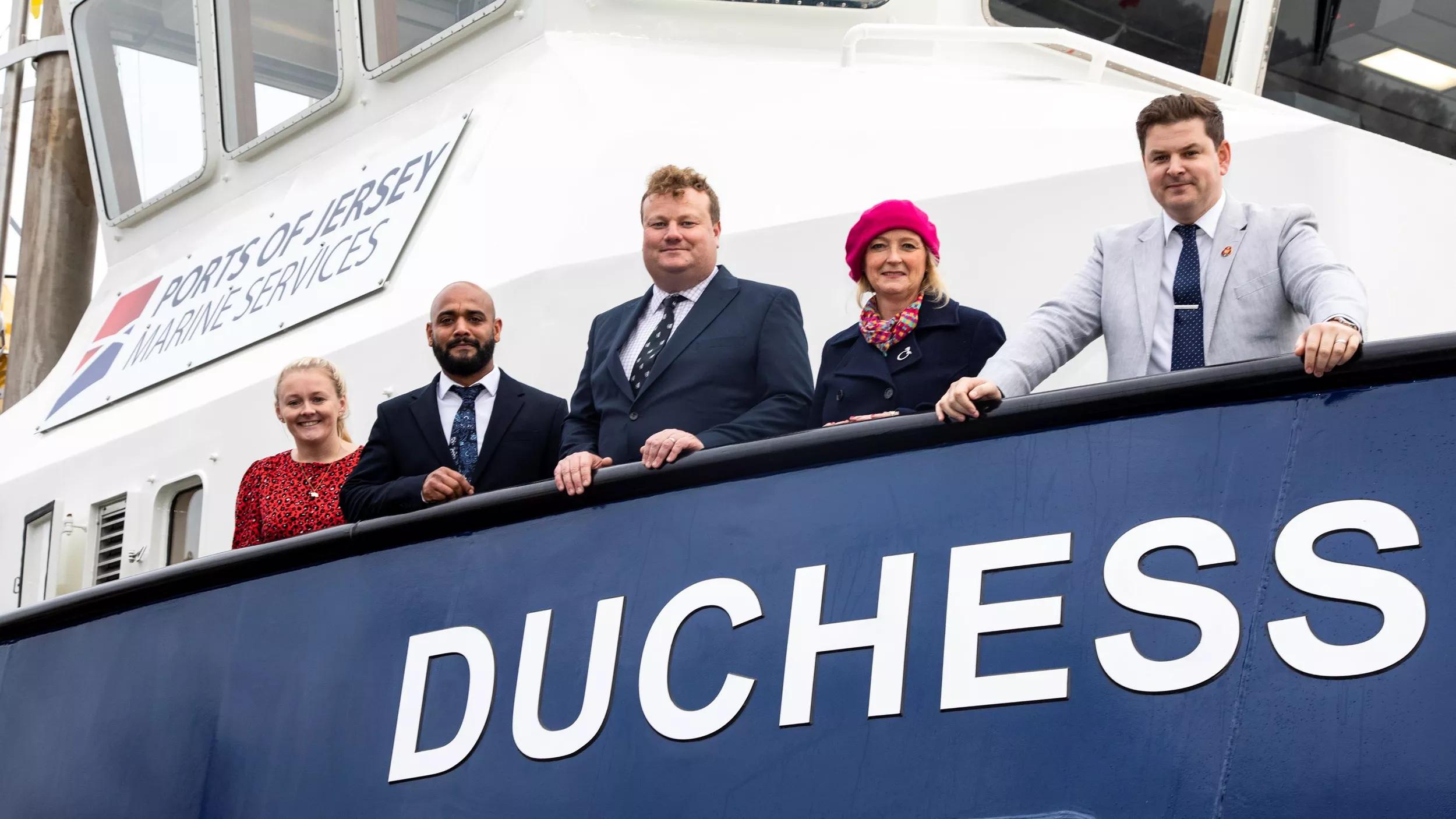 On the photo from left to right: Fleur Moisan (Business Operations Manager, Ports of Jersey), Donford Nicholas (Head of Marine Services, Ports of Jersey), Bill Sadler (Jersey Harbour Master and COO Marine, Ports of Jersey), Fiona Planterose (Head of Group Procurement, Ports of Jersey), Aaron Gavey (Head of Group Technical Services, Ports of Jersey)
