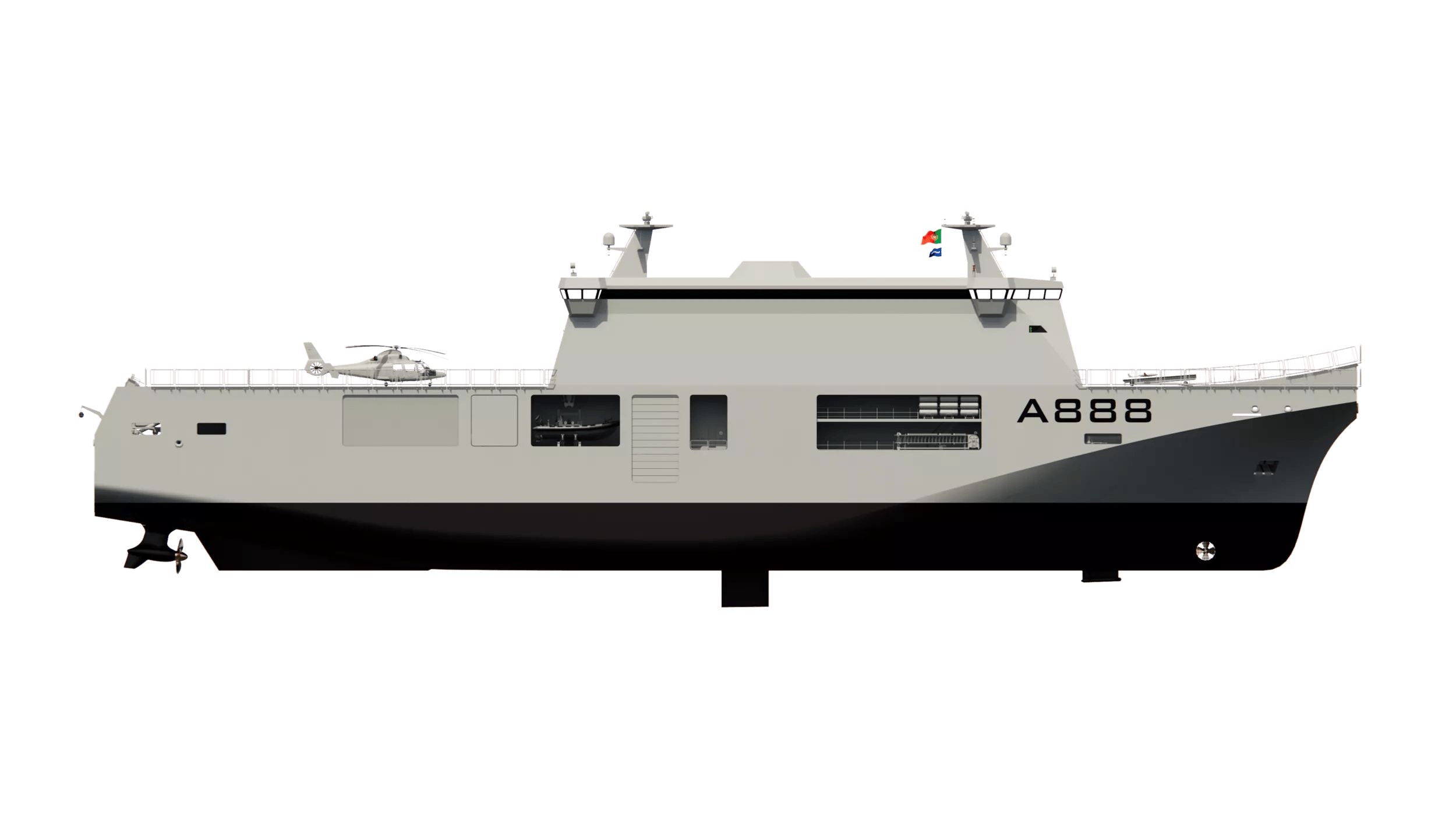 The new vessel will be classified by the Portuguese Navy as a Multifunctional Naval Platform (PNM). To fully match this vessel designation, Damen has collaborated closely with the Portuguese Navy to incorporate future-versatility into the design. This consists of a 650m2 cargo deck and space for twelve 20-foot containers. Modular systems such as containerised hospital facilities, hyperbaric chambers, or ROV equipment can therefore be installed as required.