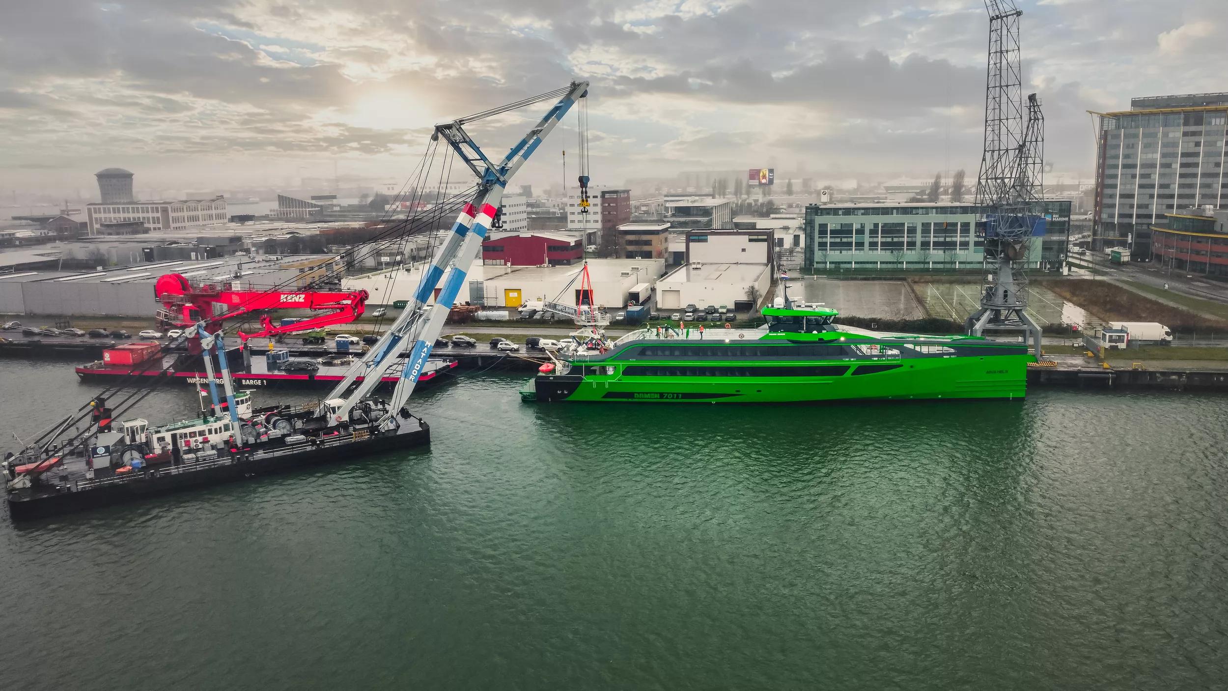 The last phase of the commissioning of the first of Damen’s ground-breaking Fast Crew Supplier (FCS) 7011 class – the Aqua Helix - is now underway with its Ampelmann gangway installed and integrated with the ship’s systems during the last days of 2021.