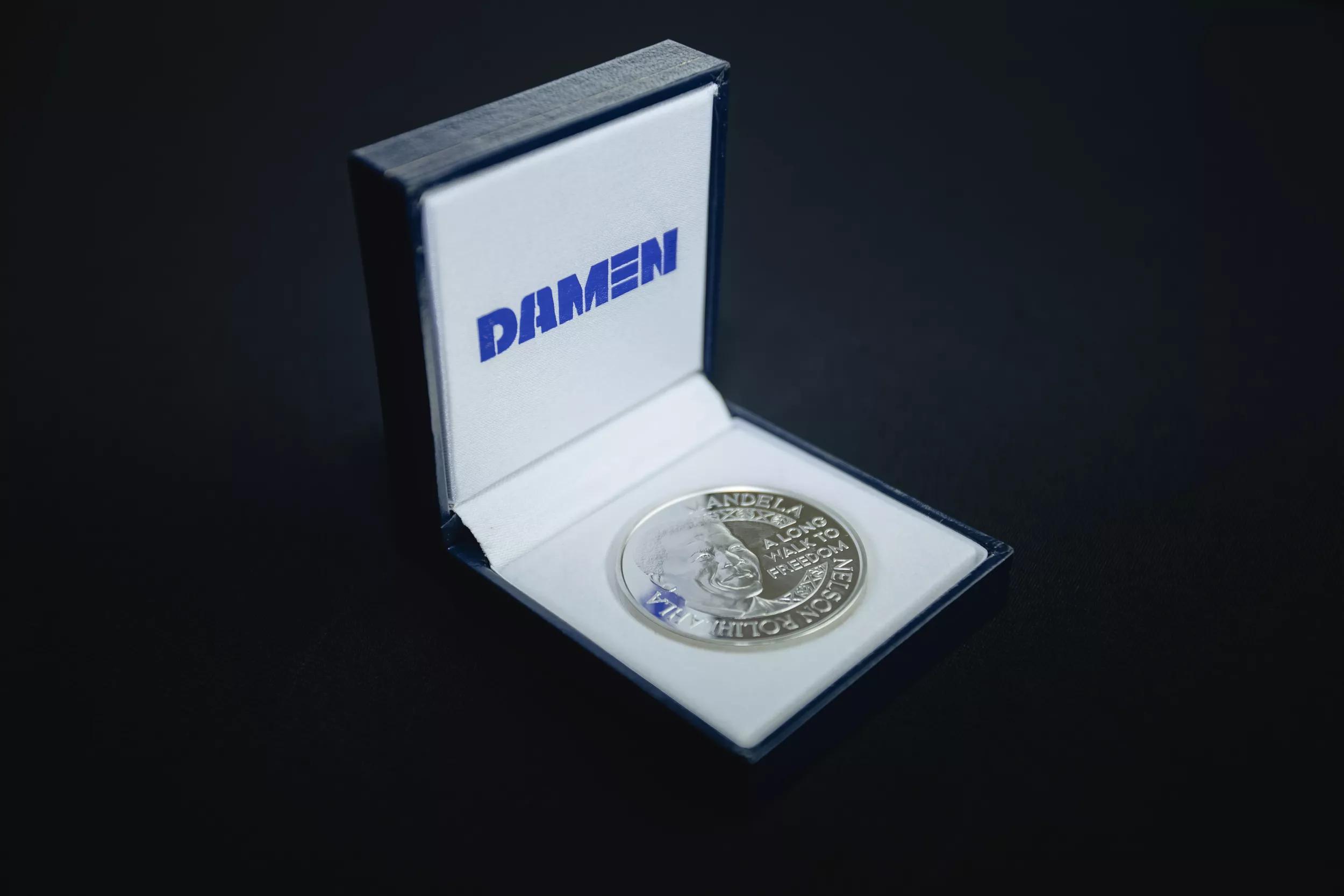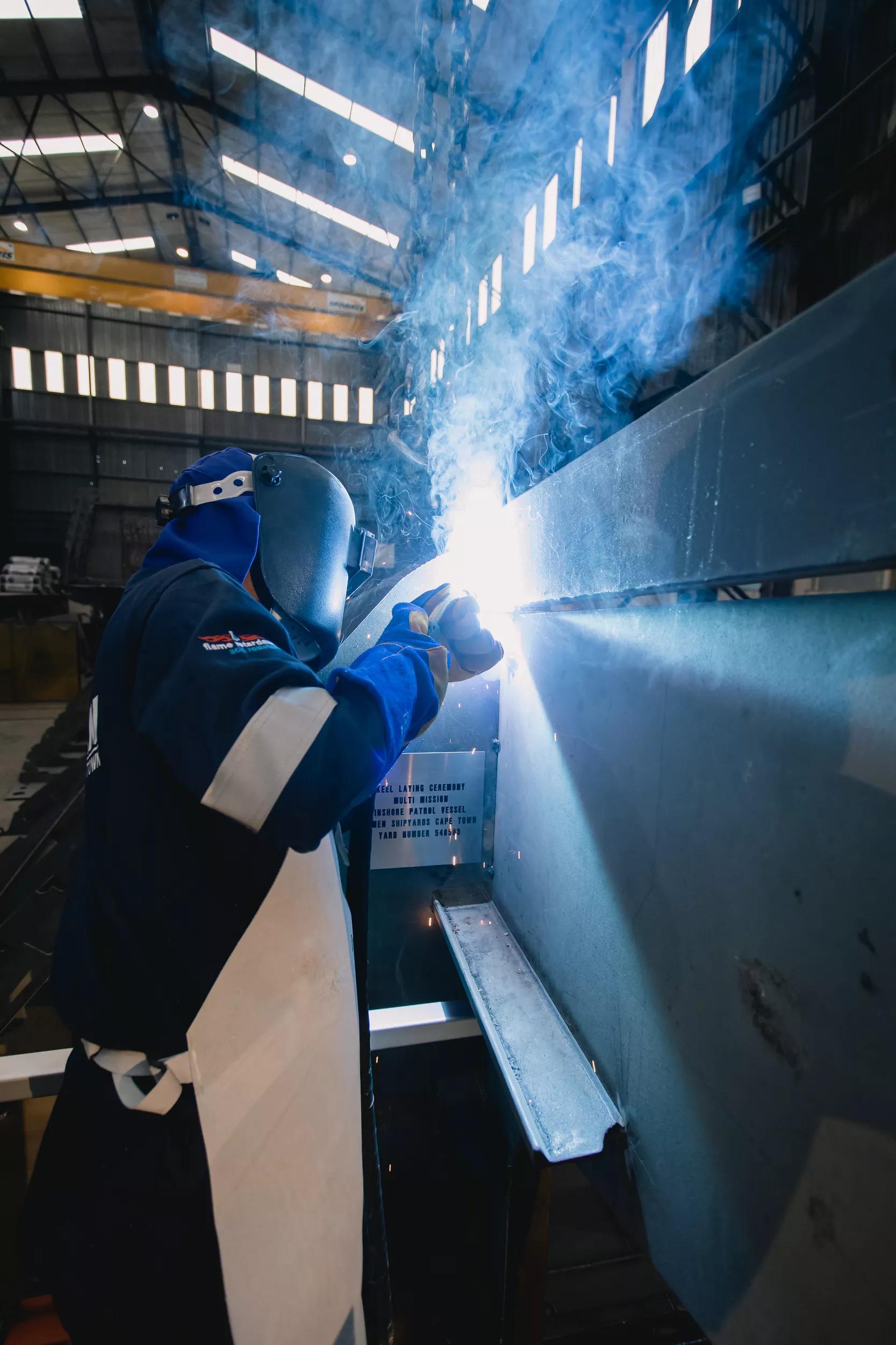 The coin laid at the DSCT event was a commemorative medal made in honour of the late President Nelson Mandela’s 1993 Nobel Peace Prize win. The coin was placed on the keel by the Chief of the Navy (Vice Admiral Hlongwane). The keel bar was then lowered on top of the coin and welded into the structure – a privilege that went to Lucian Norman, from Atlantis, who is one of the top performing second-year apprentices at Damen’s training school. The school has, since its inception in 2010, educated more than 200 young people previously from disadvantaged communities.