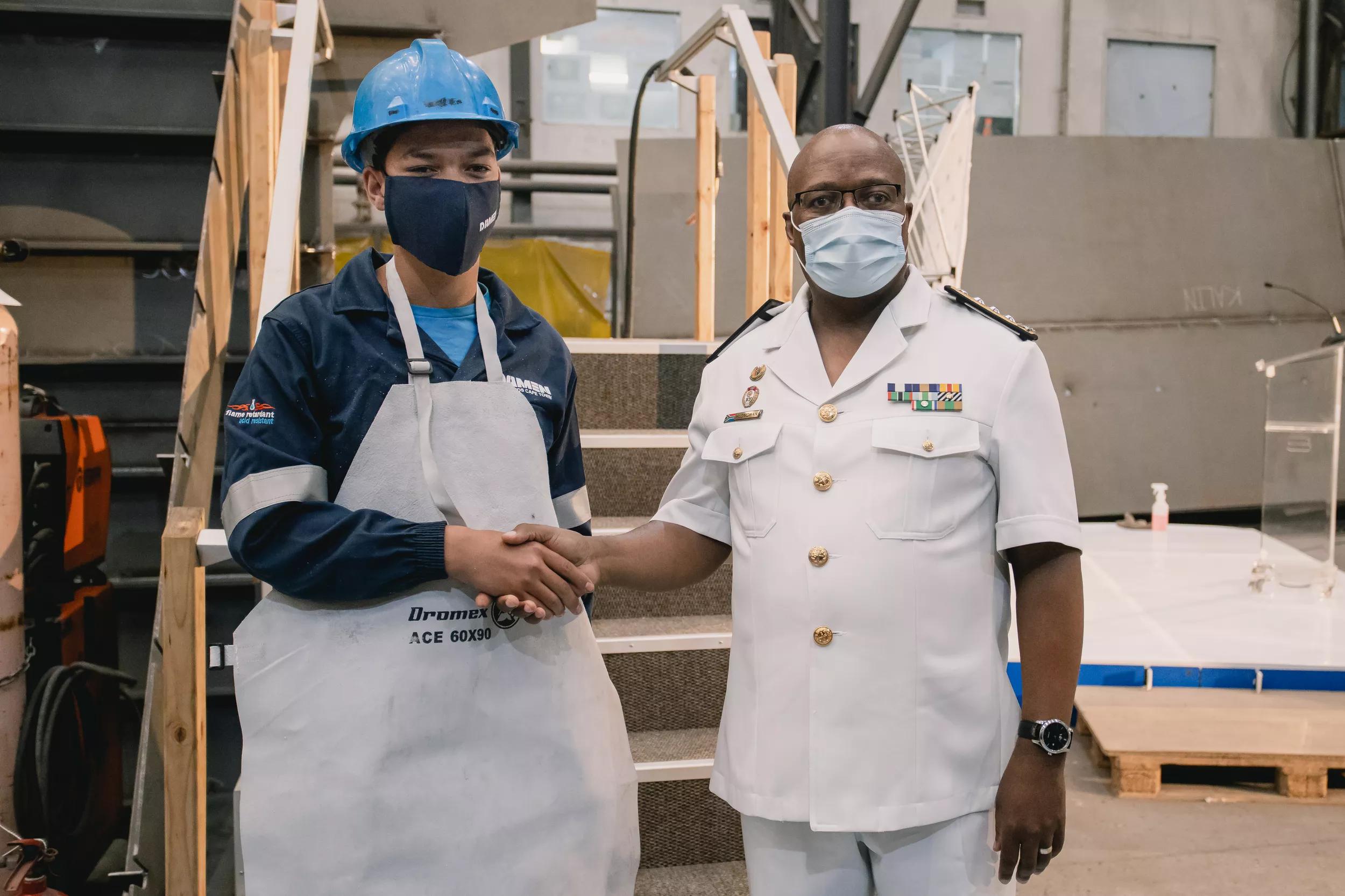 On the photo from left to right: Ceremonial Welder Lucian Norman, a second-year apprentice at Damen Shipyards Cape Town Training Centre, shakes hands with Speaker Vice Admiral Mosuwa Samuel Hlongwane, Chief of South African Navy
