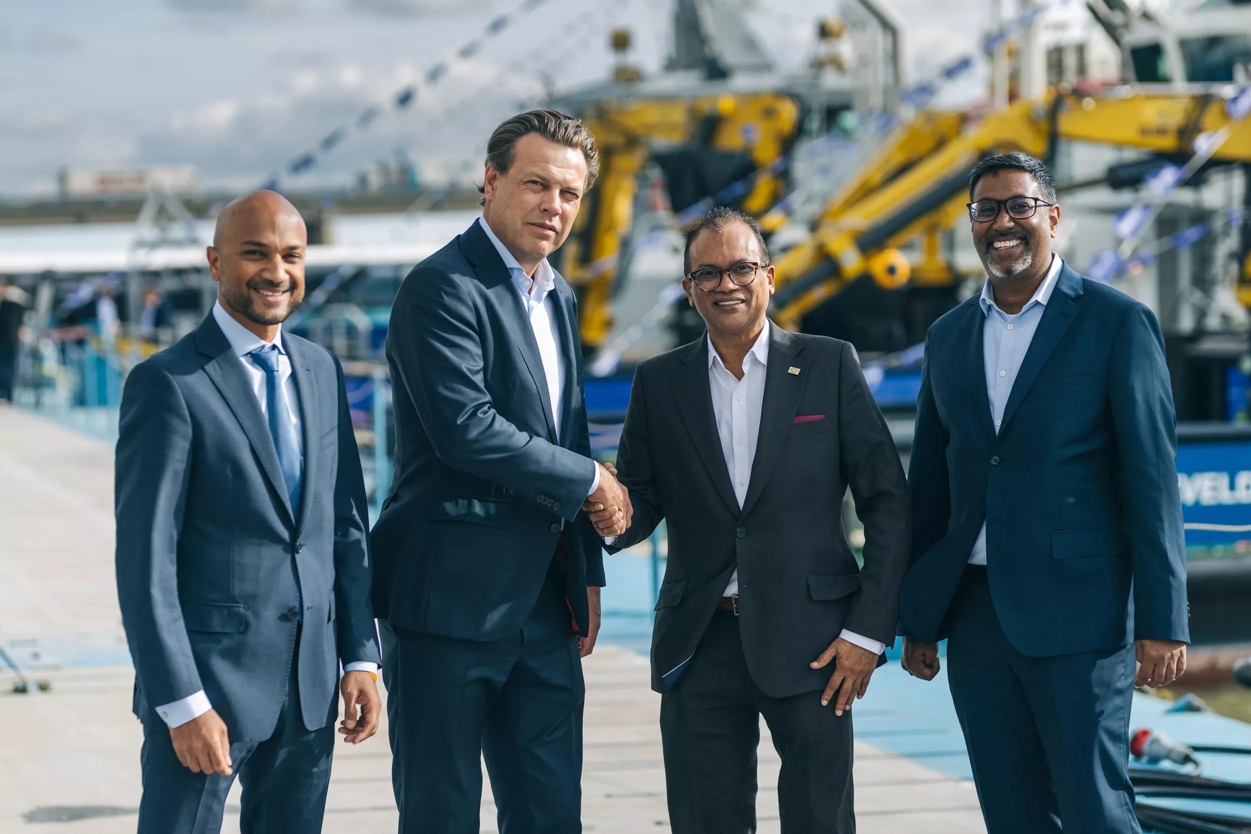 On the top image from left to right: Rabien Bahadoer (Damen Regional Sales Director Asia Pacific), Arnout Damen (Damen Chief Executive Officer), Shano Sabar (Deputy Managing Director of Advantis Group), Surindha de Abrew (Director/CEO of Sri Lanka Shipping Company)