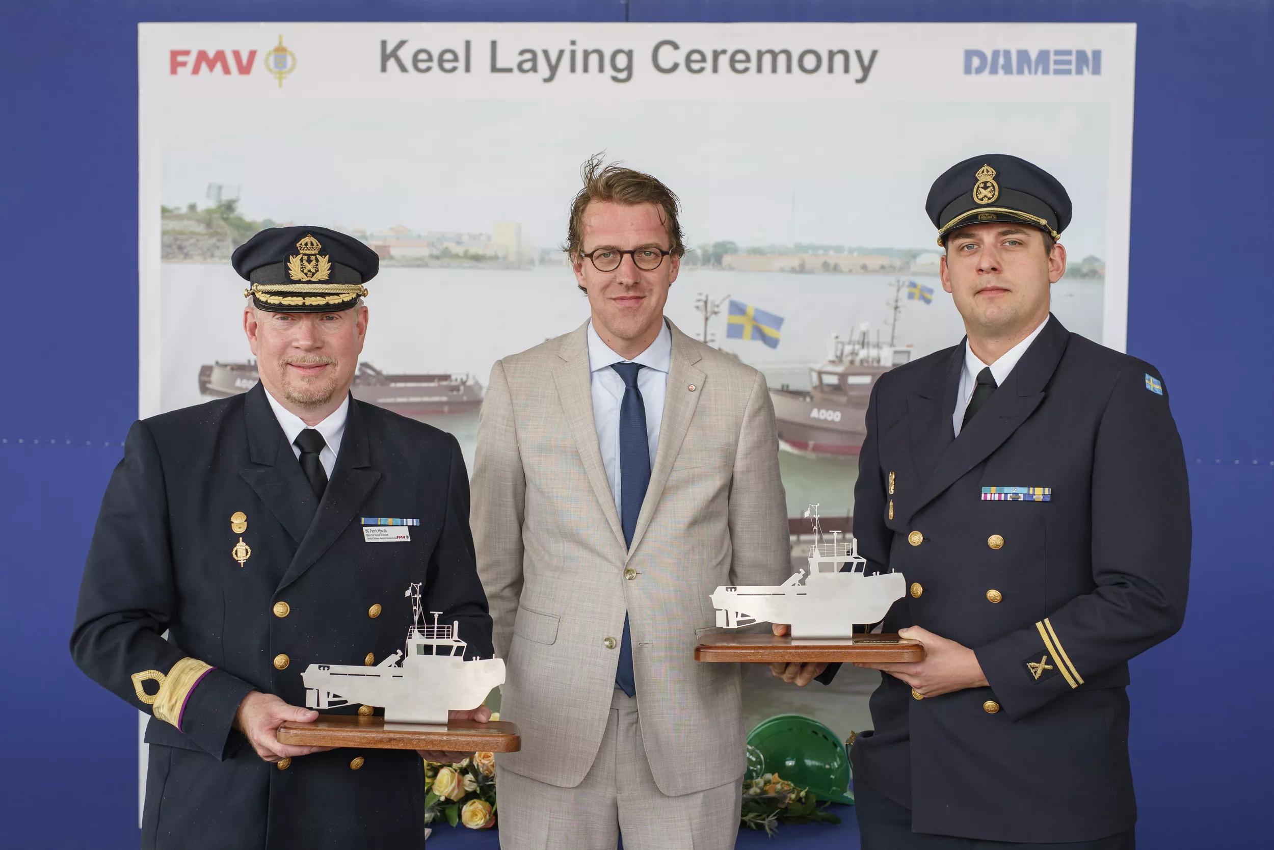 From left to right: General Patric Hjorth (Director Naval Division at FMV), Martin Verstraaten (Sales Manager of Damen Shipyards) and Jon Mether (Staff Sergeant of the Swedish Navy).