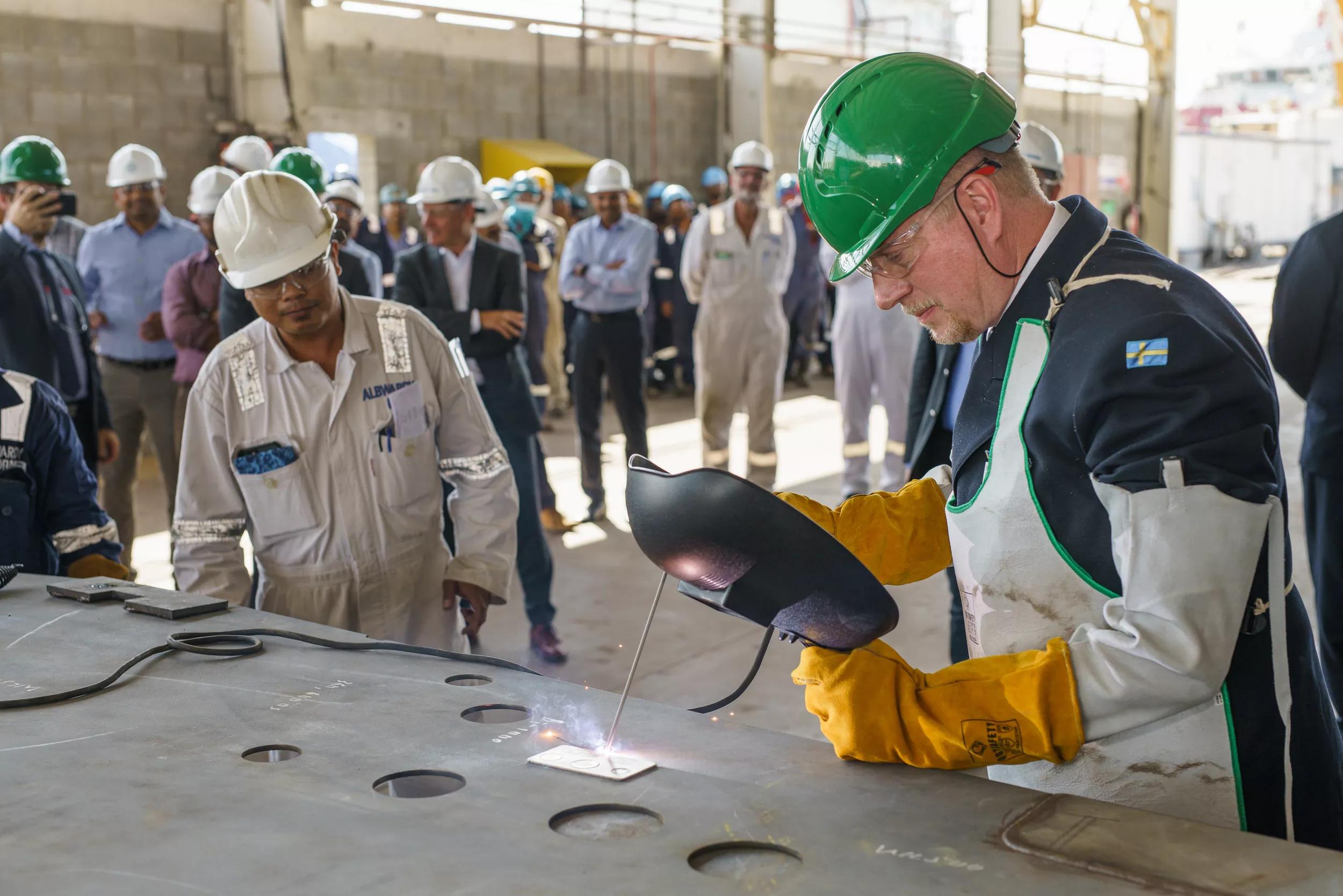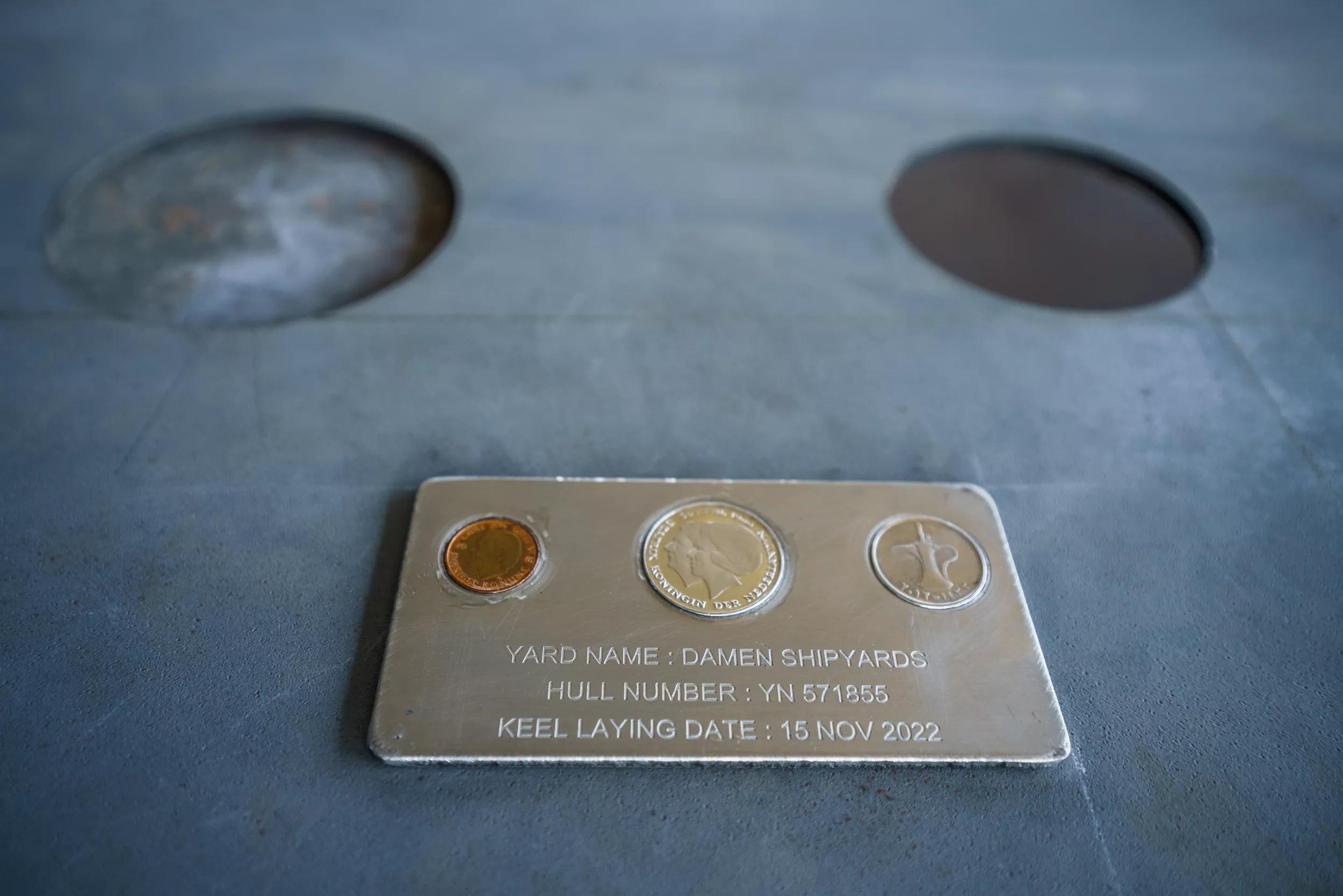 The ceremony started with three coins placed in a stainless steel plate: a Swedish Crown, a Dutch Rijksdaalder and an Emirates Dirham. This symbolises the co-operation of the three countries in manufacturing the special tugs. The plate with the coins was then welded by General Hjorth to the hull construction.
