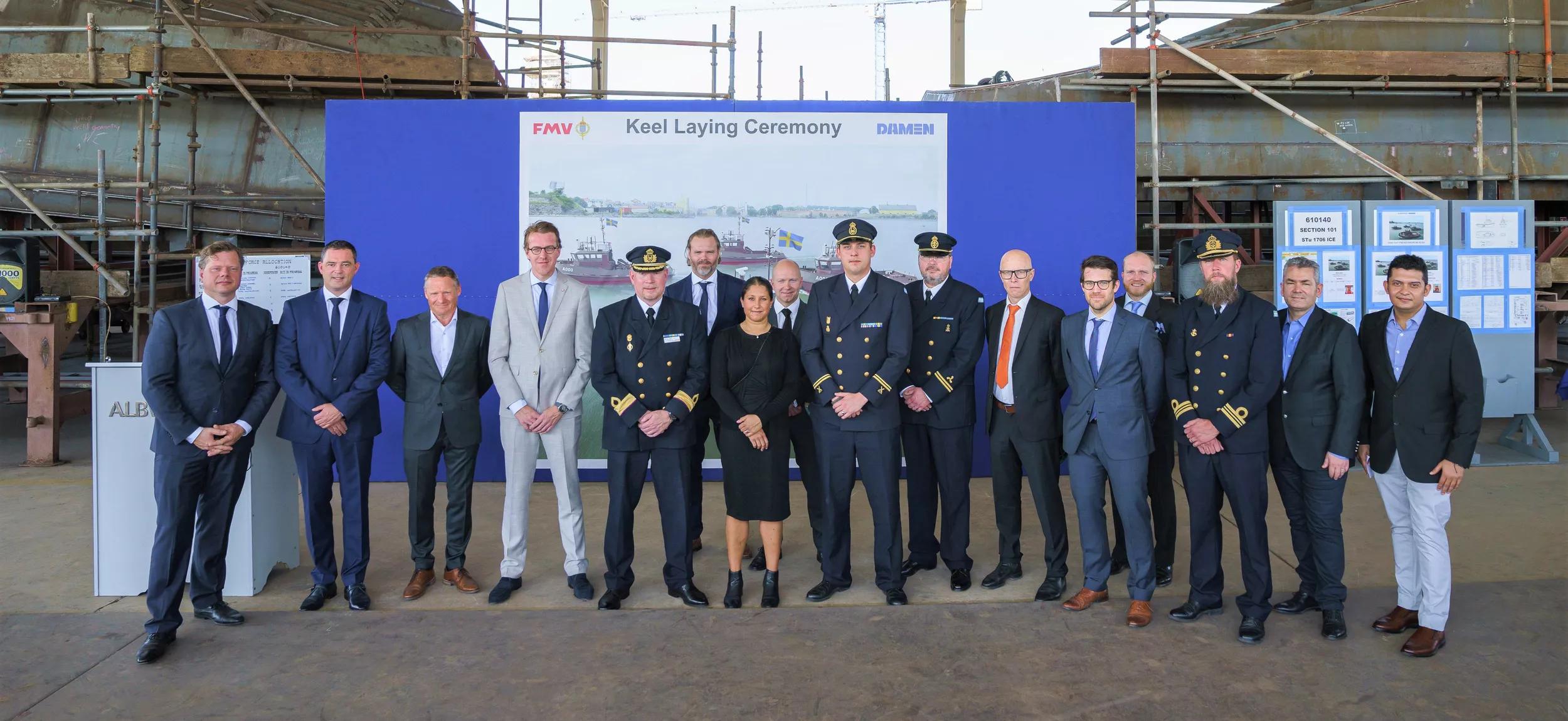 Swedish Defense materiel organization FMV Director Naval Division Patric Hjorth performed the keel laying ceremony for the series of Stan Tug 1706 ICE vessels at Albwardy Damen. Four customised ice class harbour tugs are under construction for the Swedish Navy to be delivered to Sweden starting in 2023.