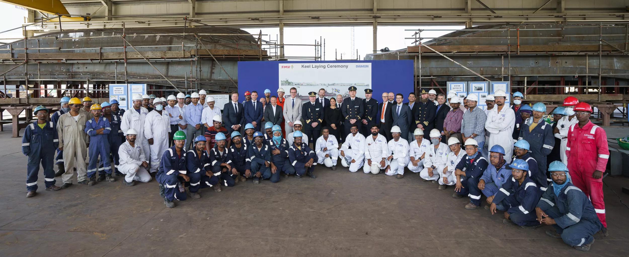 On the top image from left to right: Roel Foolen (Project Manager Damen Shipyards Hardinxveld), Leon Fijnekam (Contract Manager Damen Shipyards Hardinxveld), Lars Seistrup (Managing Director Albwardy Damen), Martin Verstraaten (Sales Manager Damen Shipyards), General Patric Hjorth (Director Naval Division at FMV), Lars Bengtsson (Product Manager at FMV), Susanne Nordman (Project Manager at FMV), Marten Ternby (Naval Architect at FMV), Jon Mether (Staff Sergeant Swedish Navy), Petter Ruthblad (Chief Petty Officer Swedish Navy), Hans Frössén (Unit Manager at FMV), Daniel Zachrisson (Naval Architect at FMV), Henrik Persson (Lieutenant Commander Swedish Navy), Marius Ghinea (New Building Director at Albwardy Damen) and Sai Gopinath (Project Manager at Albwardy Damen).
