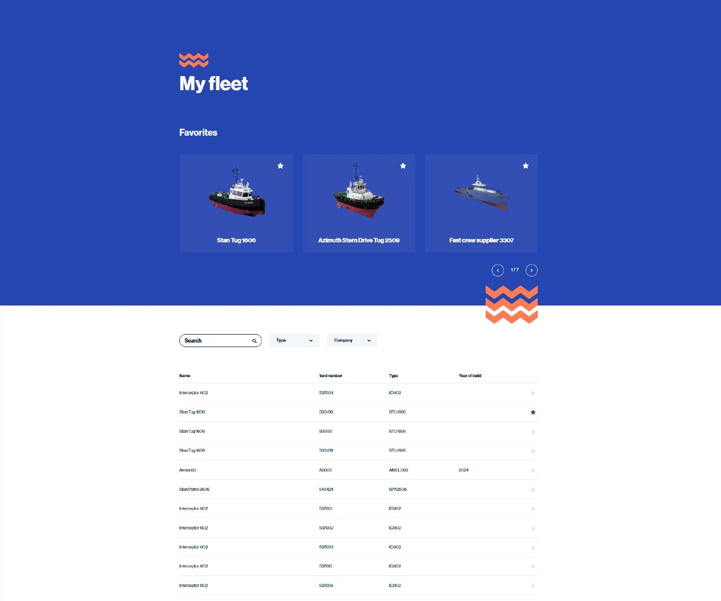 My fleet provides an overview of all Damen vessels in your fleet. It gives access to detailed vessel information, onboard assets and related documentation. You can also request quotations for asset parts directly from the overview.