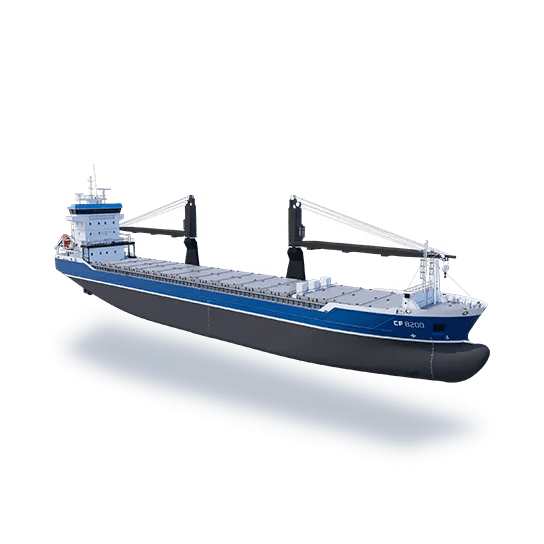 Based on the proven capabilities of our cargo vessel series, and incorporating the latest techniques and innovation, the Combi Freighter 8200 combines cargo versatility with optimal efficiency. Its hull is optimised to enable fuel efficient operations in diverse waters, including deep seas. The vessel is prepared for installation of a wide range of additional options in order to enhance its efficiency further. The result is a vessel suited to the needs of the maritime industry both today and tomorrow. The grain bulkheads in the box-shaped hold can be configured in multiple ways and features a tween deck to enable transportation of bulk and breakbulk cargoes at the same time. Cargo can be safely and precisely fastened with lashing eyes along the longitudinal bulkheads.