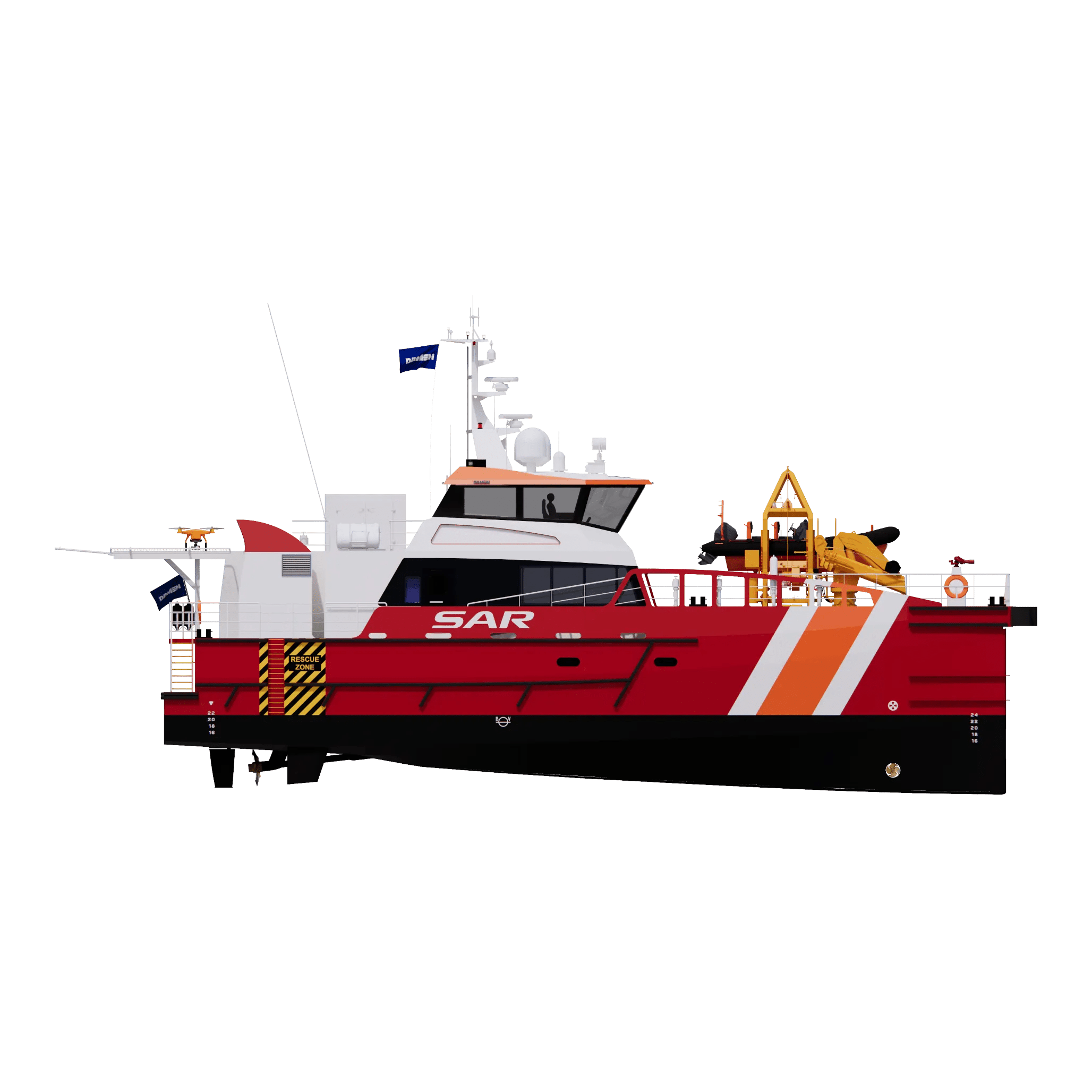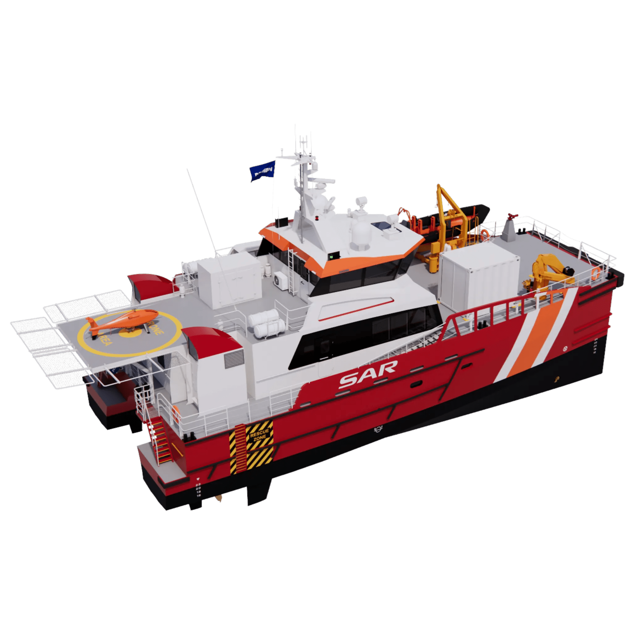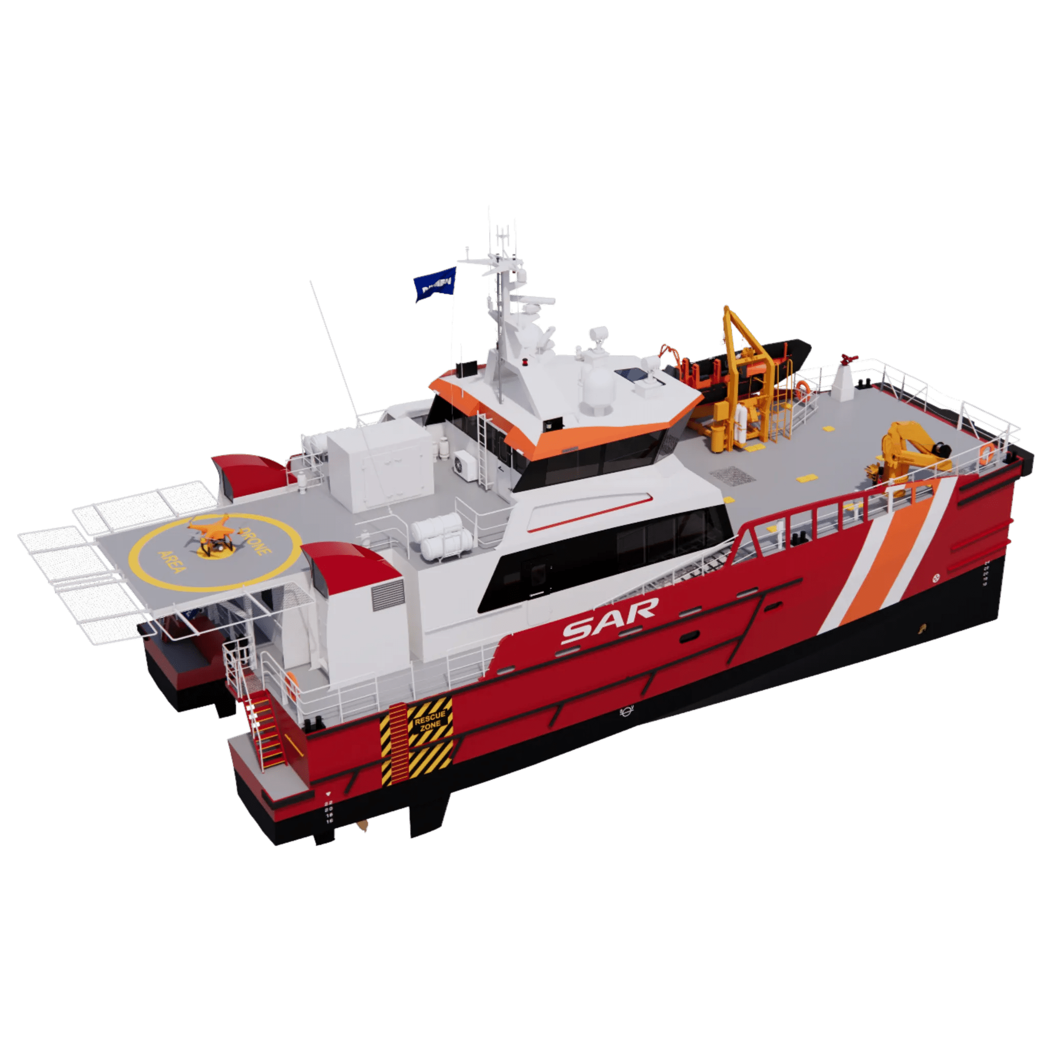 Damen’s Fast Crew Supplier 2710 SAR is an exceptionally capable platform for demanding offshore operations. Its advanced seakeeping performance and elevated wheelhouse position ensure a high level of operability, even in rough conditions. The spacious foredeck and flexible layout provide ample room for mission-specific equipment, while the comfortable interior supports safe and efficient transport of survivors. In addition, the proven Twin Axe hull design delivers low resistance and outstanding fuel efficiency across the vessel’s full speed range.