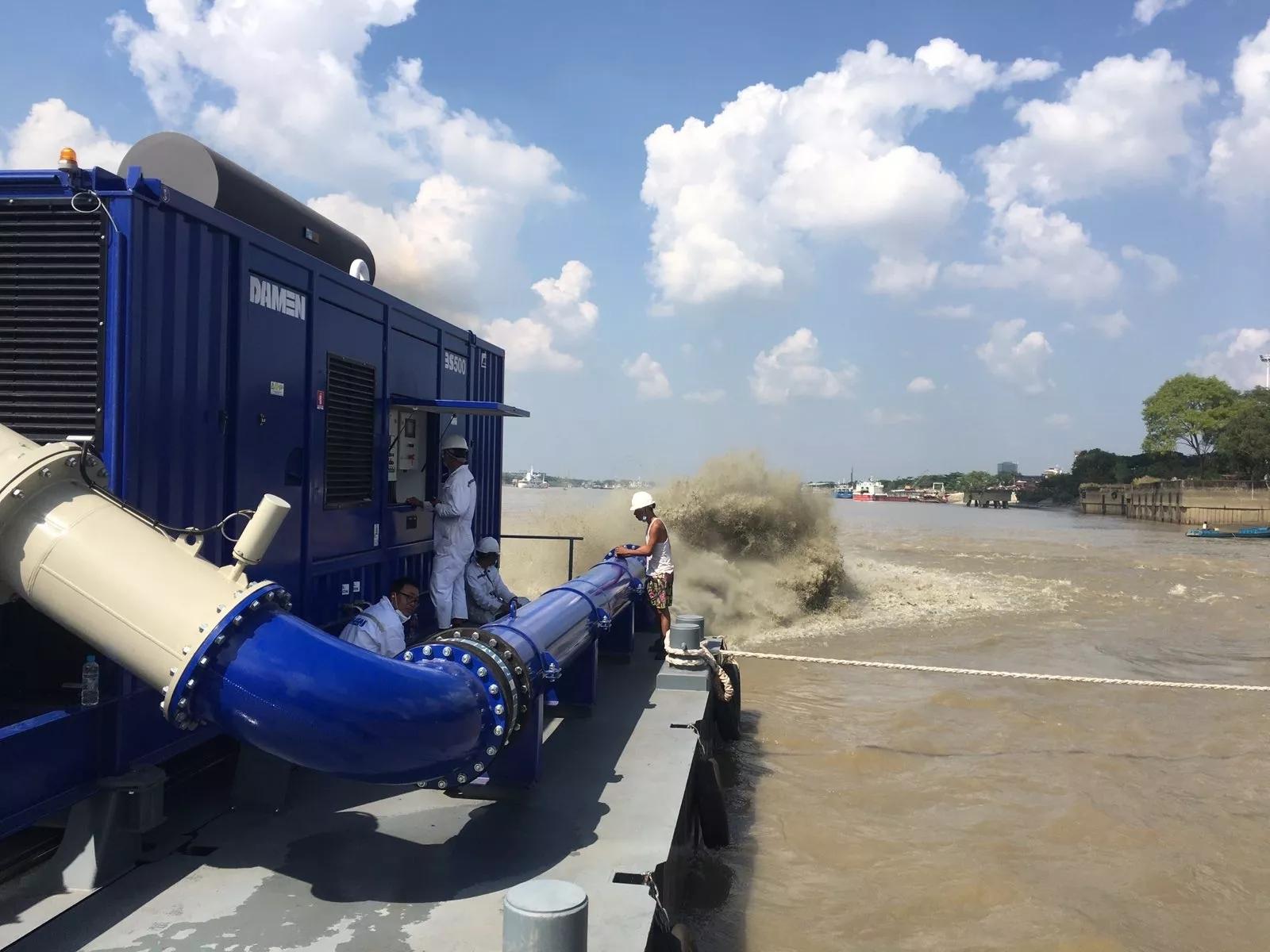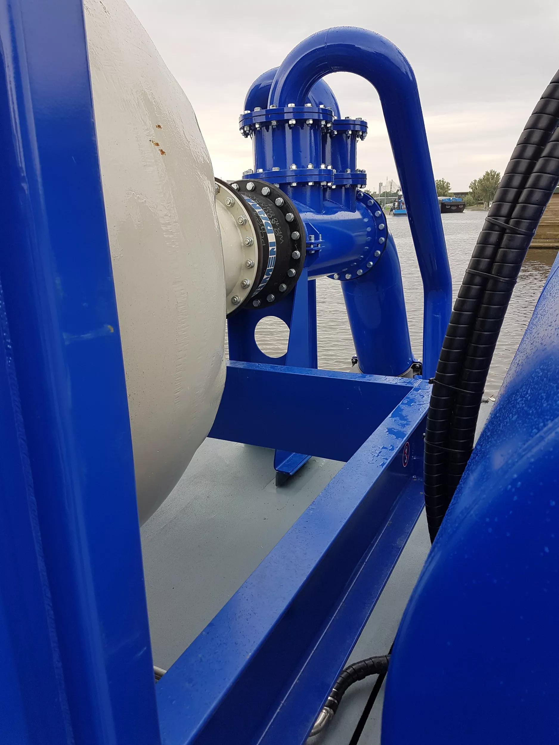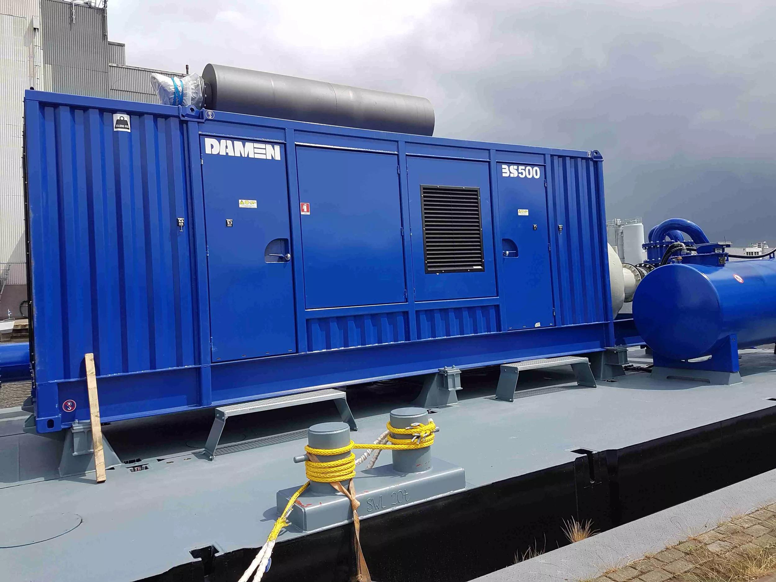 For this floating unit, a standard Booster Station BS500 has been used. It is powered by an IMO Tier III Caterpillar diesel engine of 954 kilowatts. The high efficiency Damen dredge pump has an impeller design of four double curved vanes, designed using the latest CFX technology.