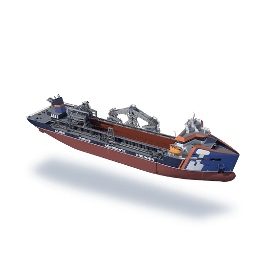 The Marine Aggregate Dredger is a specific type of Hopper Dredger, designed for efficient offshore mining of sand and gravel. The offshore bow provides excellent seakeeping behavior, and the accommodation and bridge on the foreship ensure safe and comfortable operations. For practical maintenance, the trailing suction system does not have hull penetration. A fully automated grab arranges efficient dry offloading.