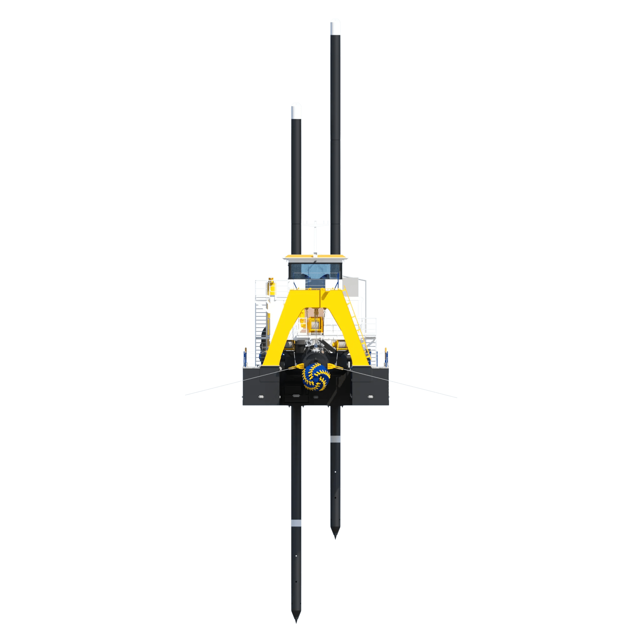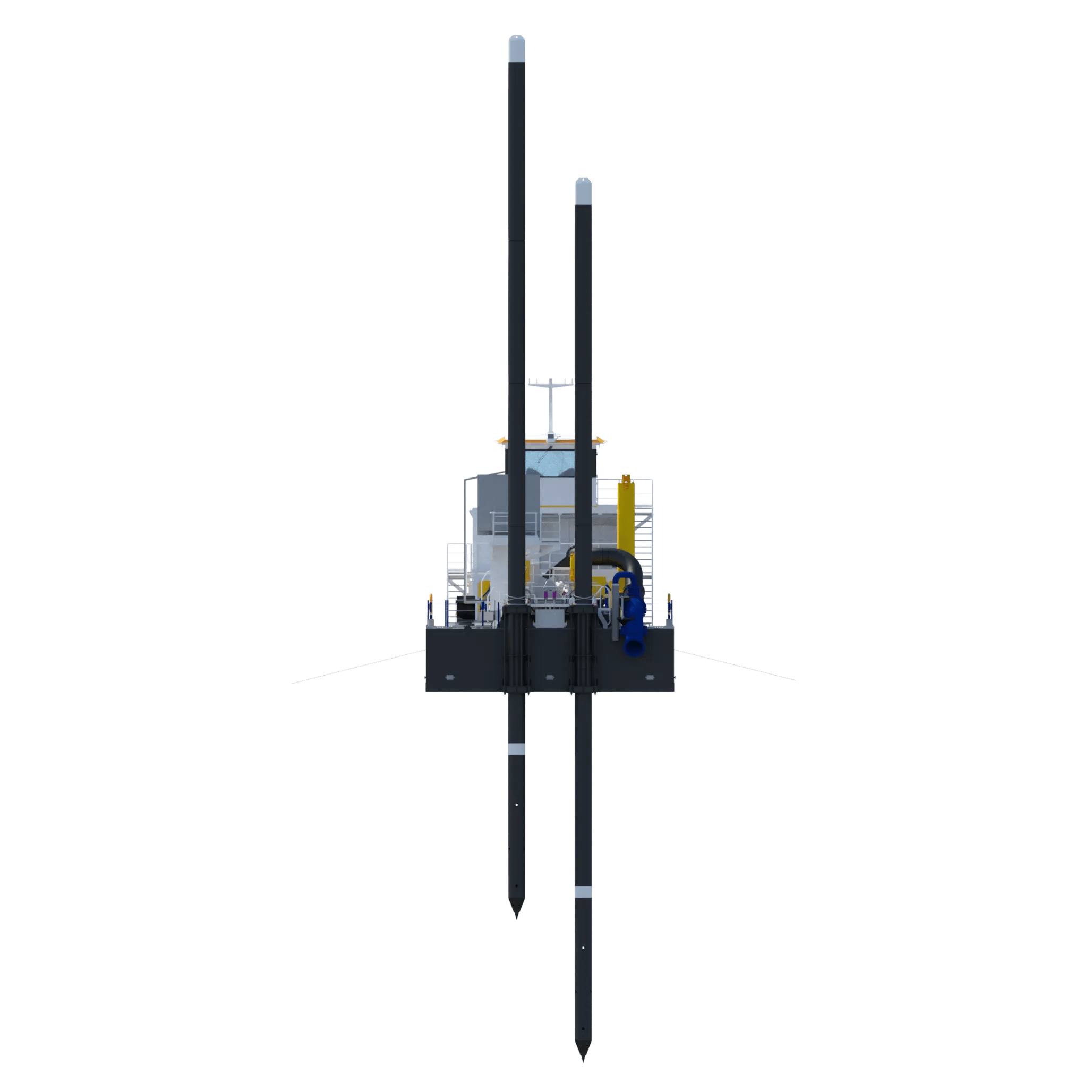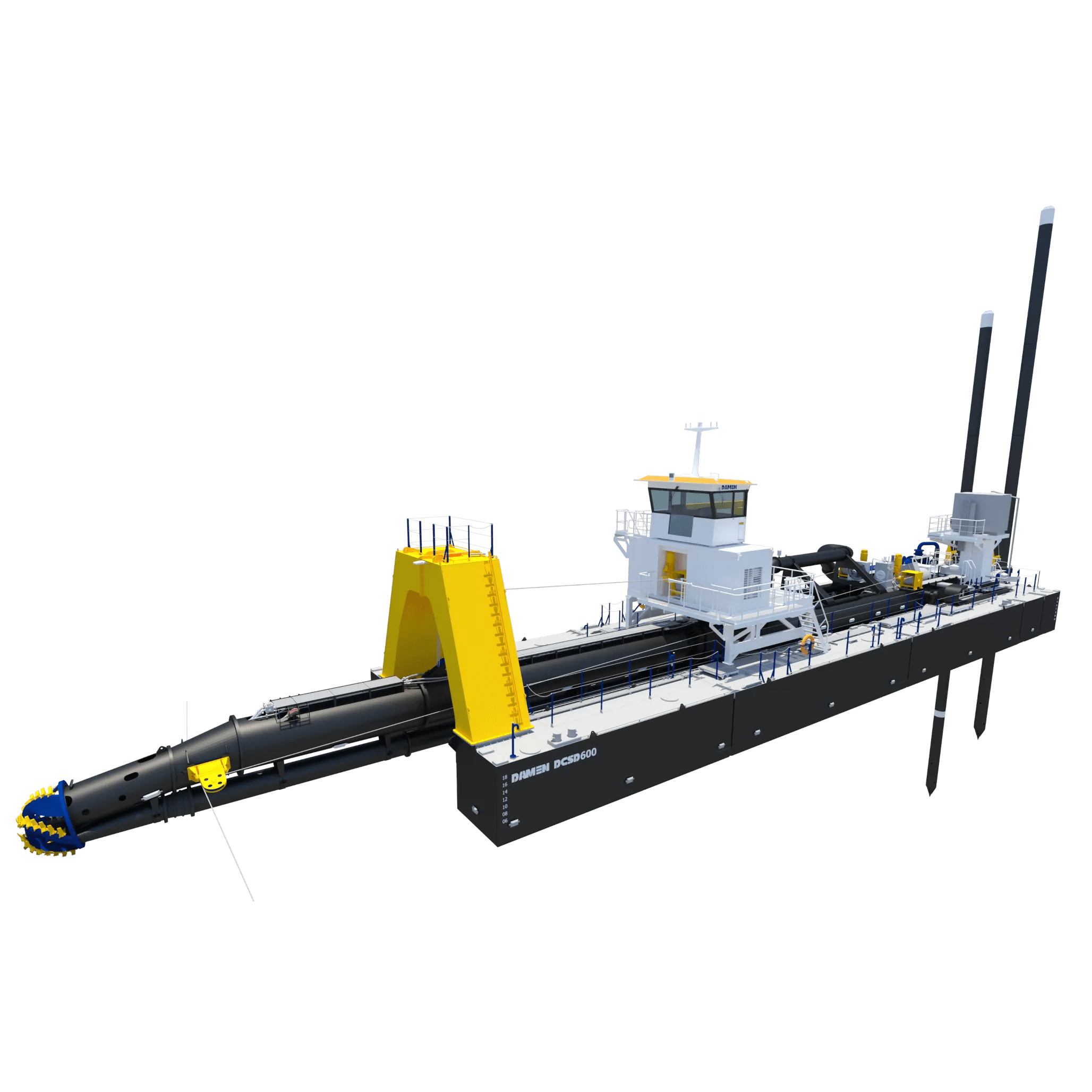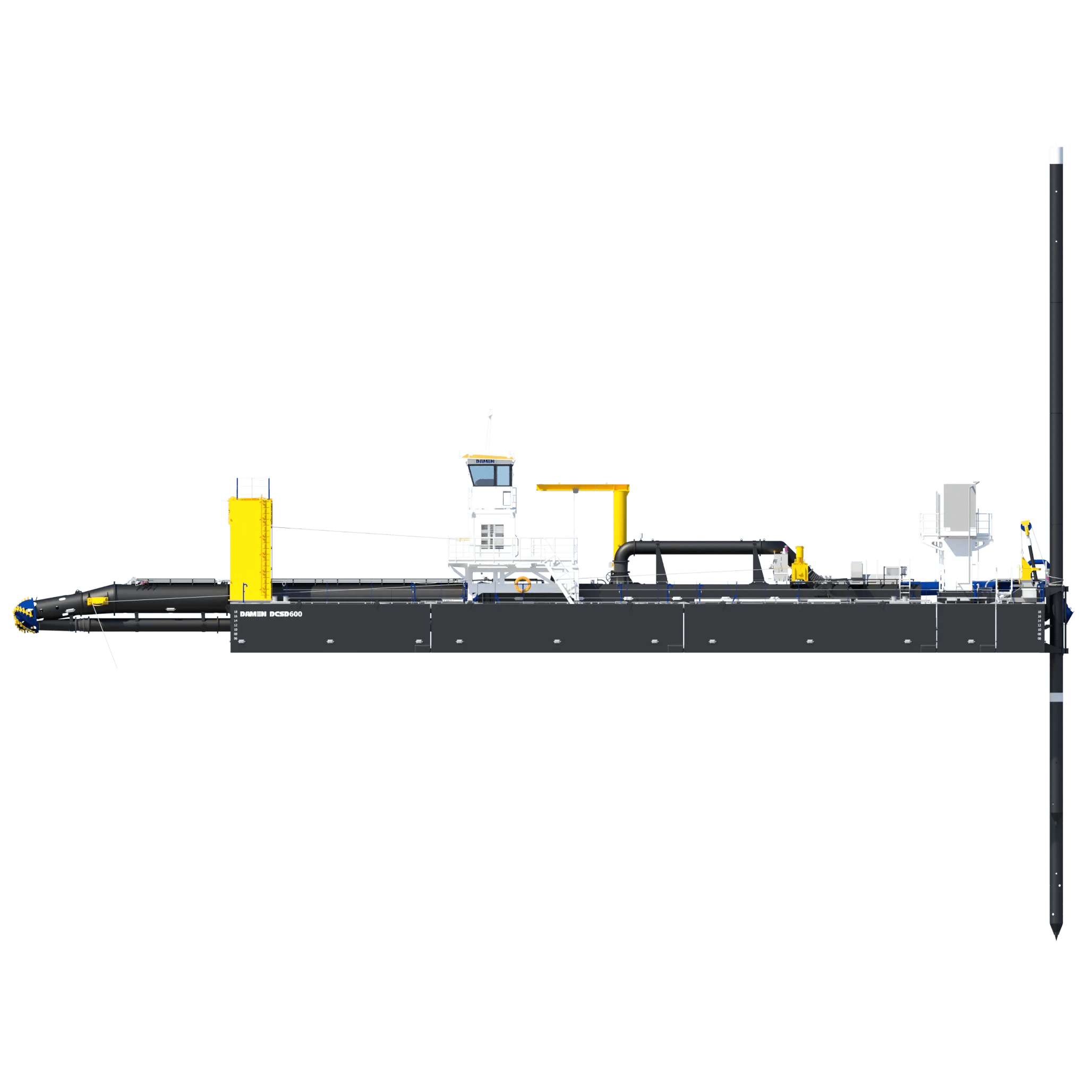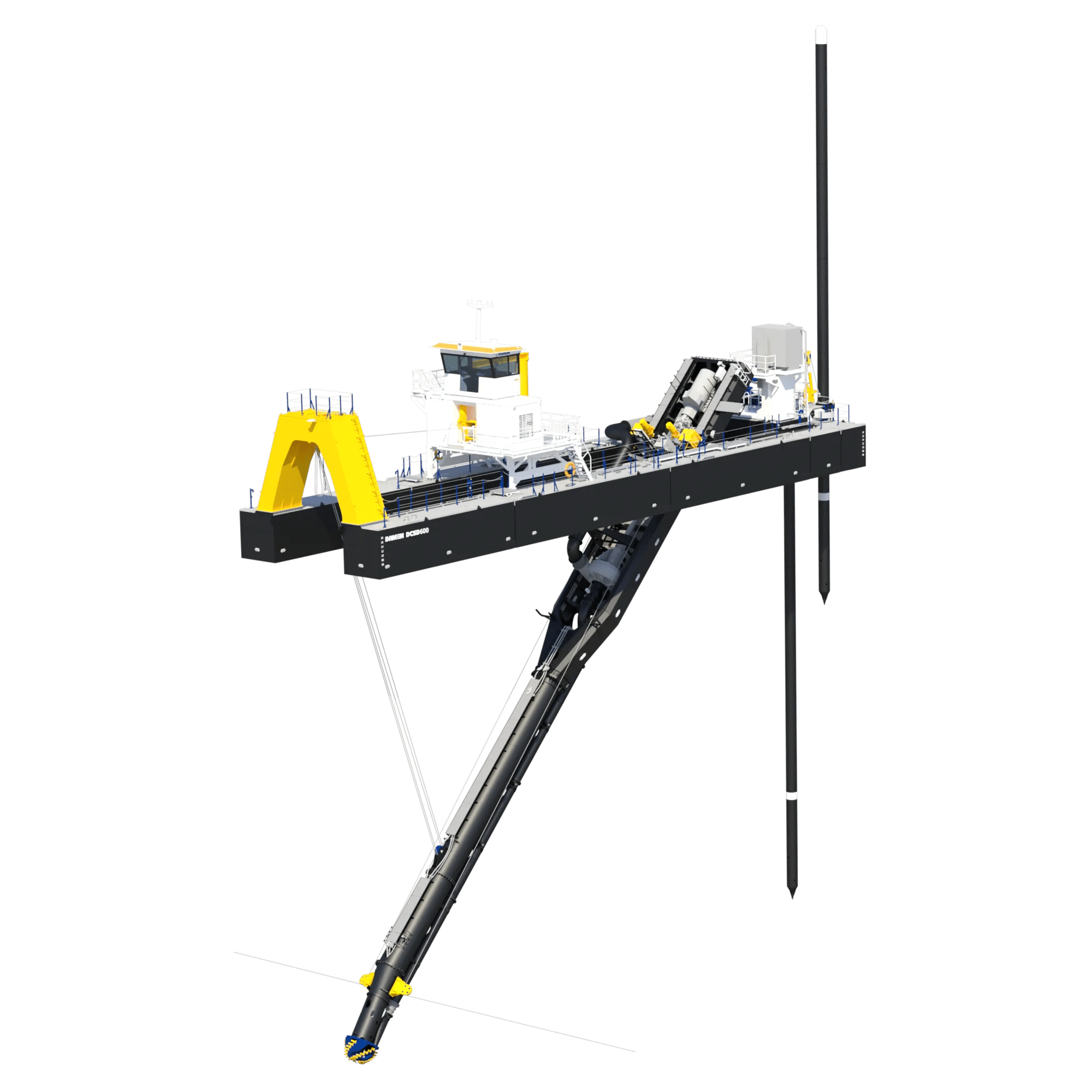 The E-DCSD600 is an electrically driven mining dredger with a submerged dredge pump and a catamaran design. The sand mining dredger, which is powered by an external power source, is available in cutter suction or plain suction configuration. The directly driven submersed dredge pump is integrated in the ladder ensuring high mixture productions. The dismountable design is easily transportable.