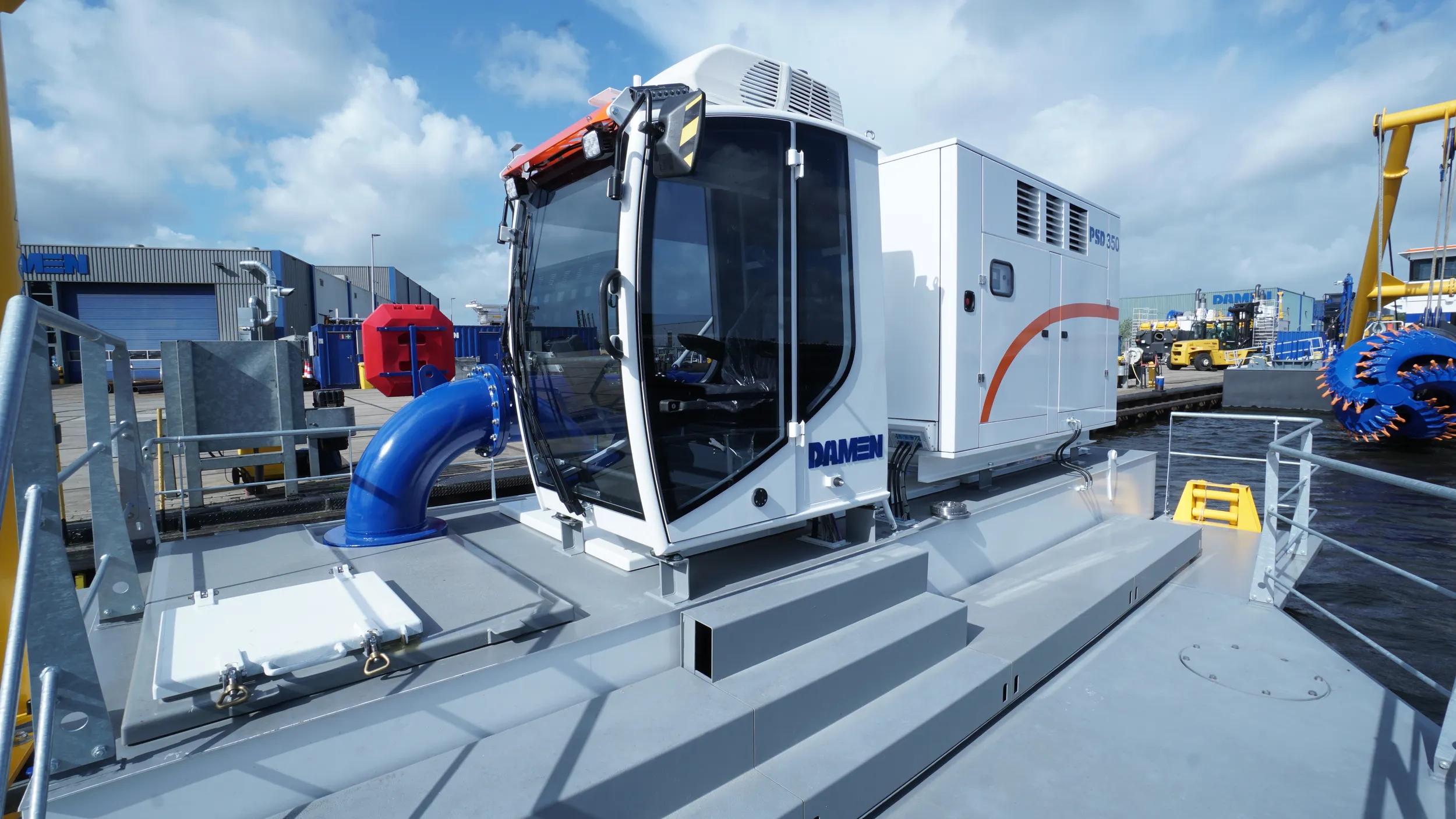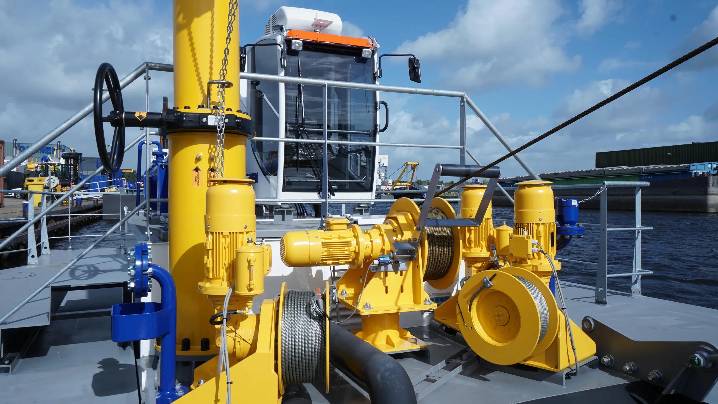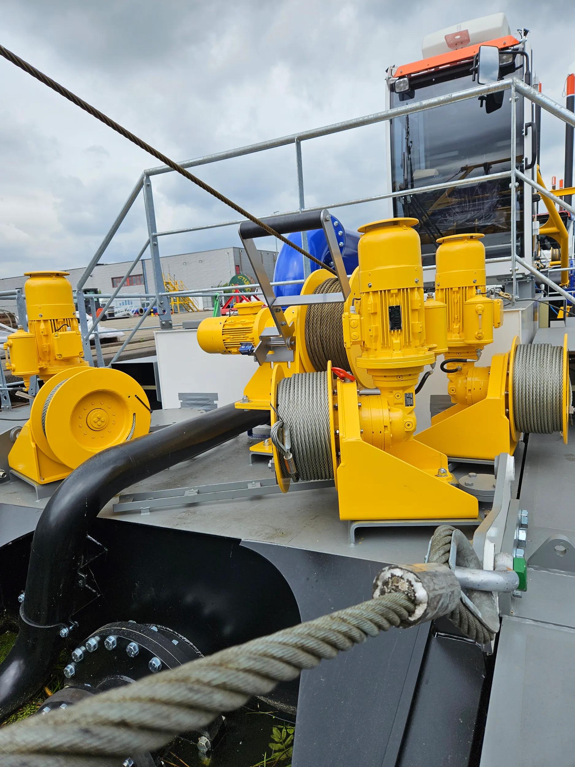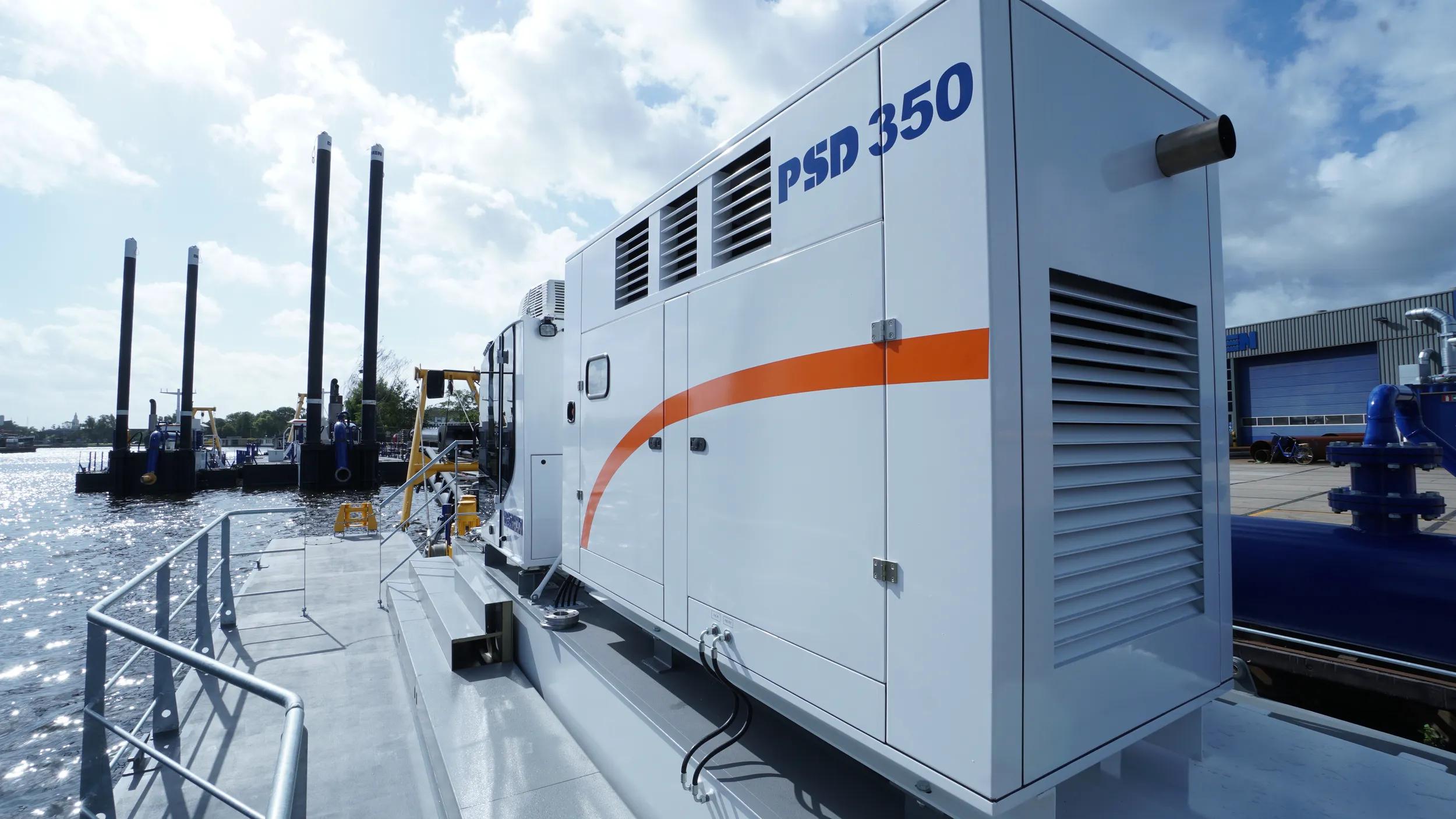 The PSD350 is a compact and straightforward plain suction dredger operated by one single operator. Its low-maintenance design features an in-board dredge pump and a high pressure jet water system for the specially designed plain suction head. The dismountable sand dredger is easily transportable in only three 40’ open top containers and reassembly is practical due to the limited unit weight and the easy coupling system. The mining dredger is anchored and repositioned using three electric manoeuvring winches.