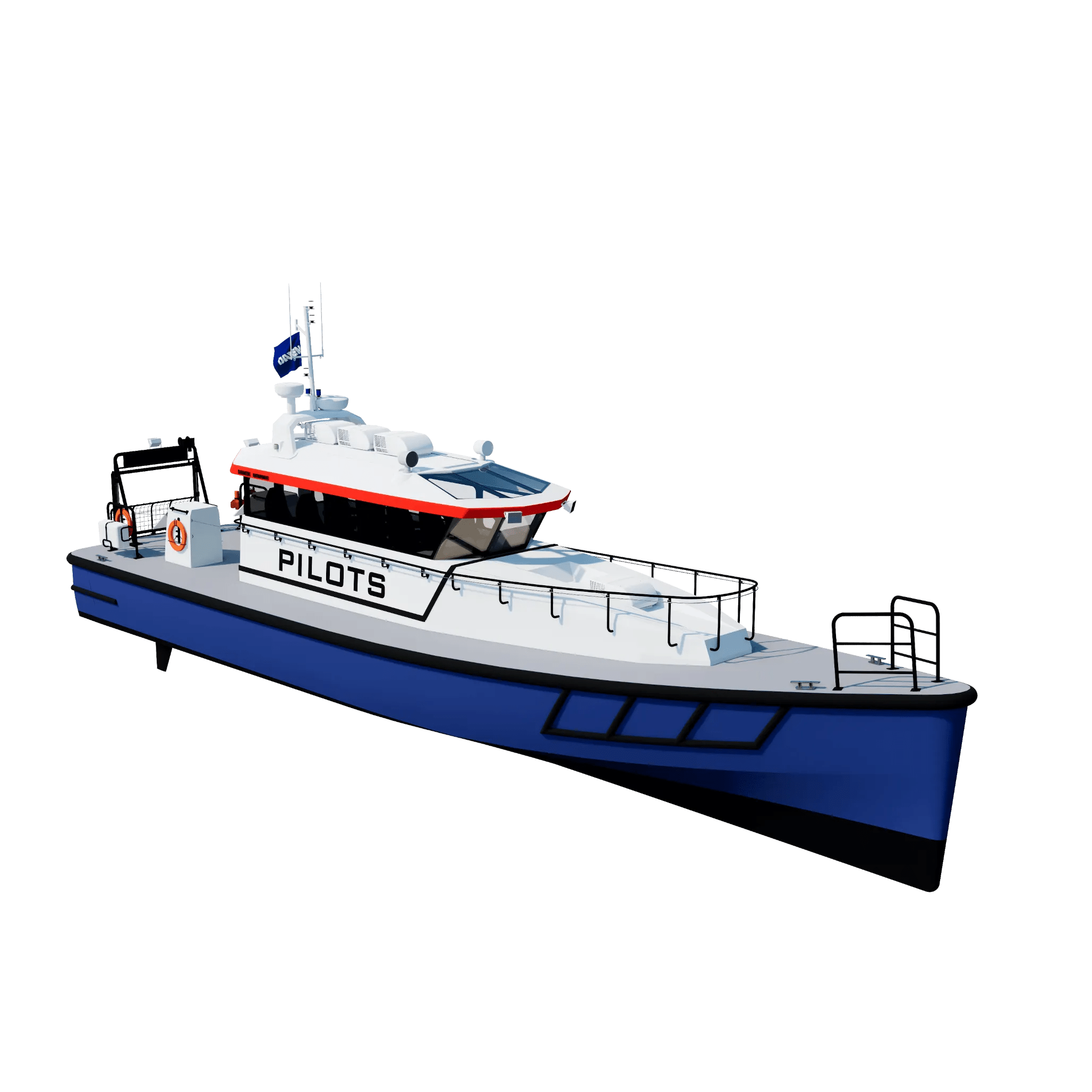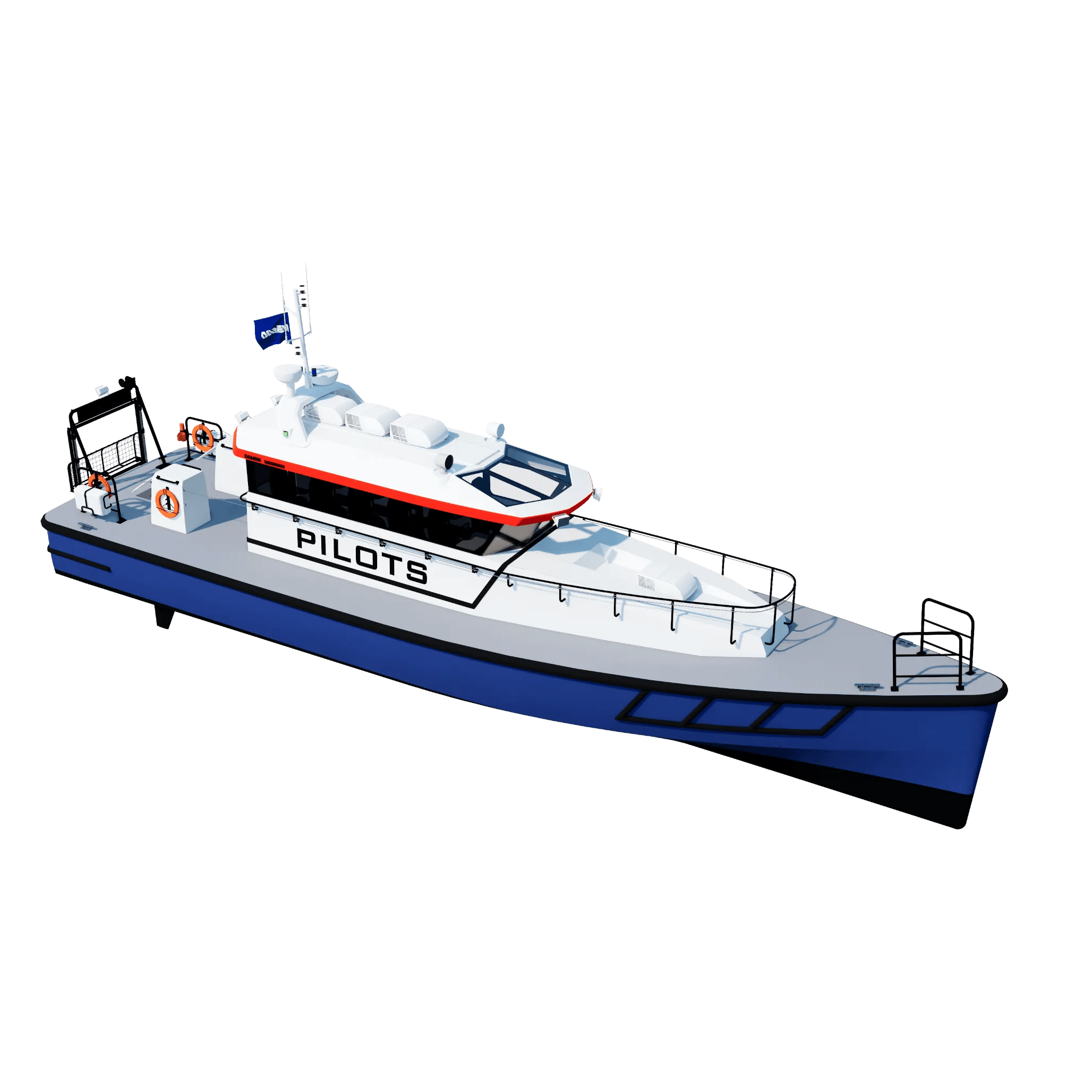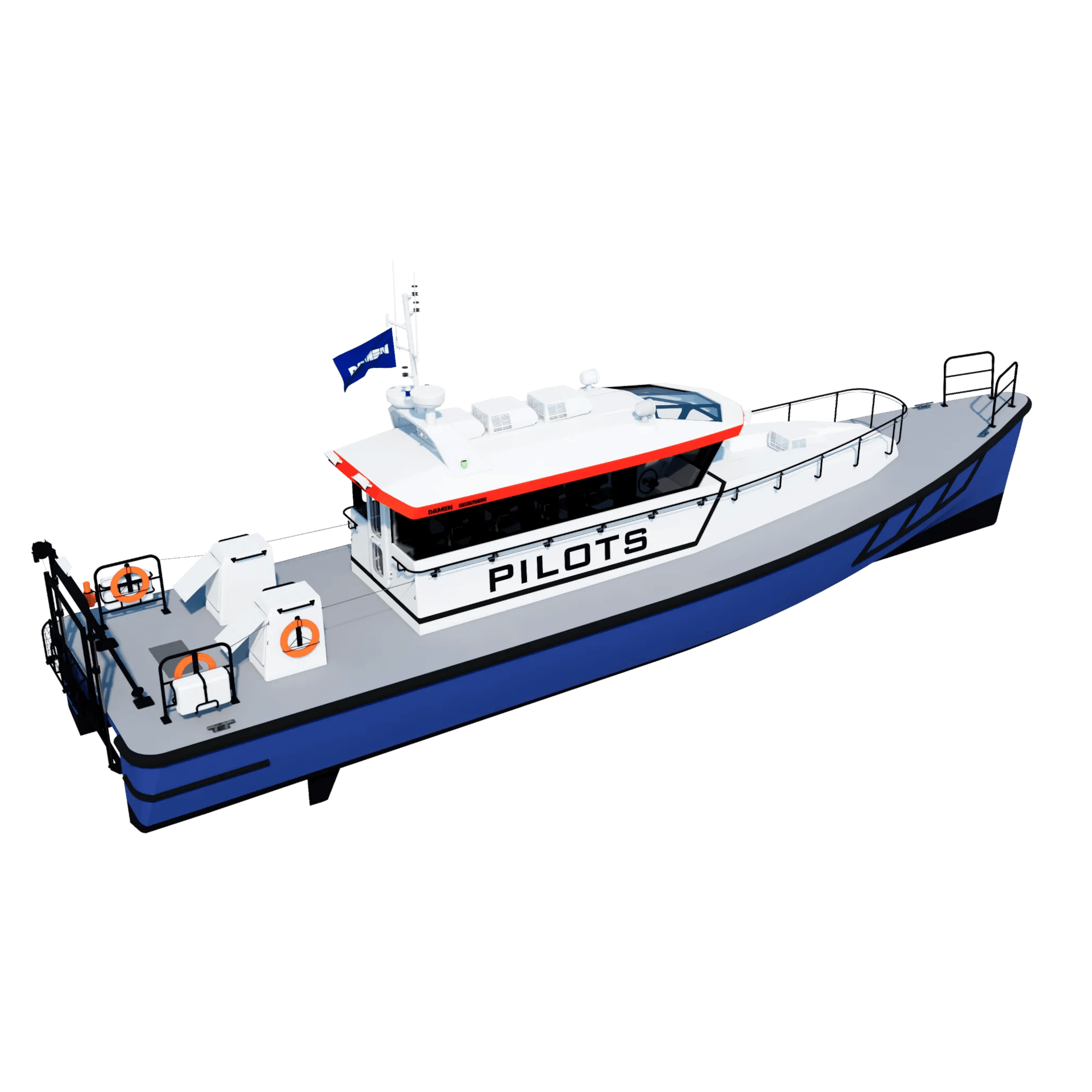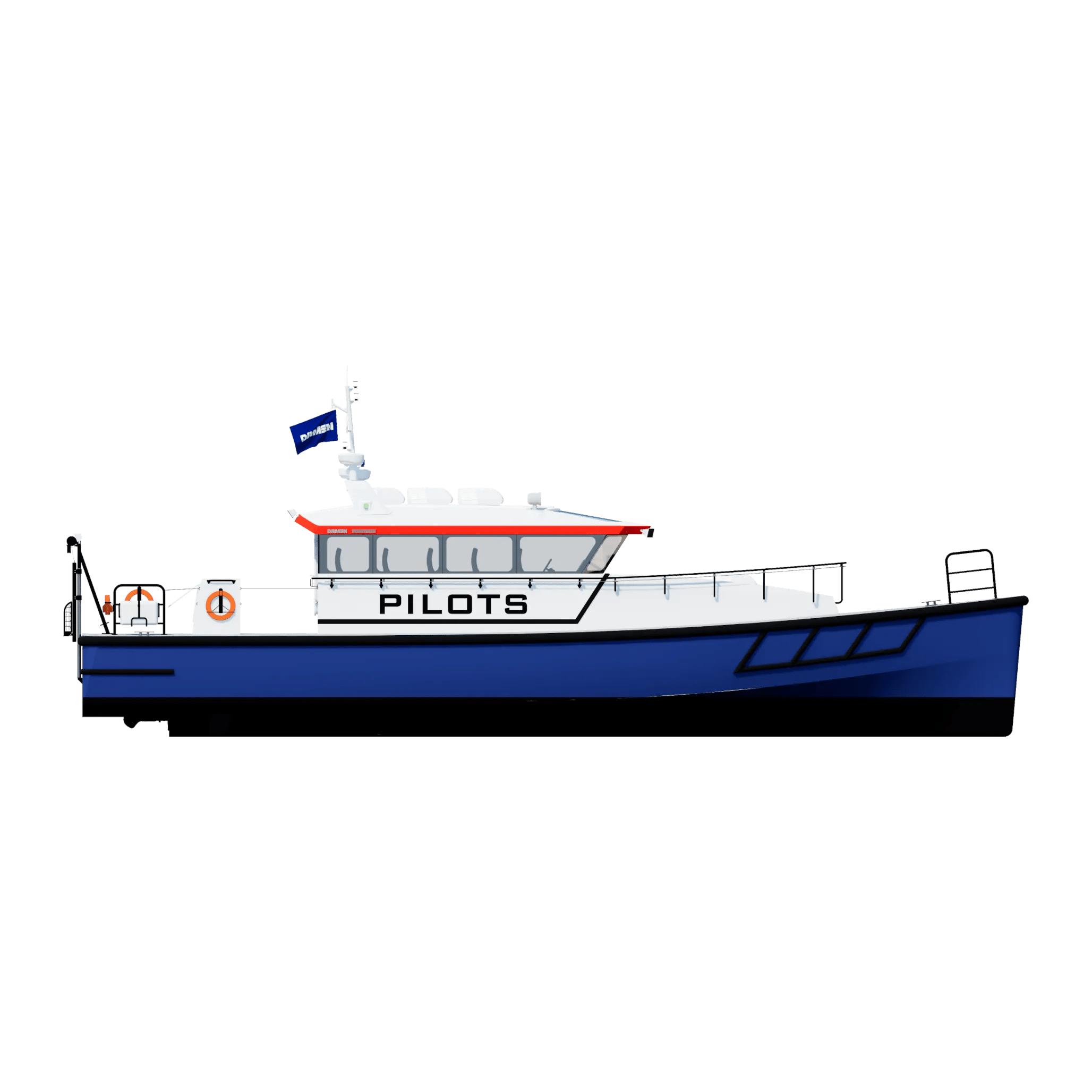 The Damen Stan Pilot 1905 is a modern vessel of proven, standard design built of aluminium and featuring a modified Axe Bow for excellent seakeeping. Its use of high quality components ensures outstanding performance and low maintenance. Safety is optimised via a 360-degree view from the wheelhouse and large deck for safe boarding. The vessel is propelled by waterjets driven by diesel engines.